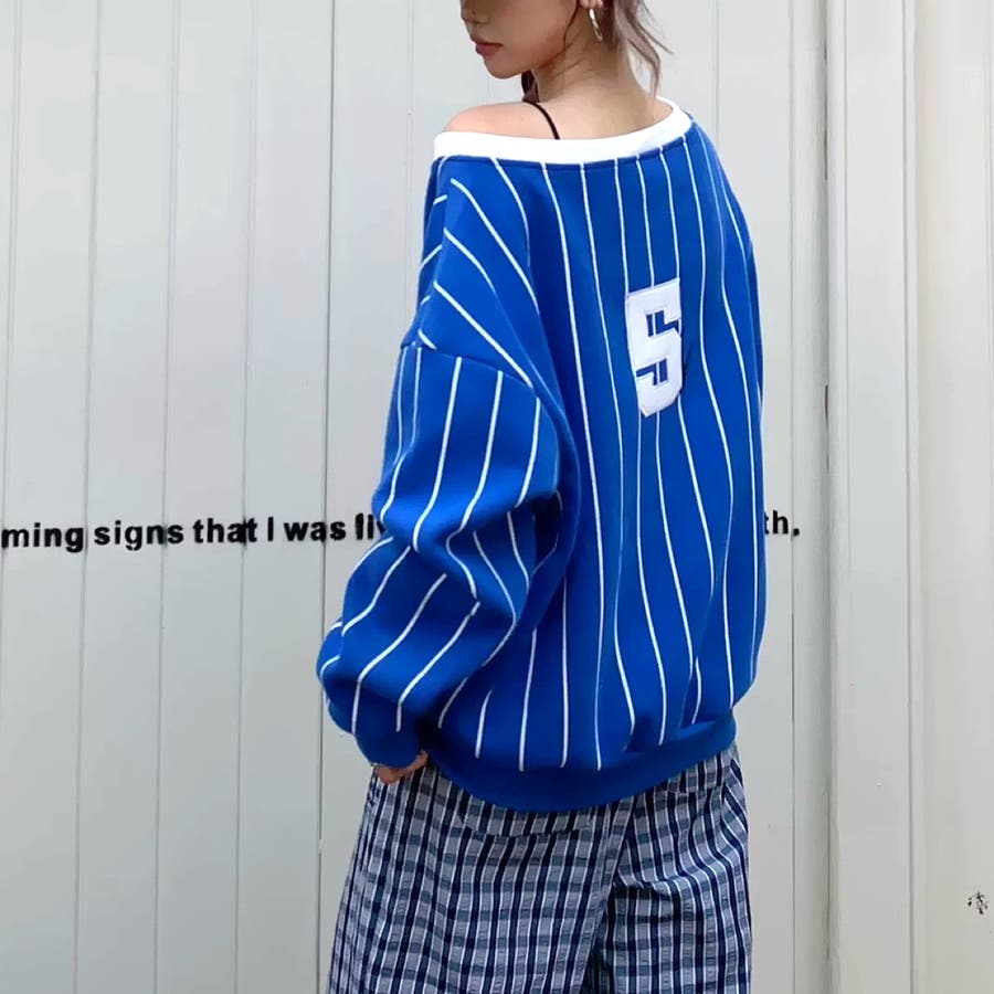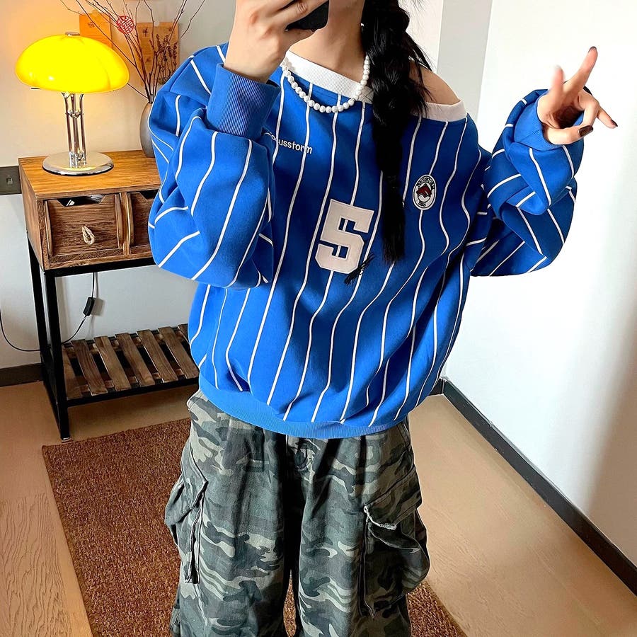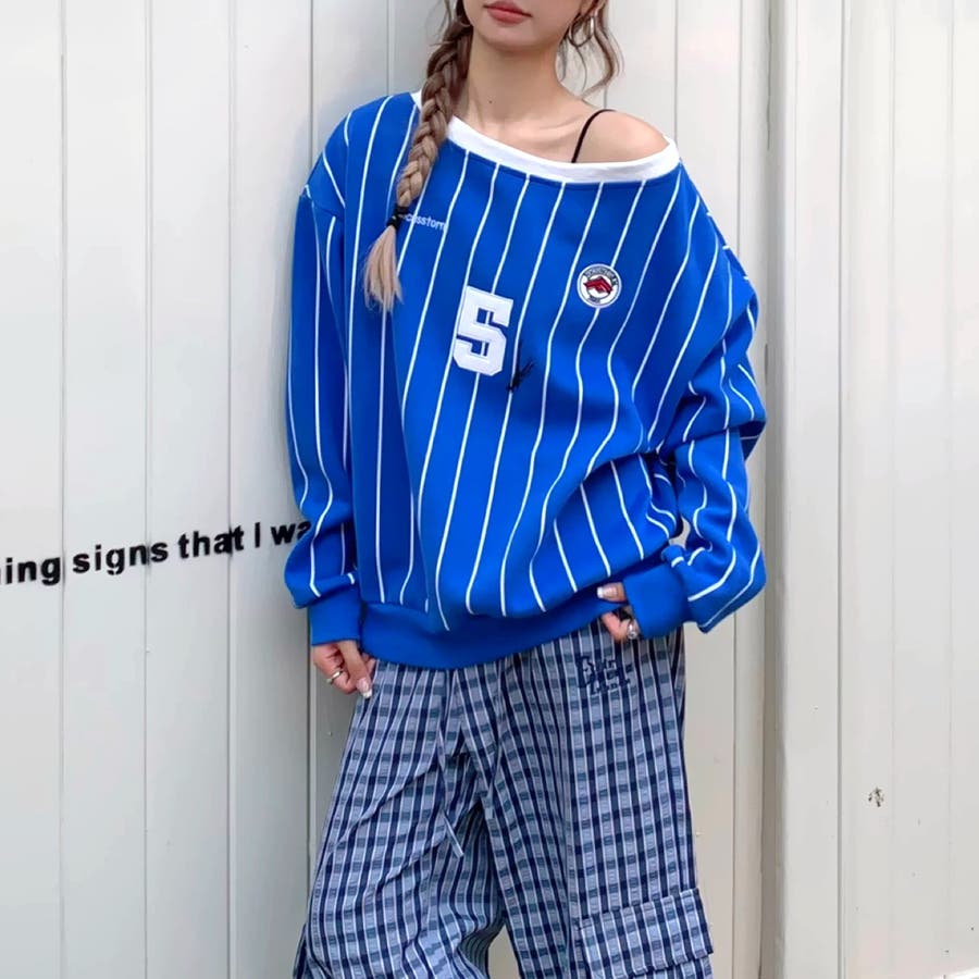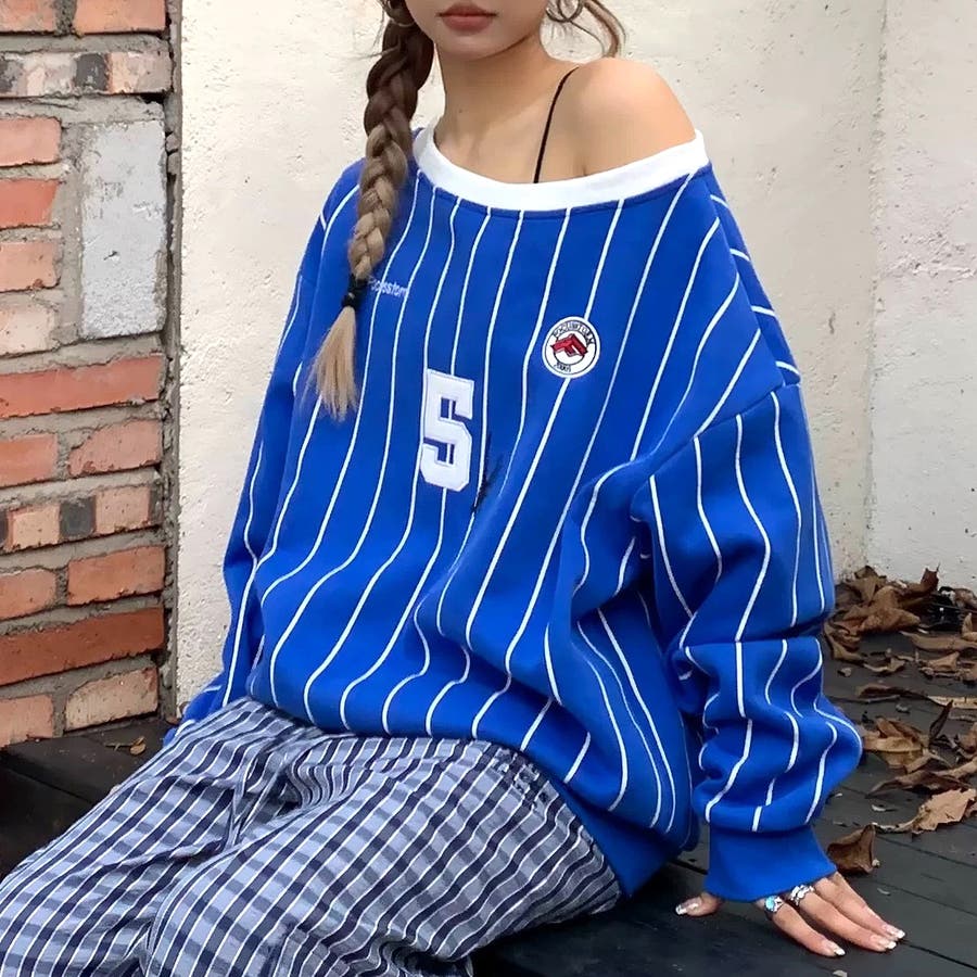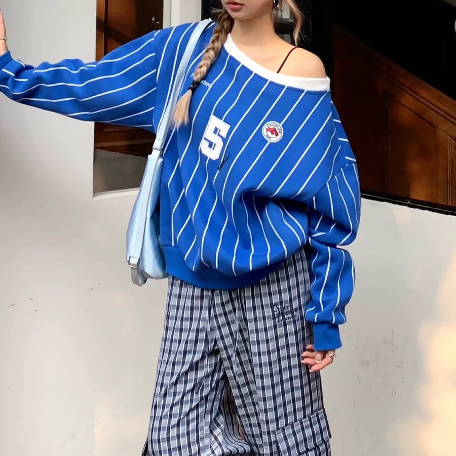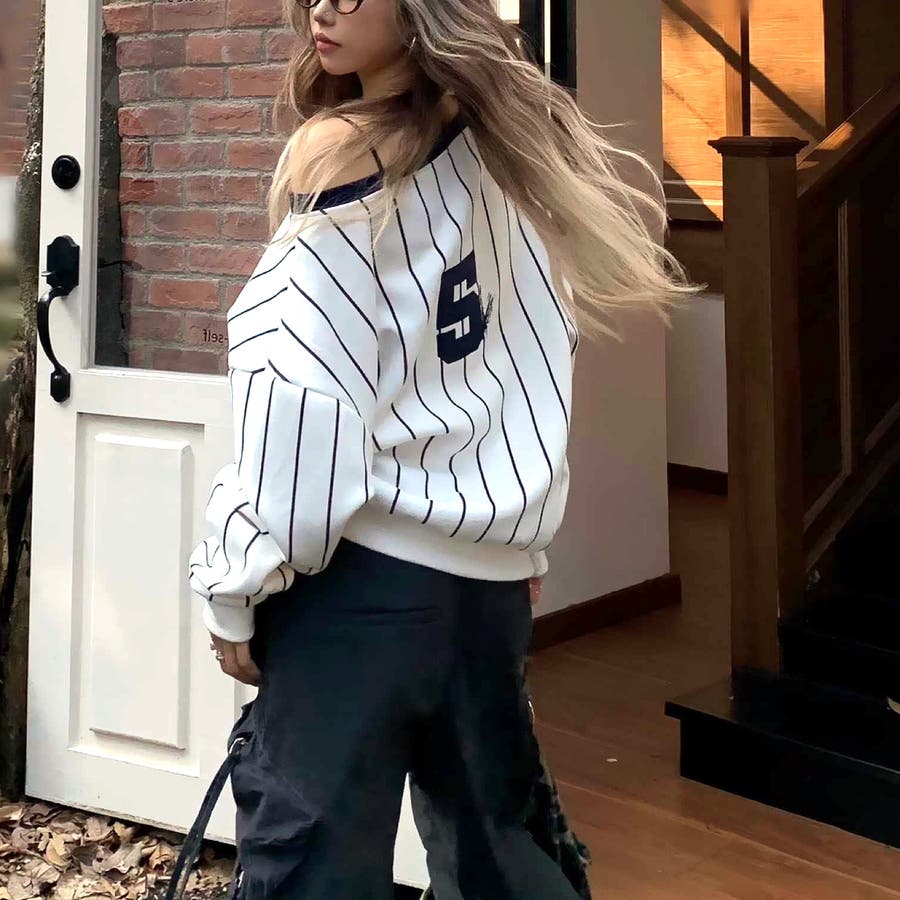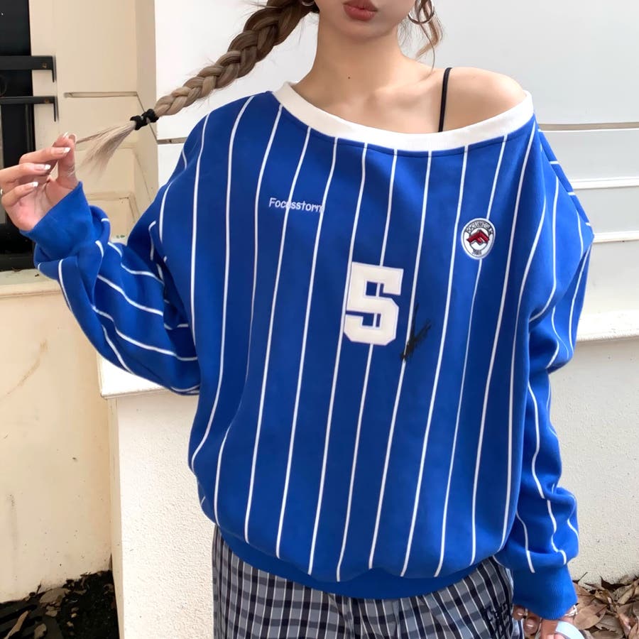 ピンストライプワンショルダーゲームシャツトレーナー 春 秋