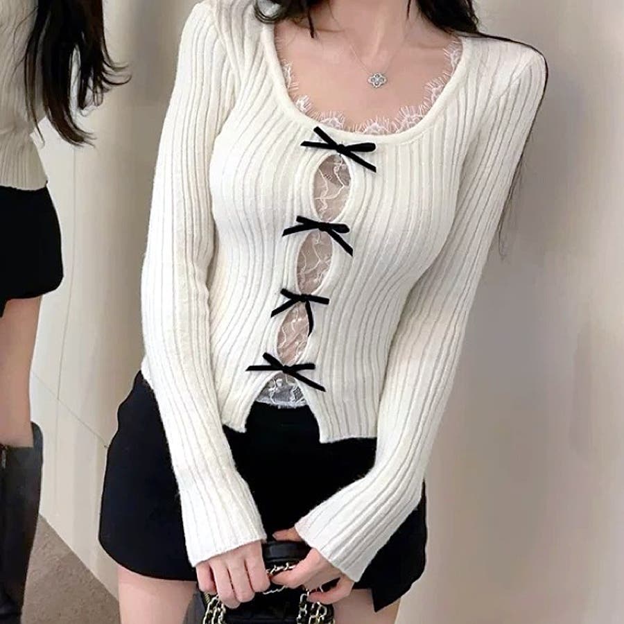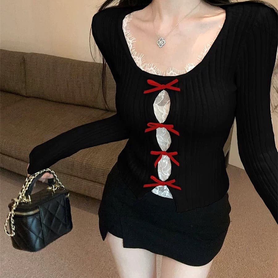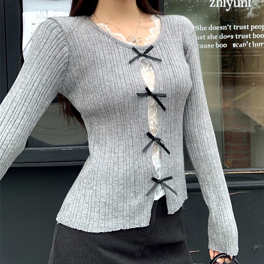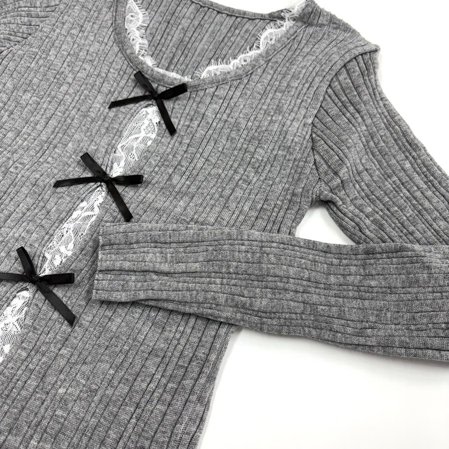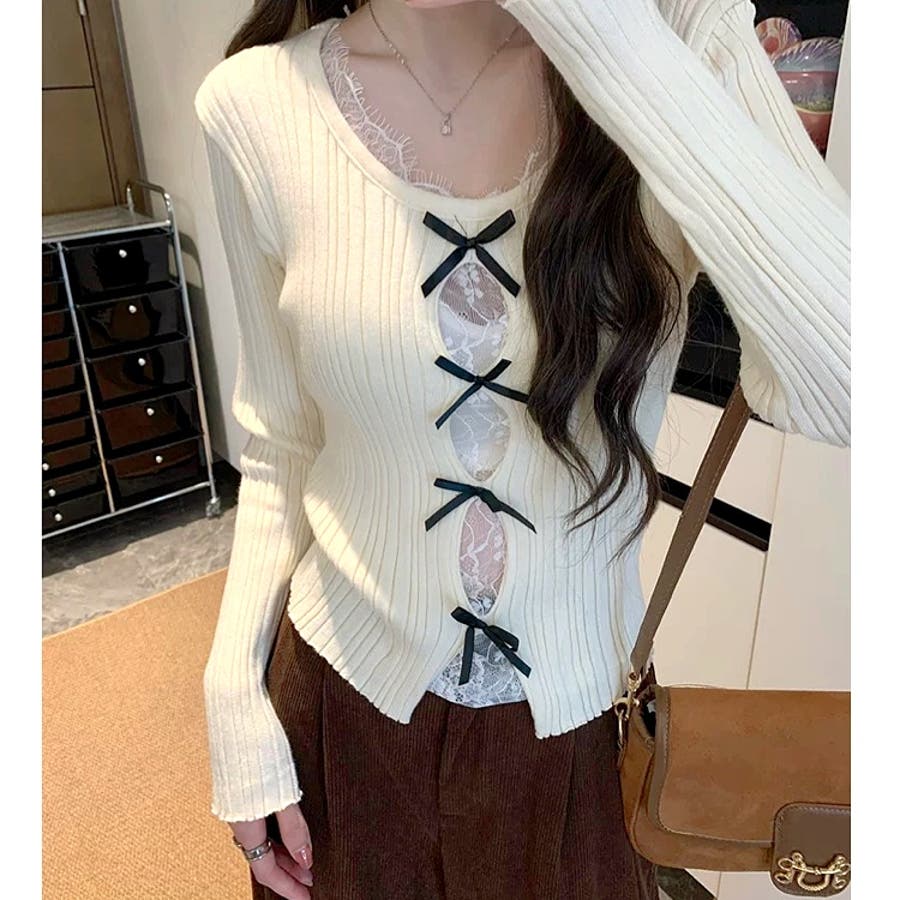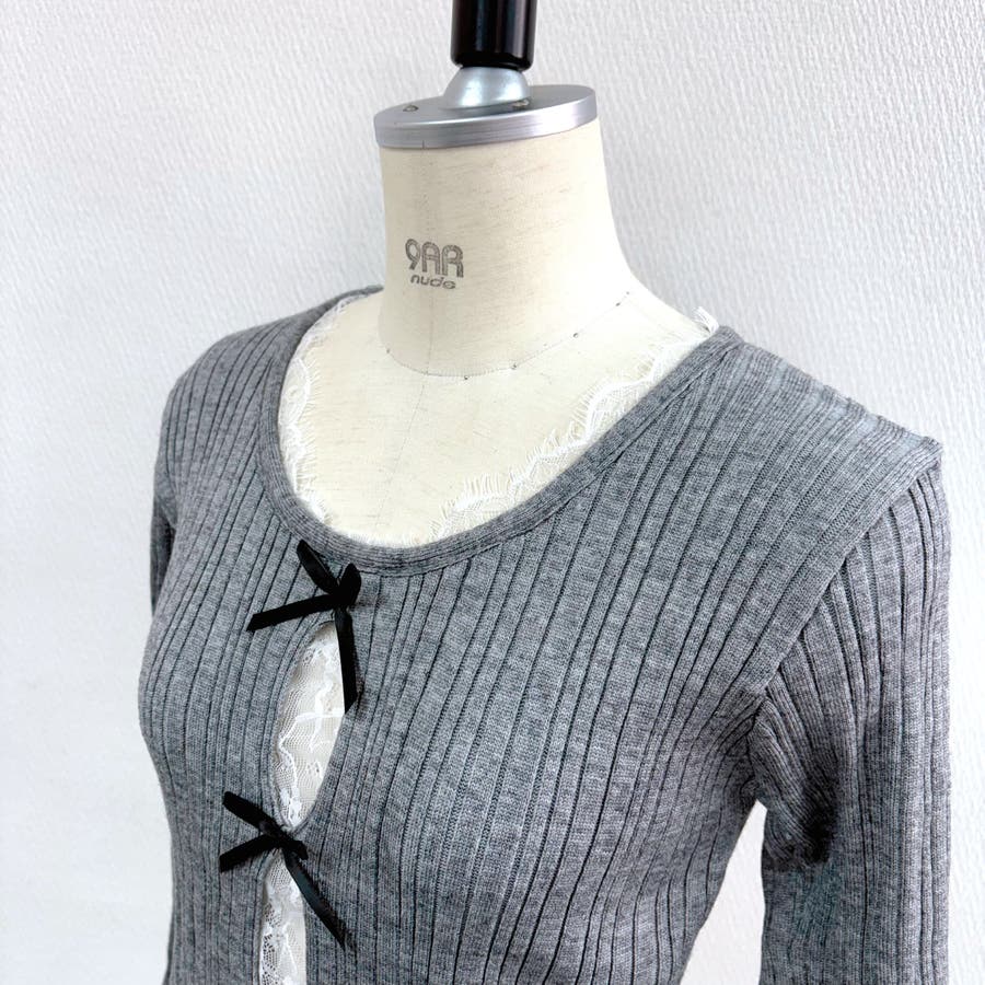 レースレイヤードリボンリブニットトップス 春 秋