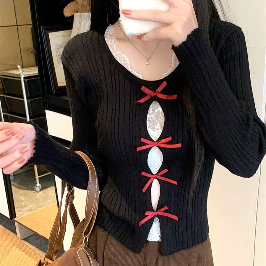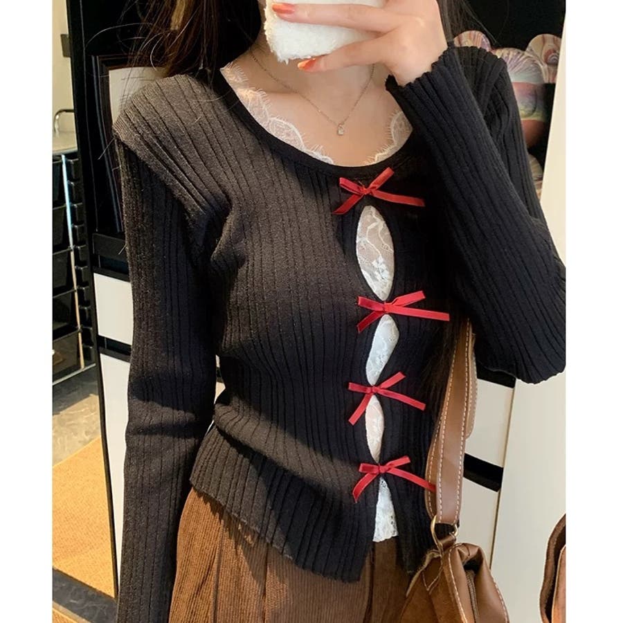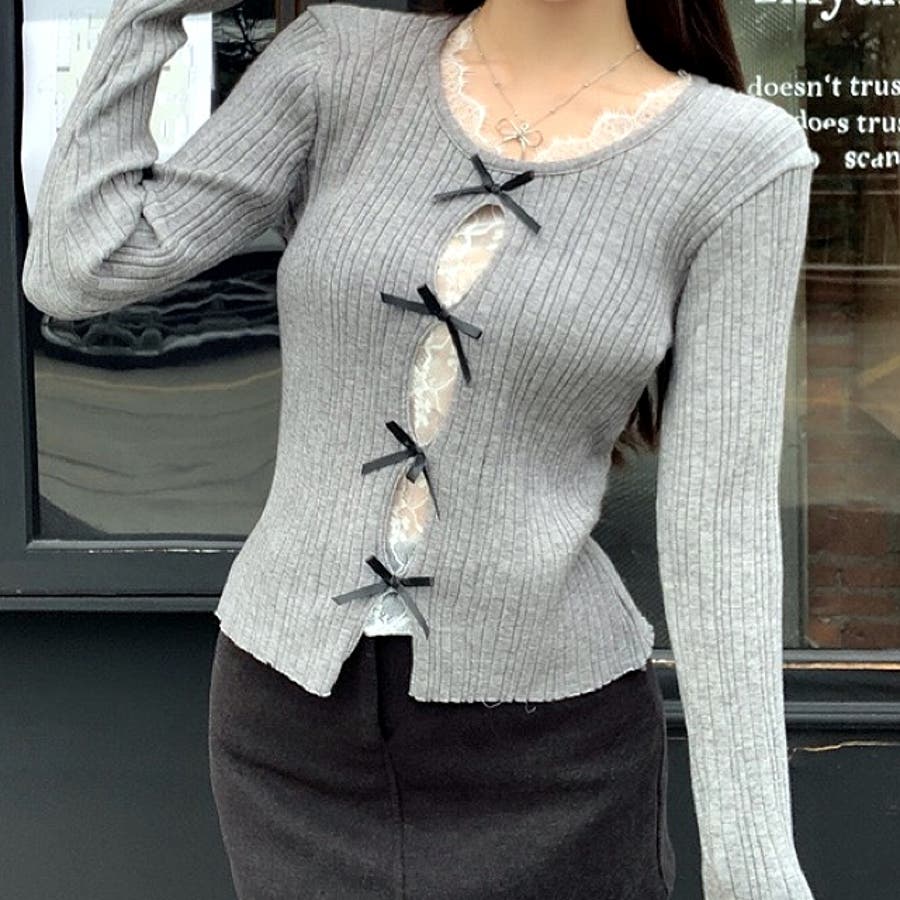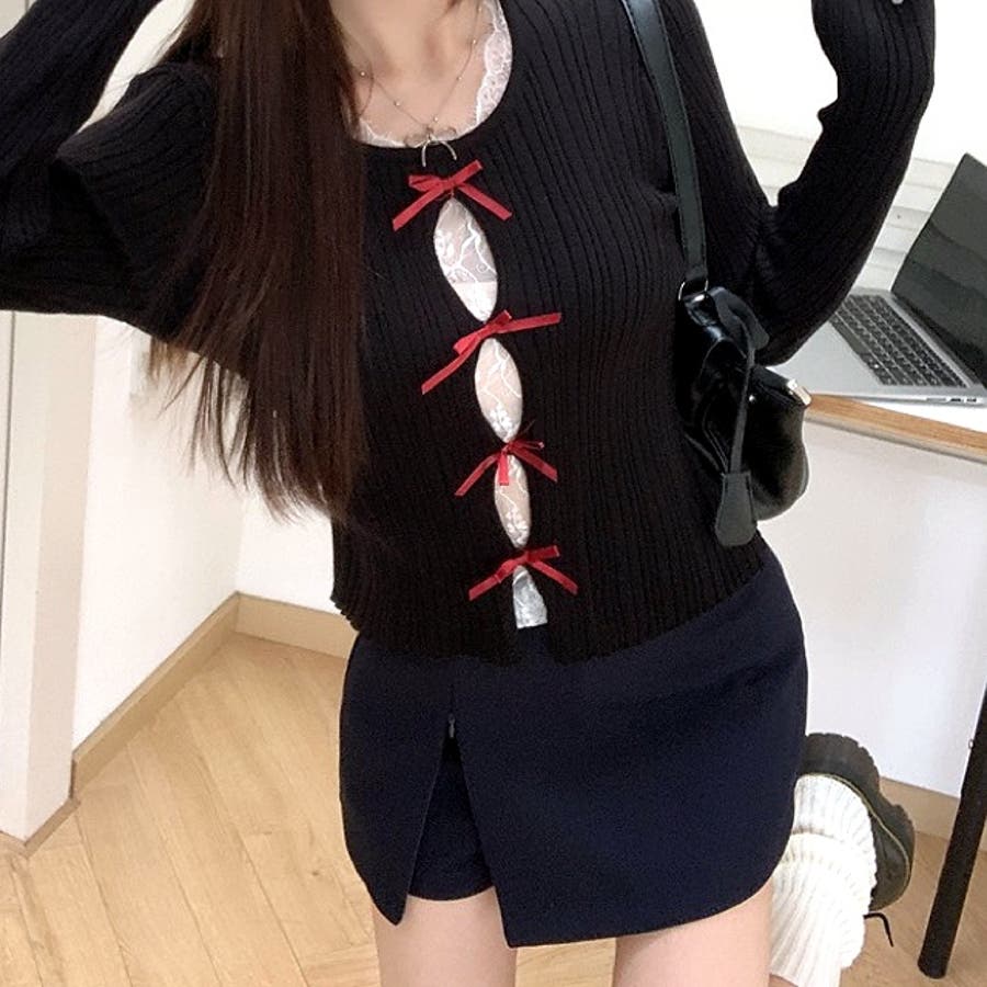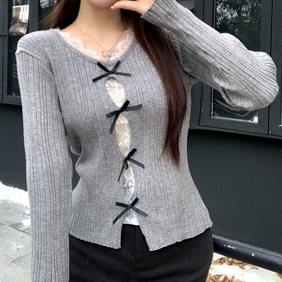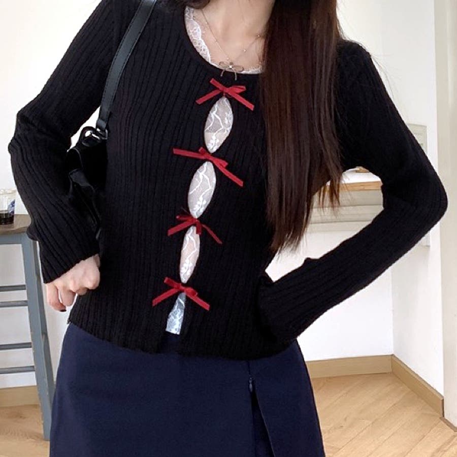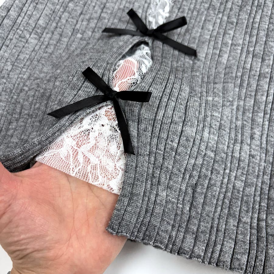 レースレイヤードリボンリブニットトップス 春 秋