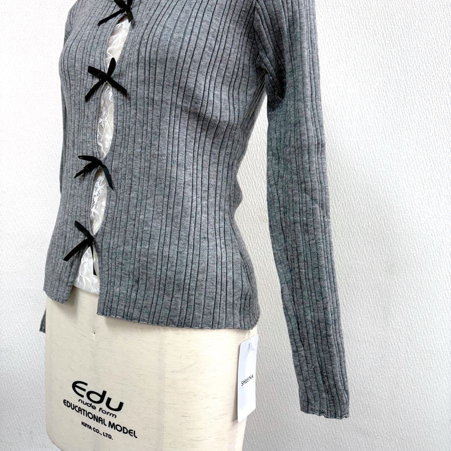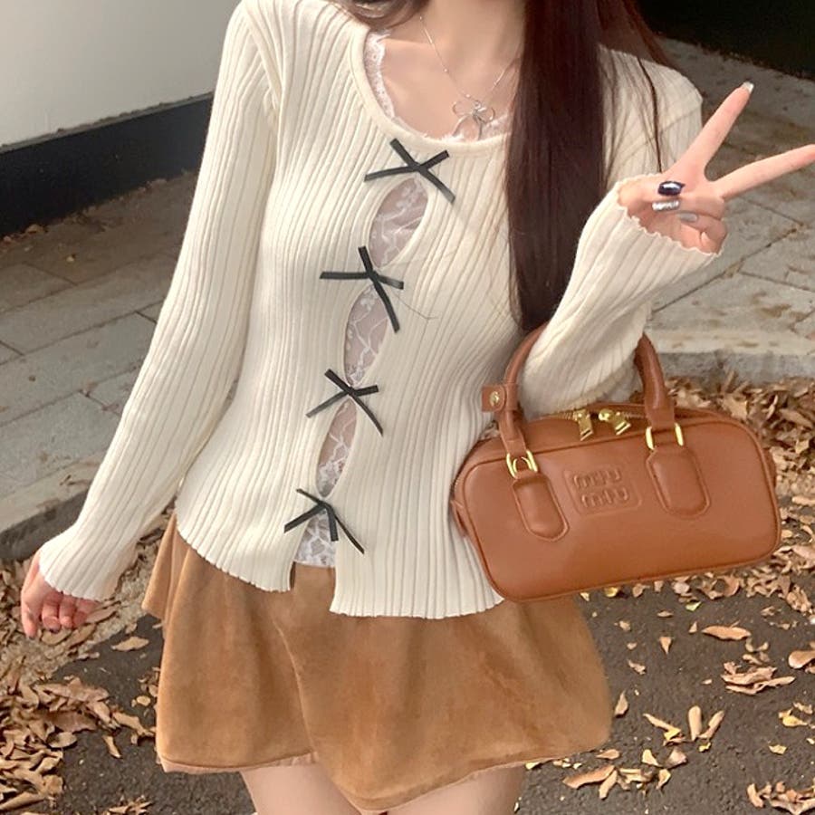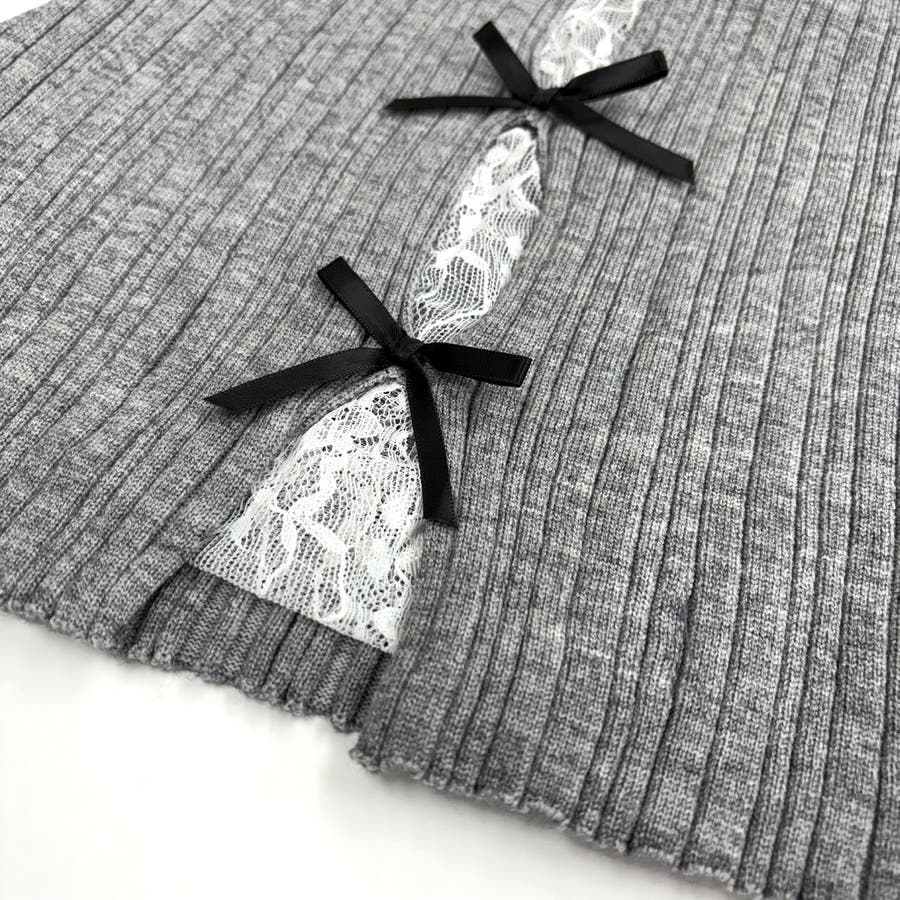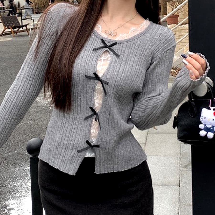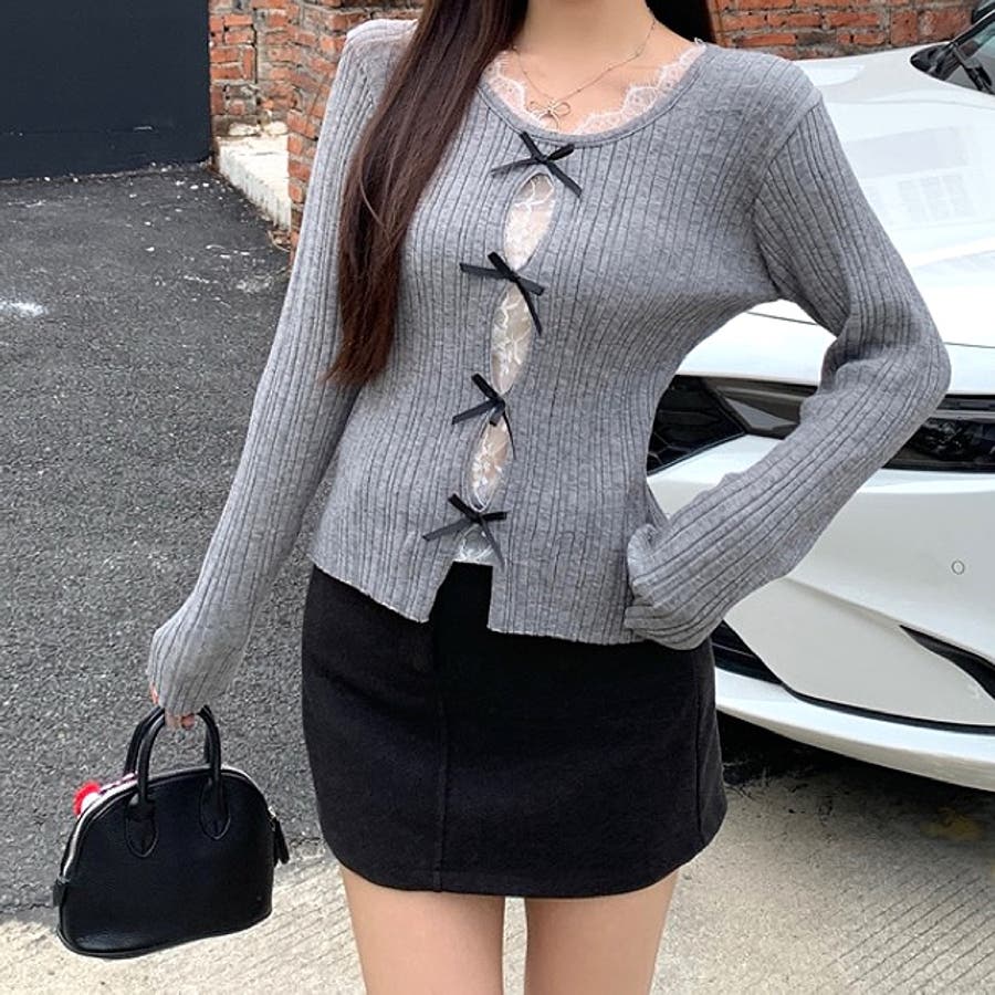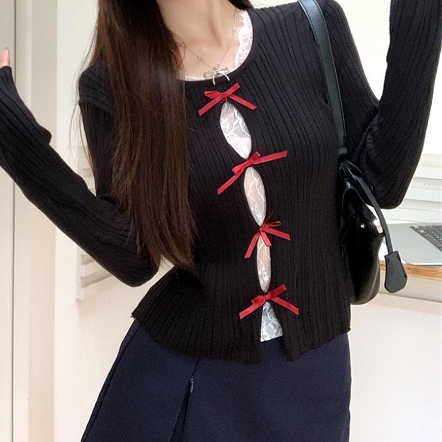レースレイヤードリボンリブニットトップス 春 秋
