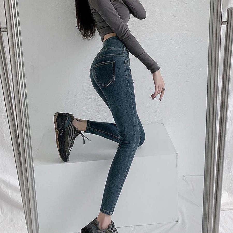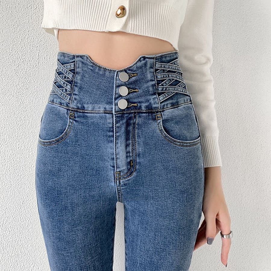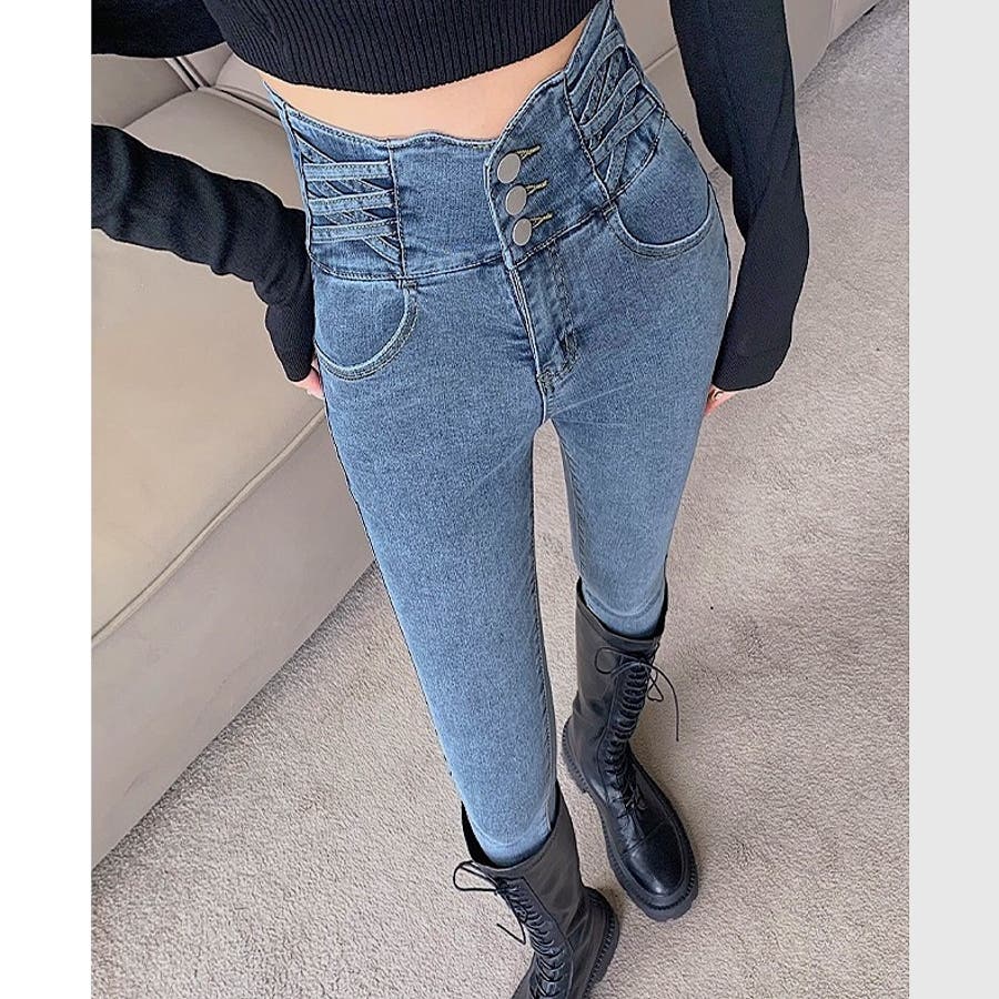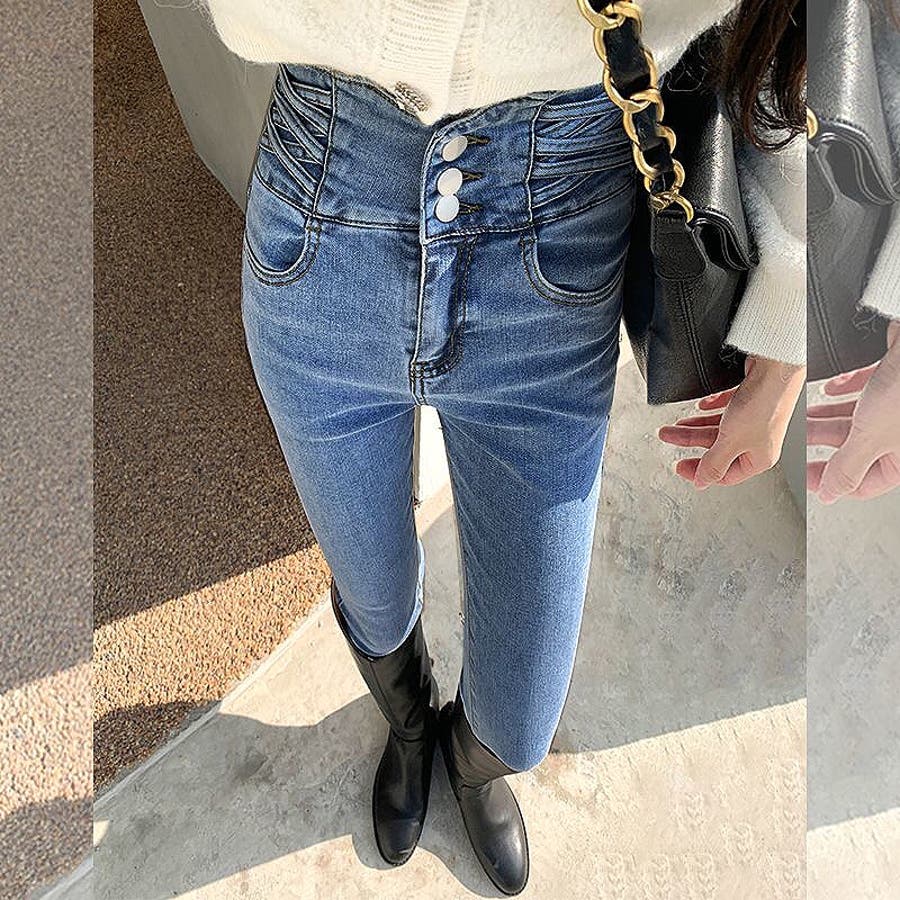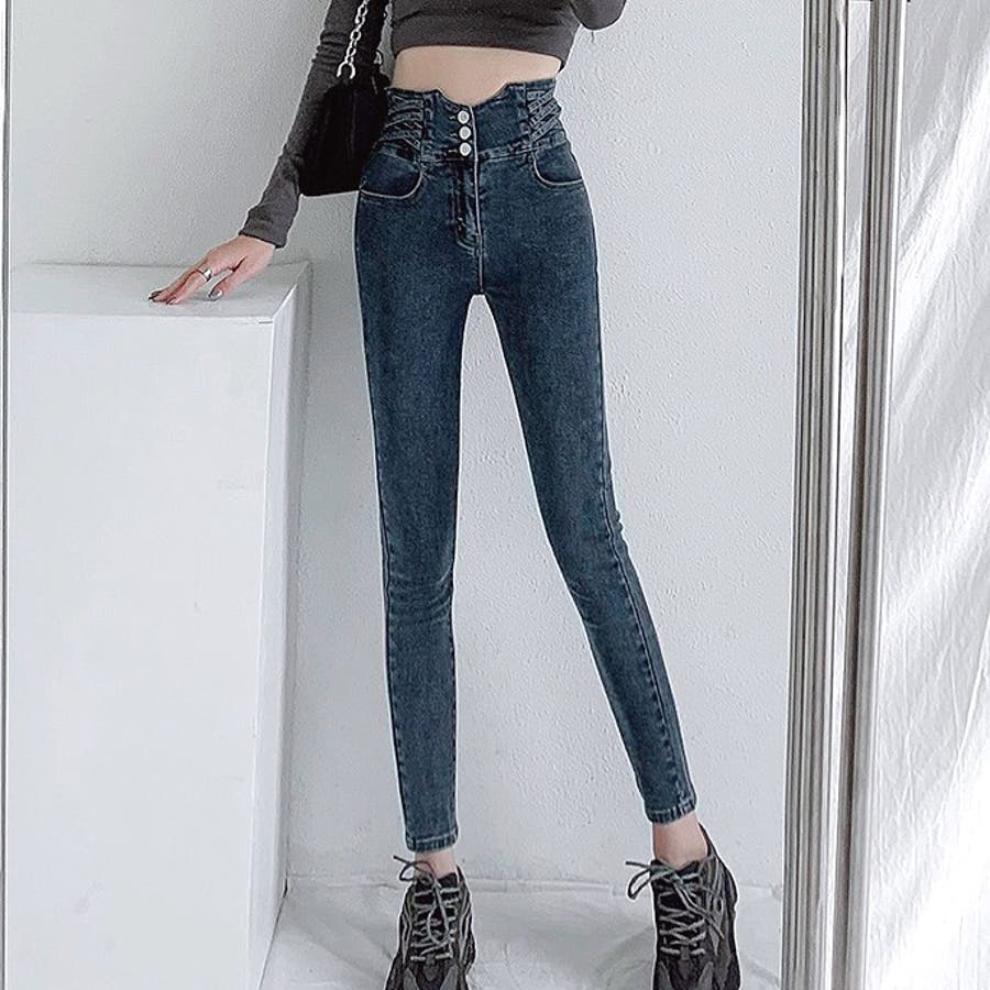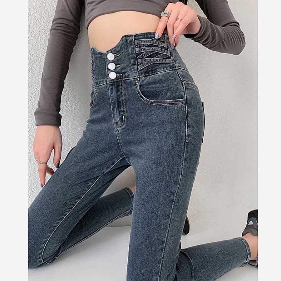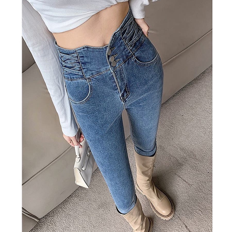 ハイウエストクロスループストレッチデニムスキニーパンツ 春 夏