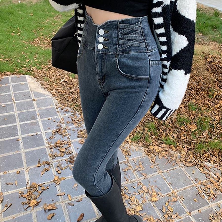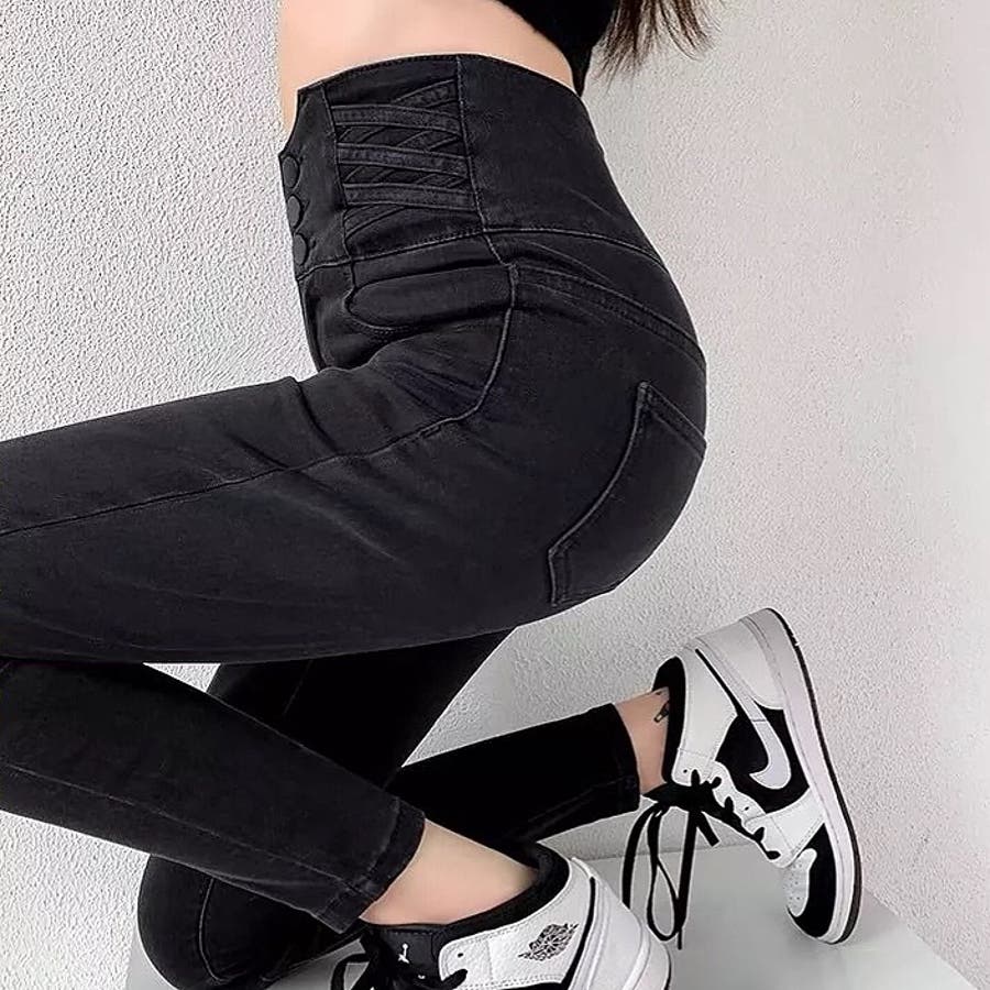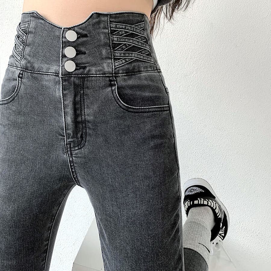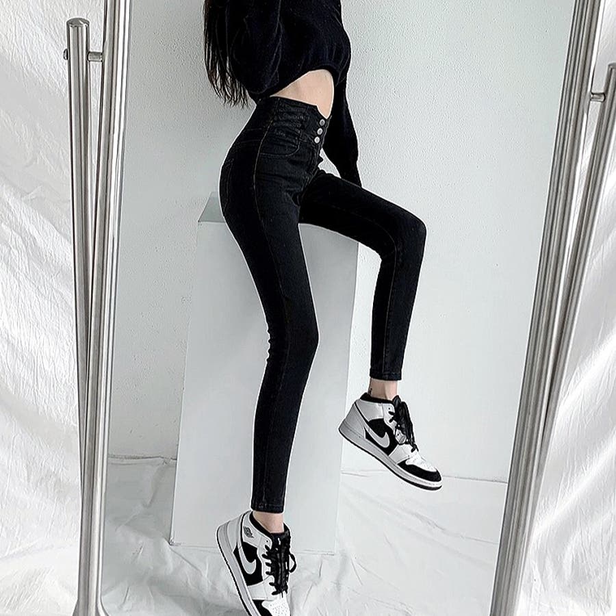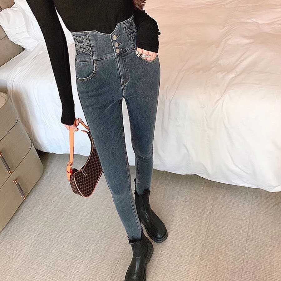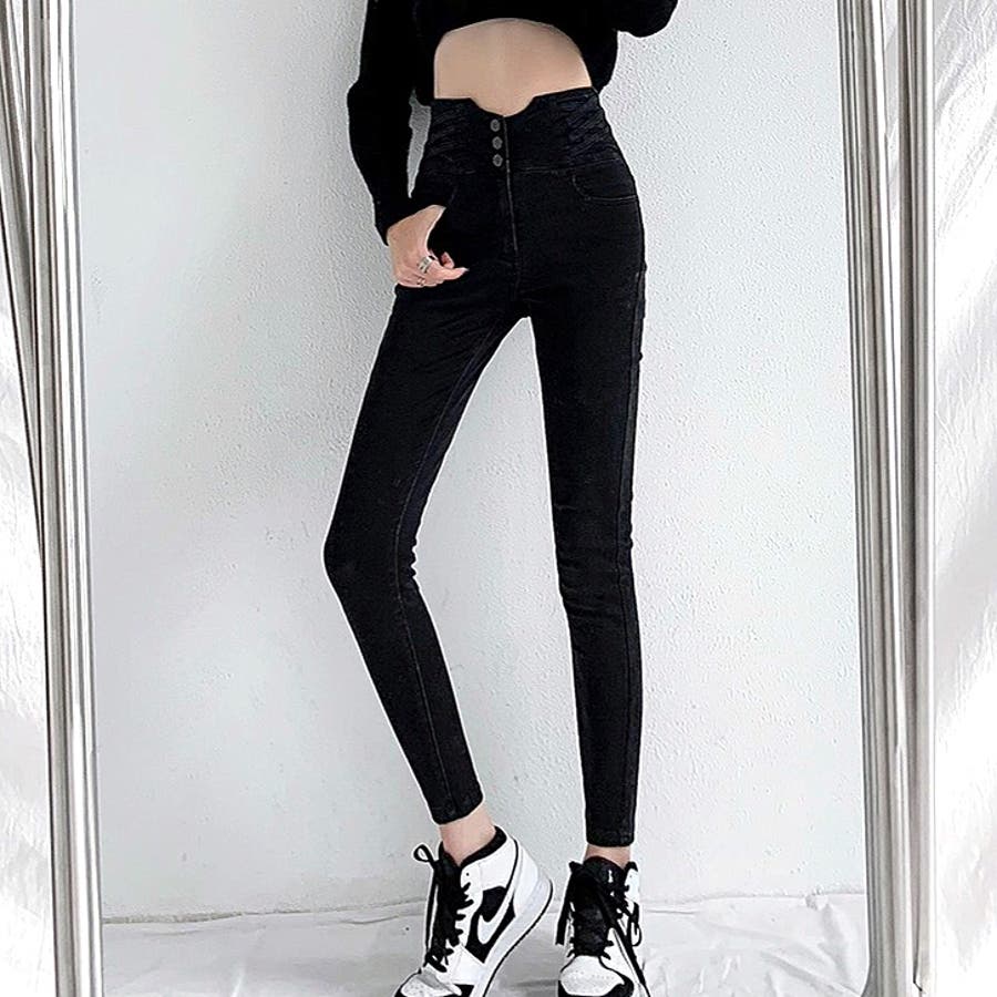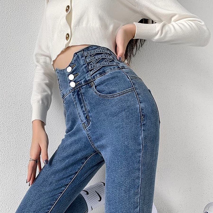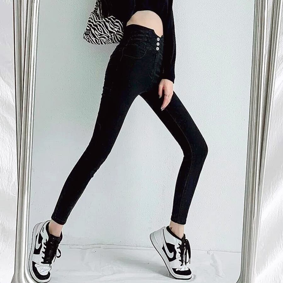ハイウエストクロスループストレッチデニムスキニーパンツ 春 夏