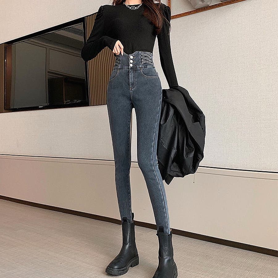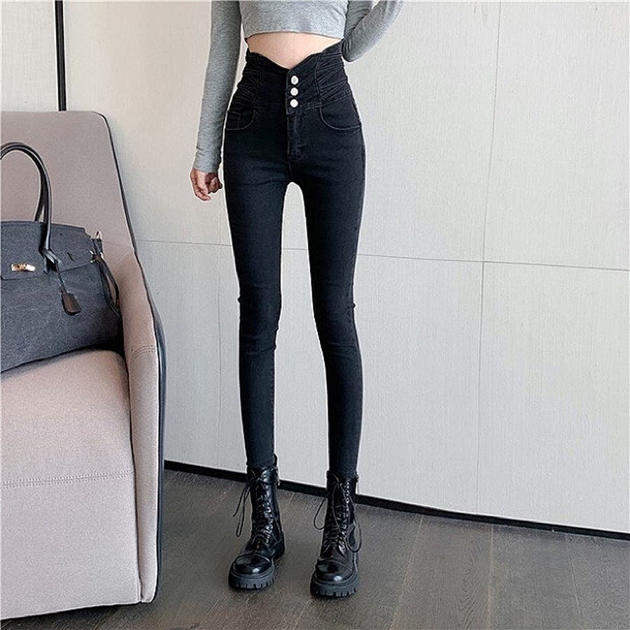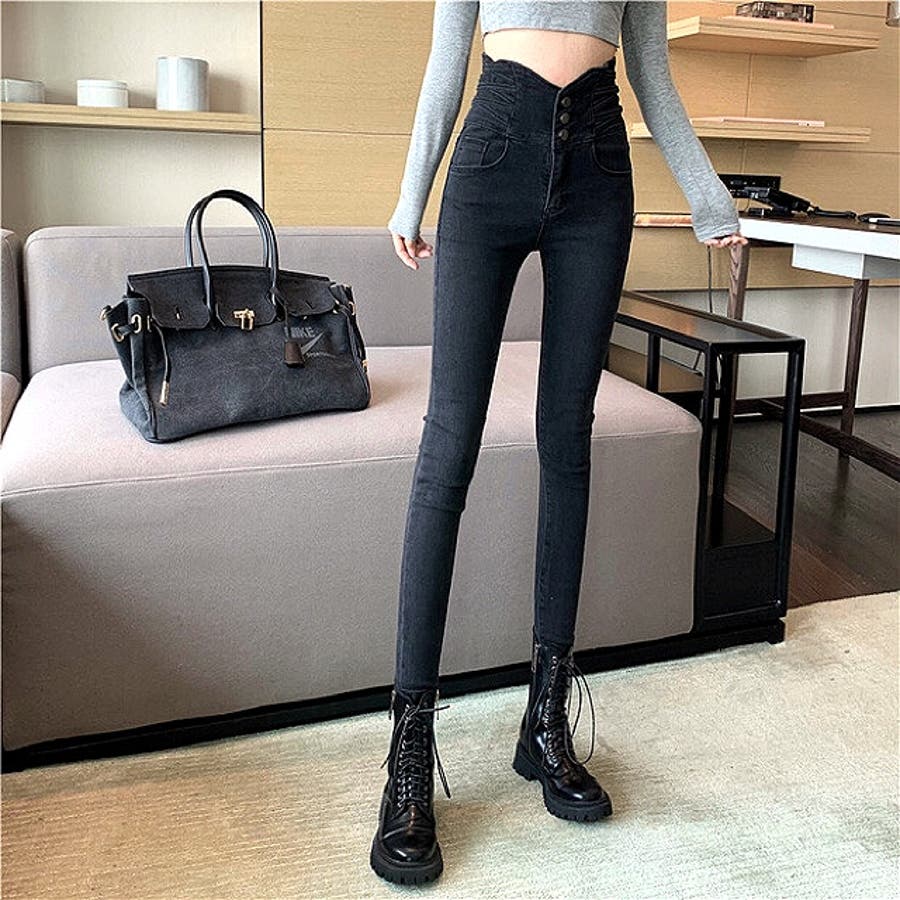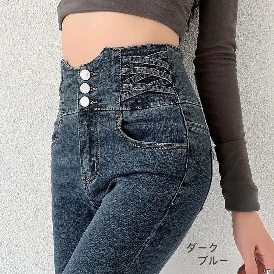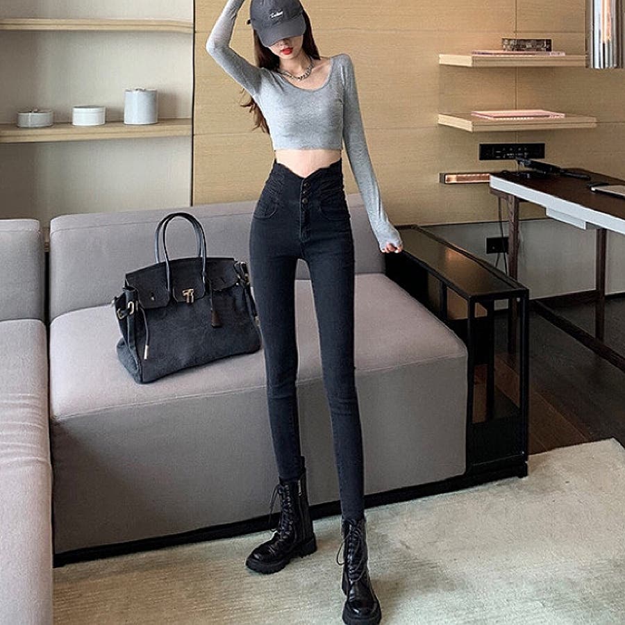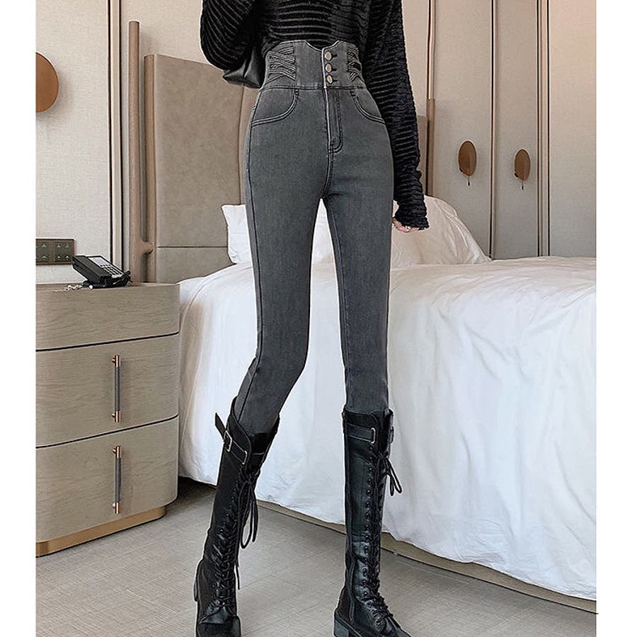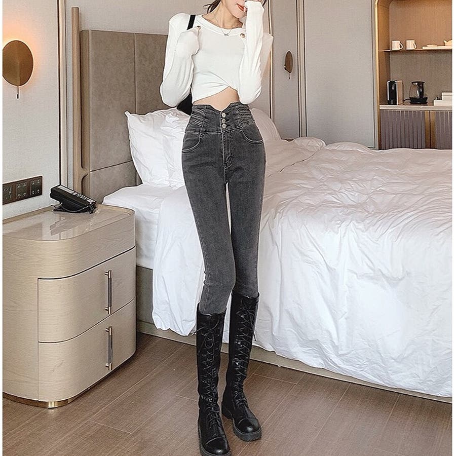 ハイウエストクロスループストレッチデニムスキニーパンツ 春 夏