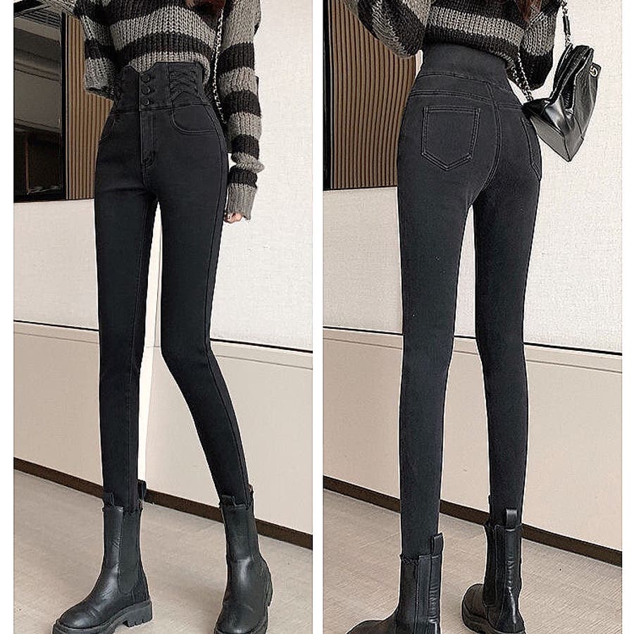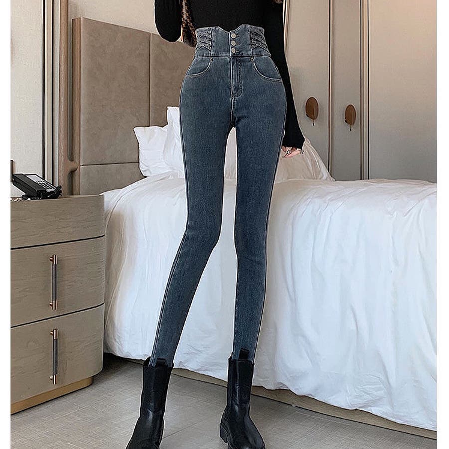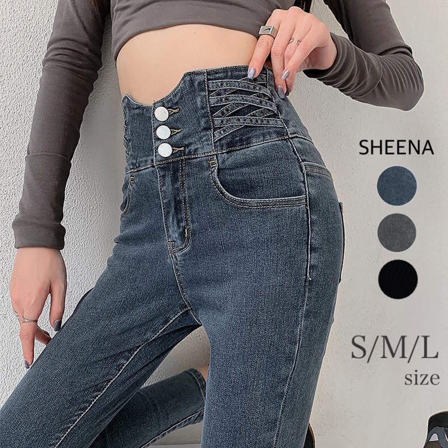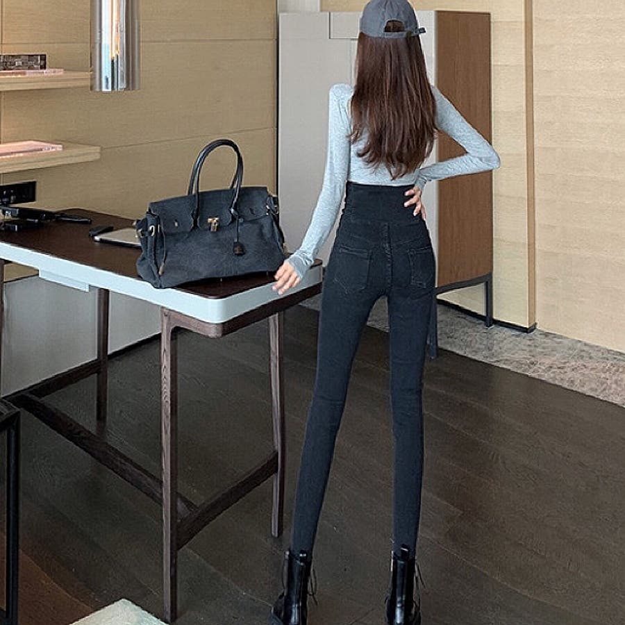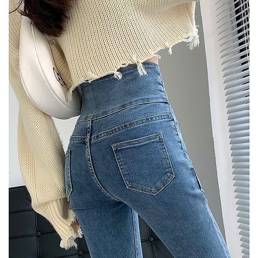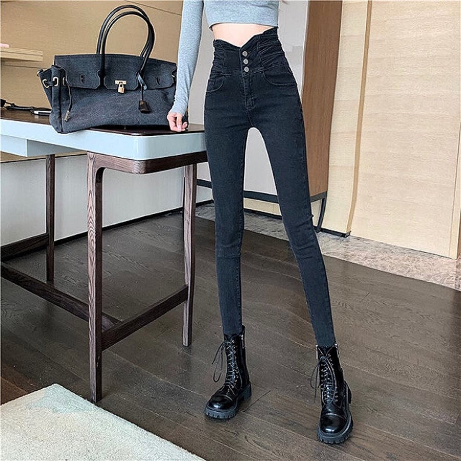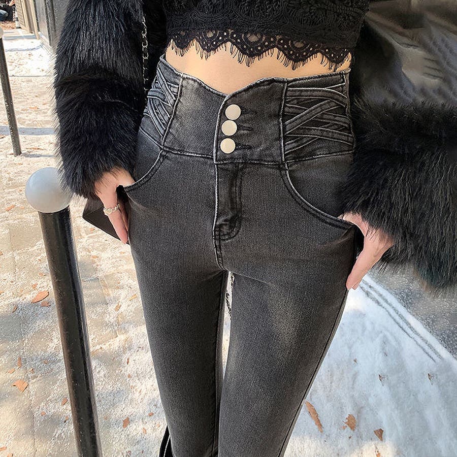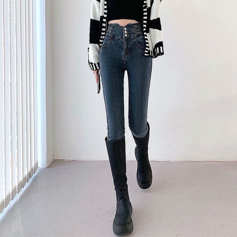 ハイウエストクロスループストレッチデニムスキニーパンツ 春 夏