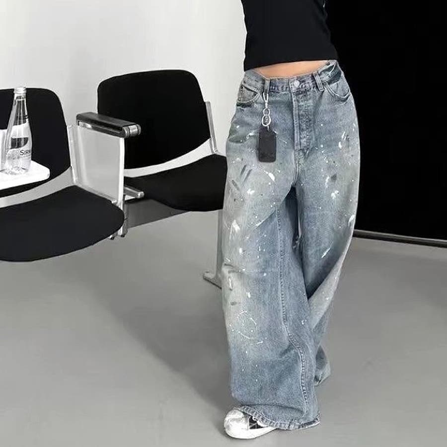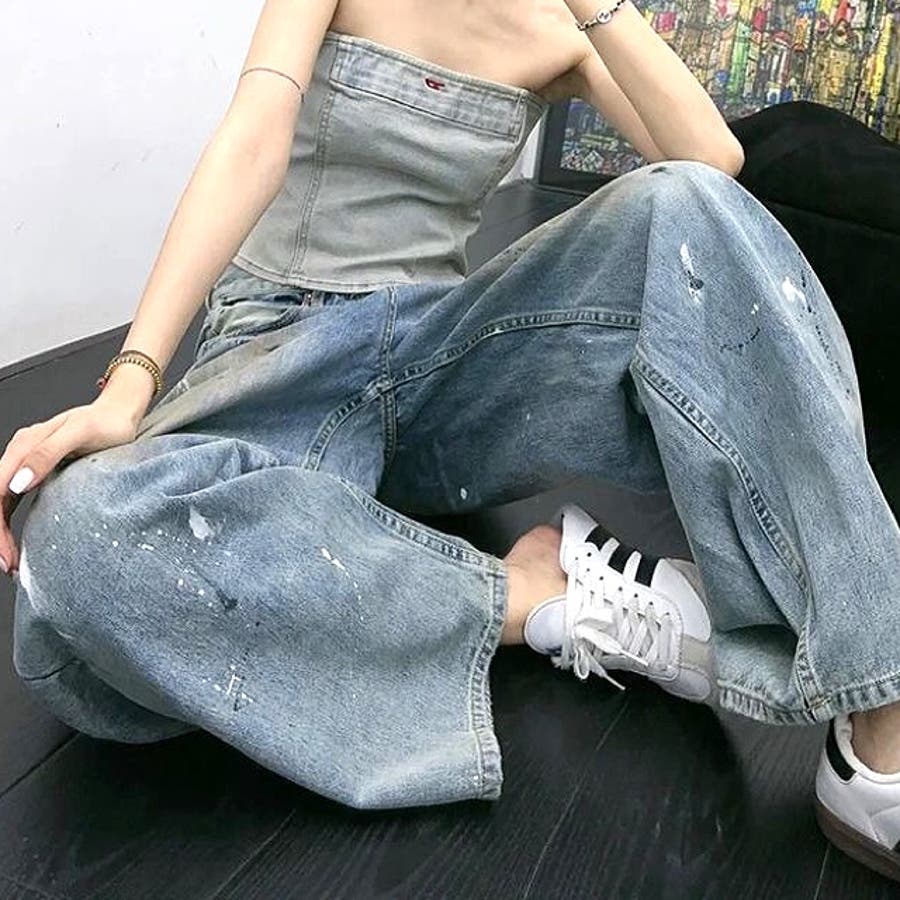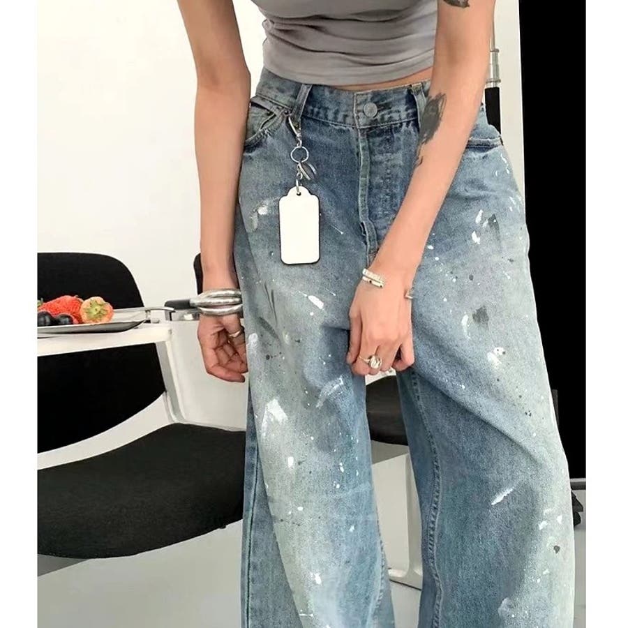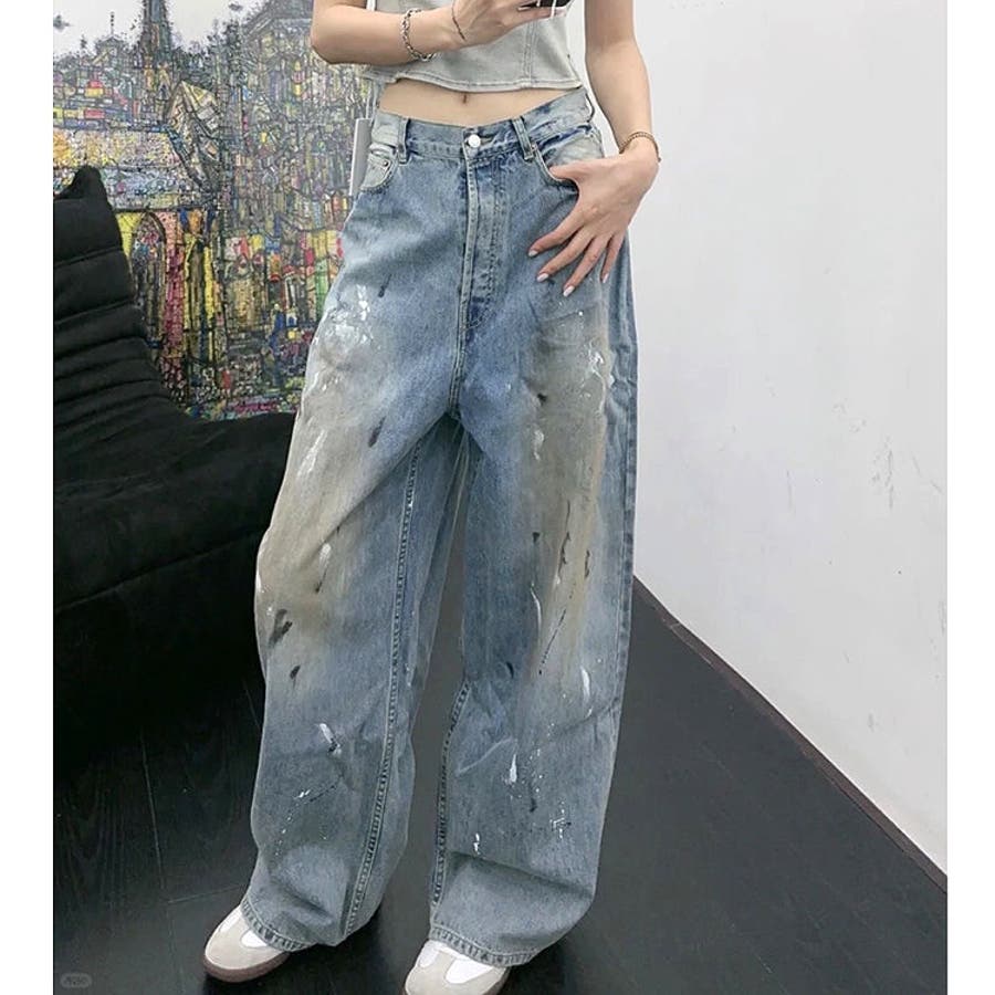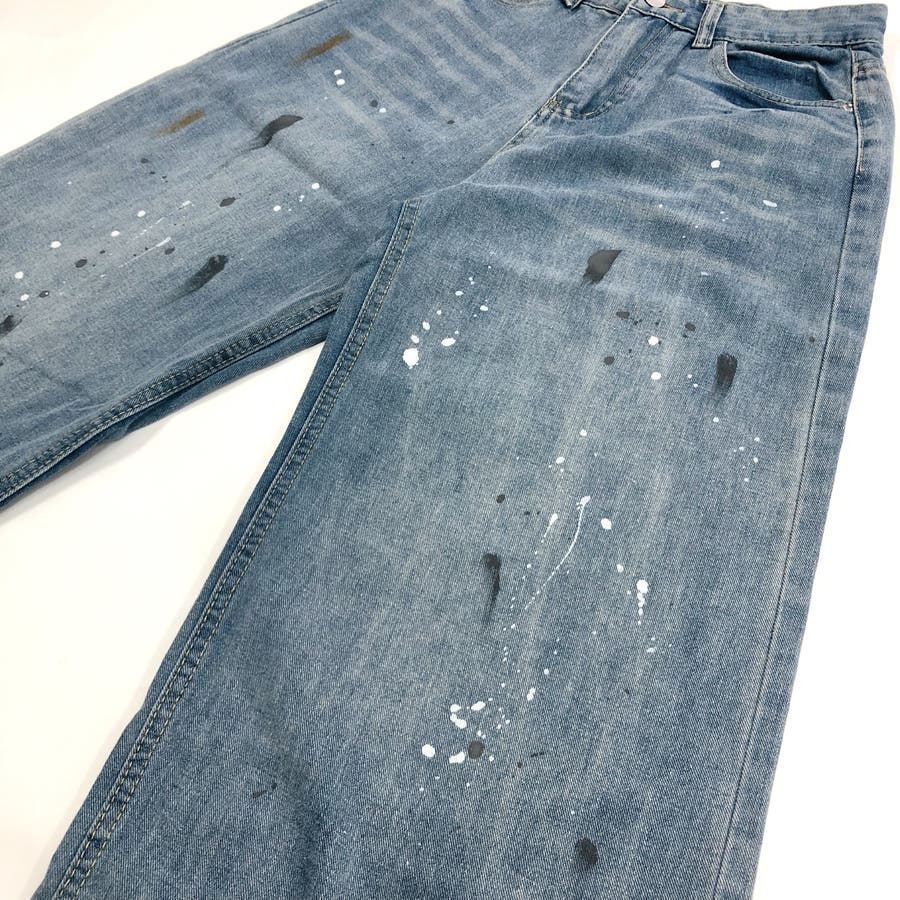 ペイント加工デニムワイドパンツ 春 夏