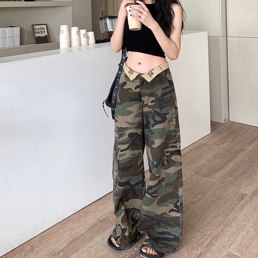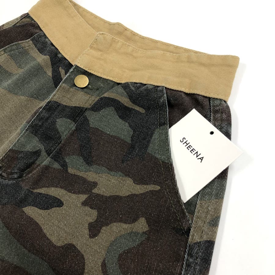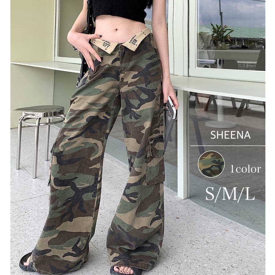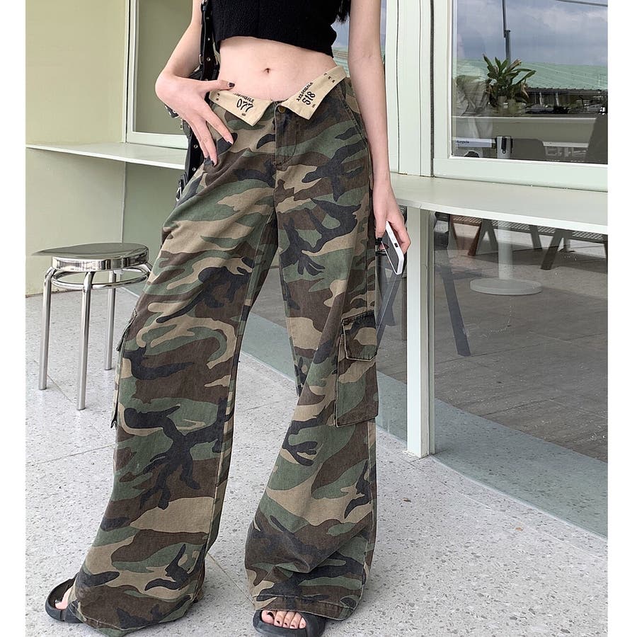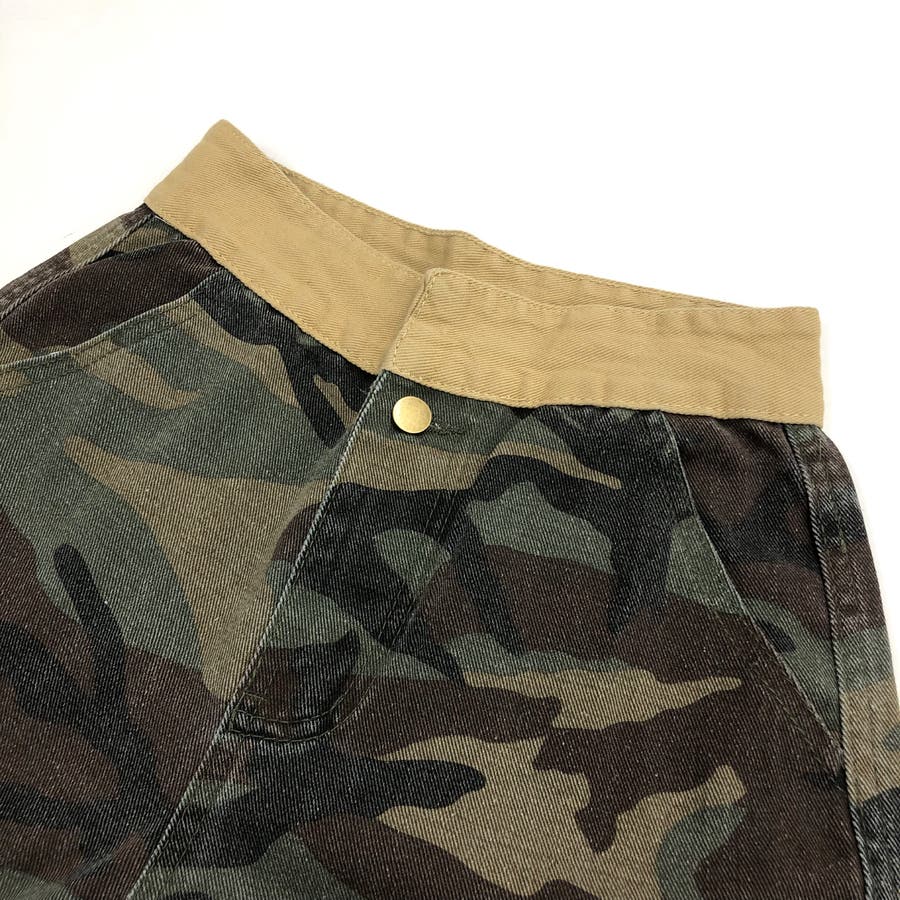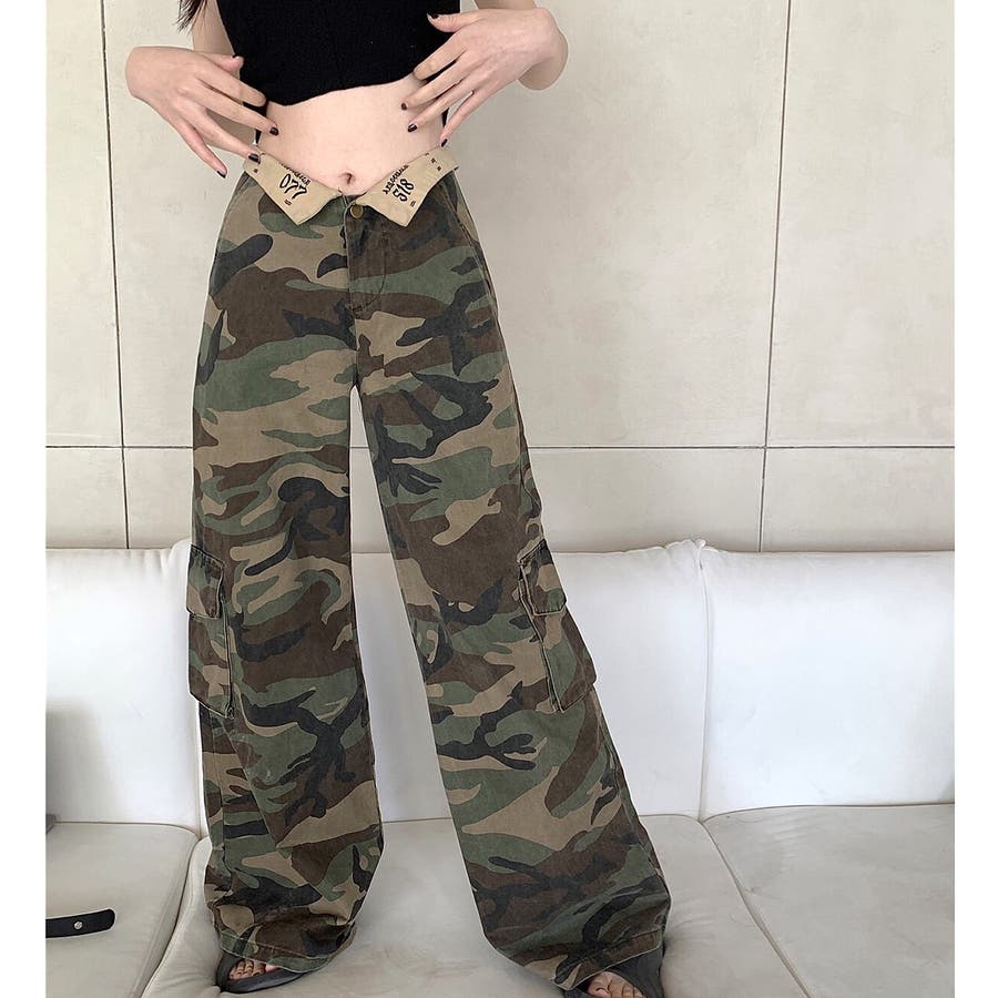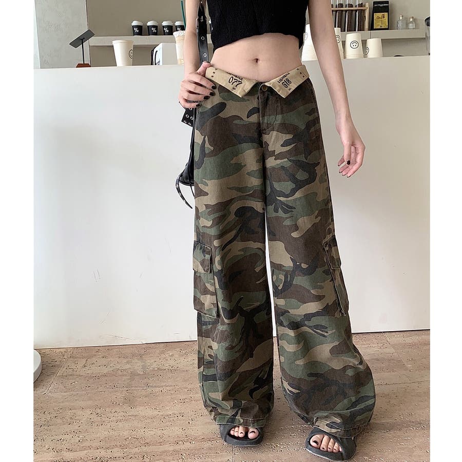 折り返しウエスト迷彩柄カーゴパンツ 春 夏