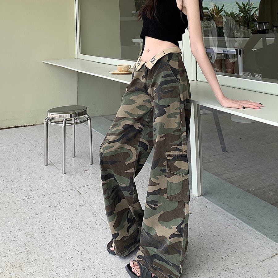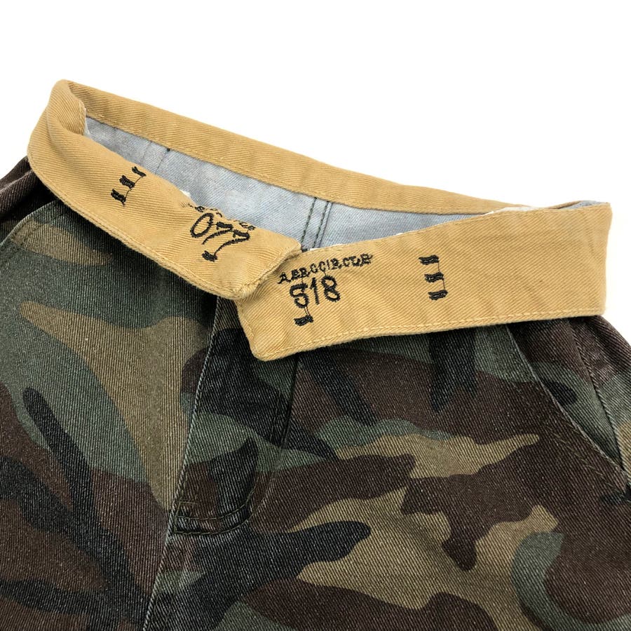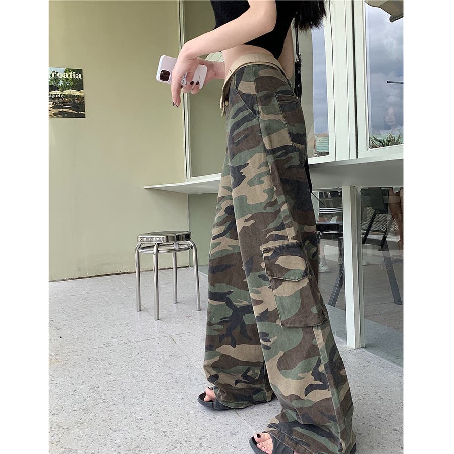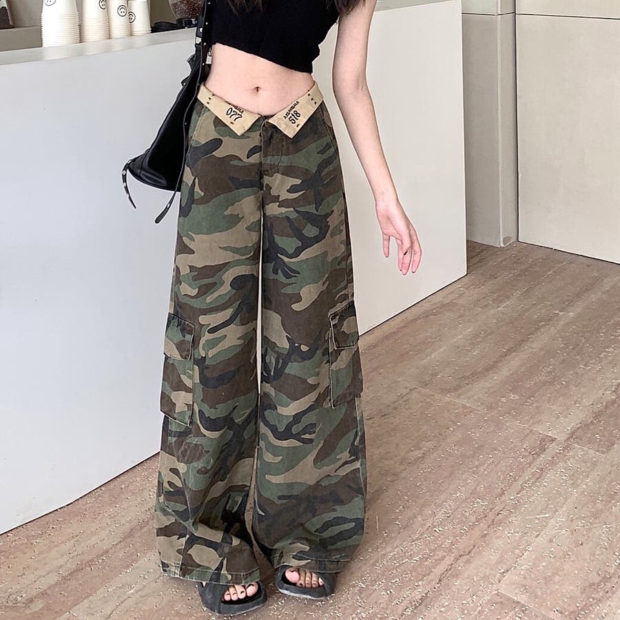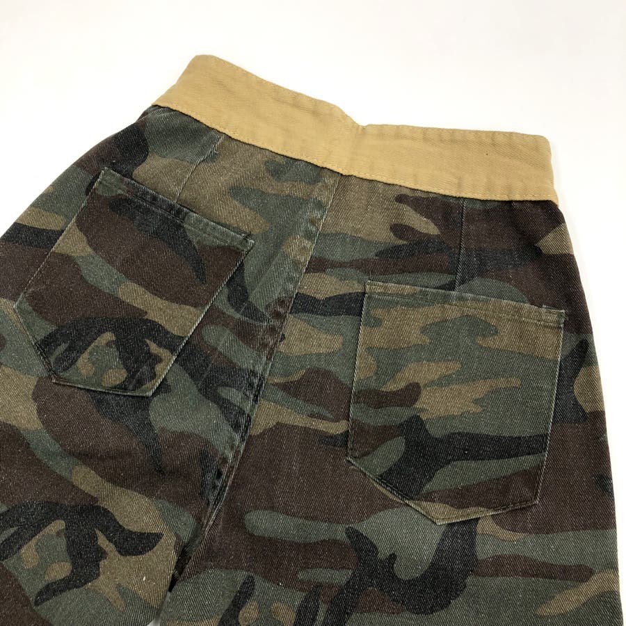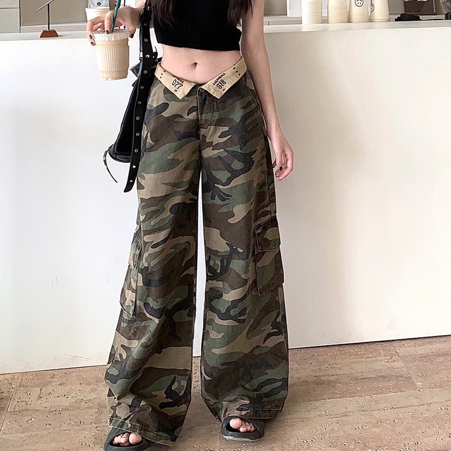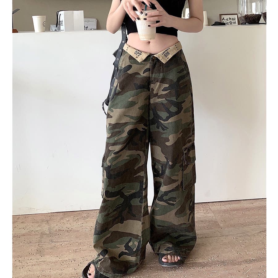 折り返しウエスト迷彩柄カーゴパンツ 春 夏