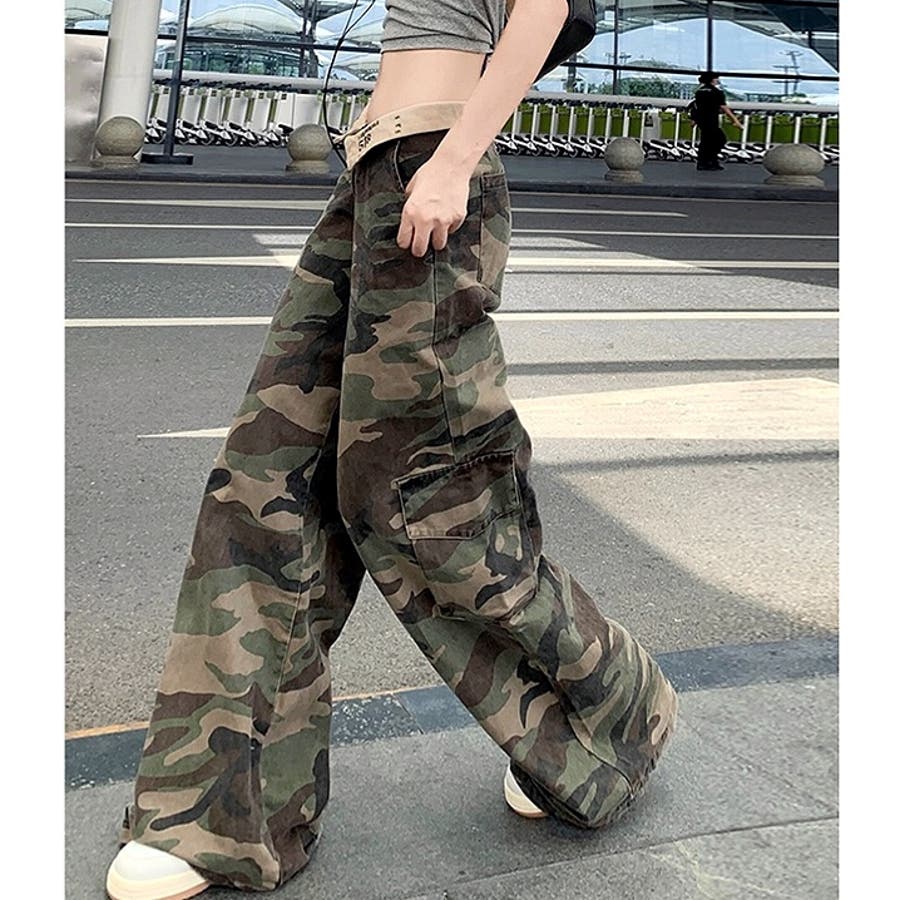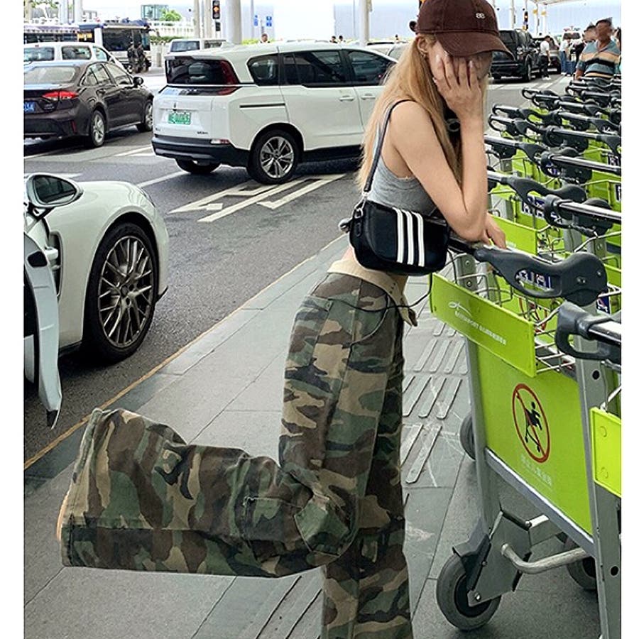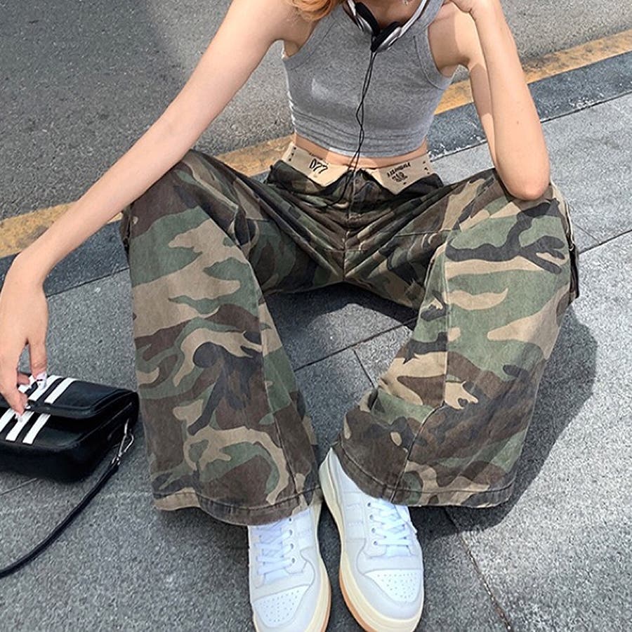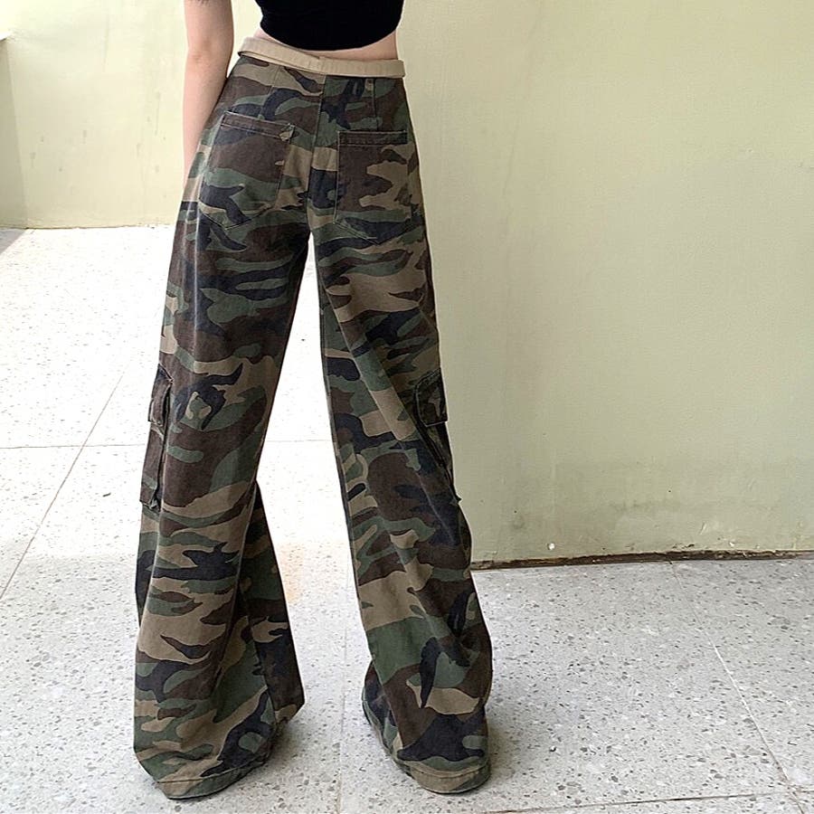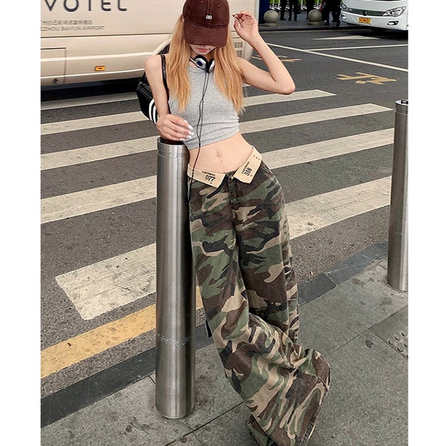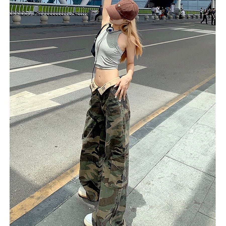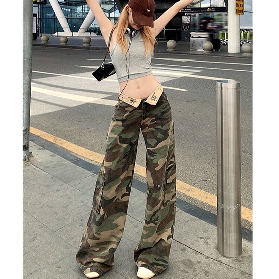 折り返しウエスト迷彩柄カーゴパンツ 春 夏