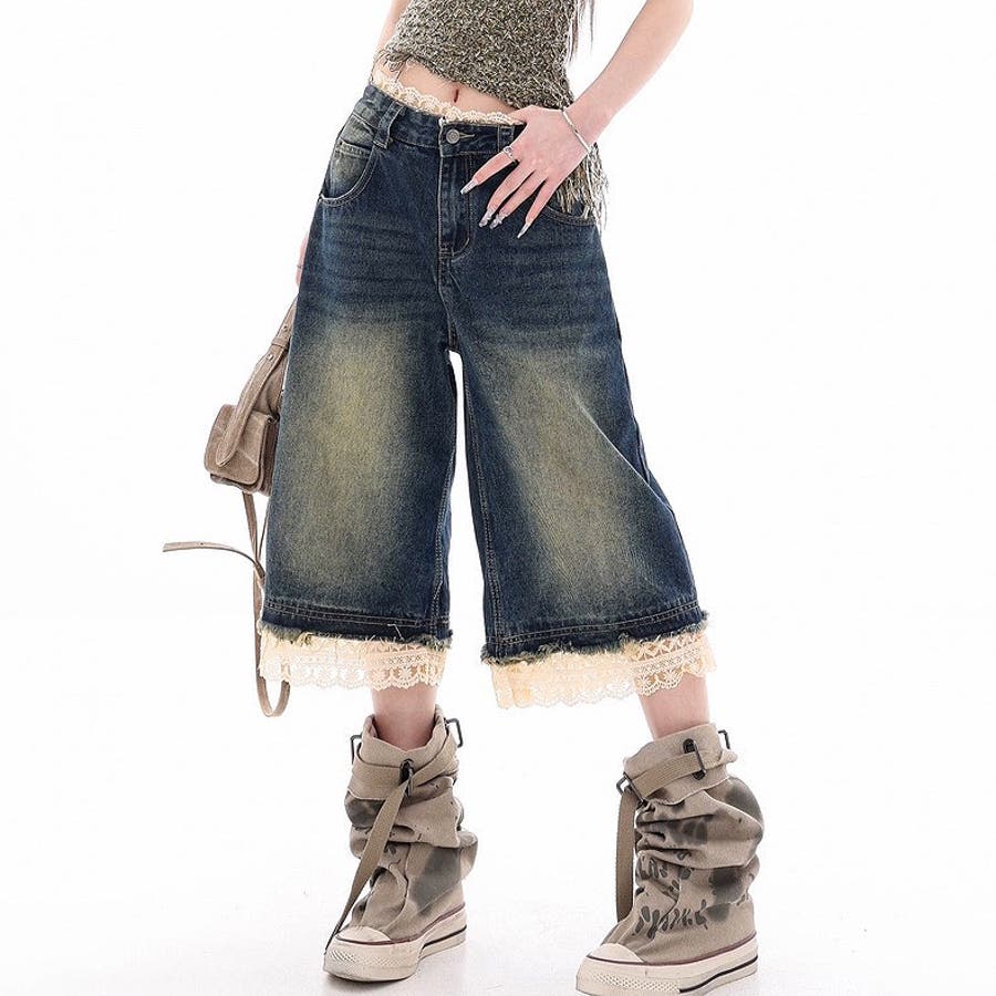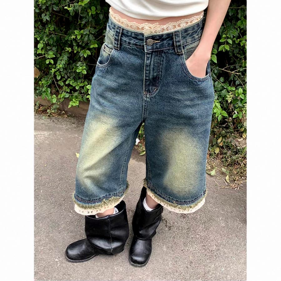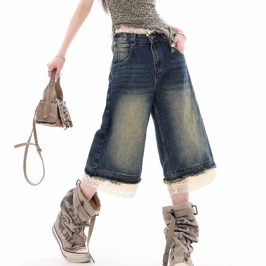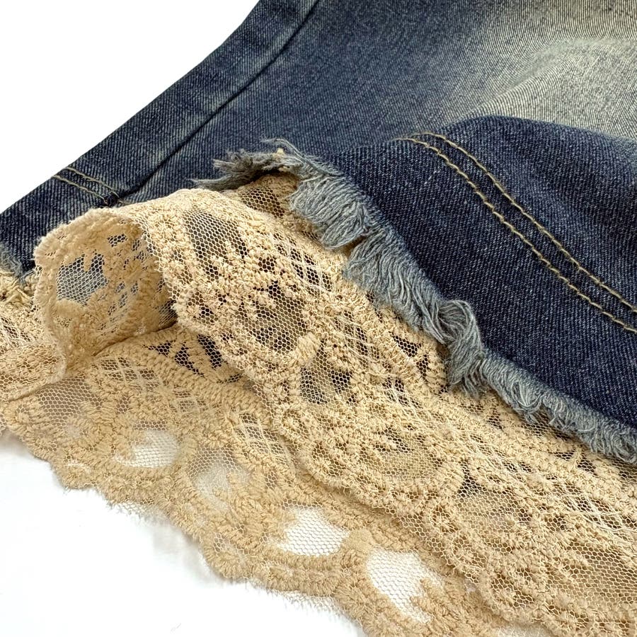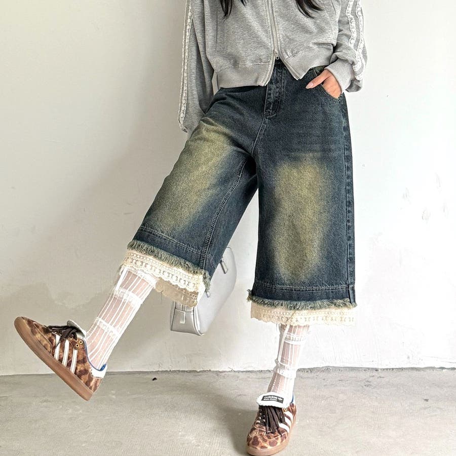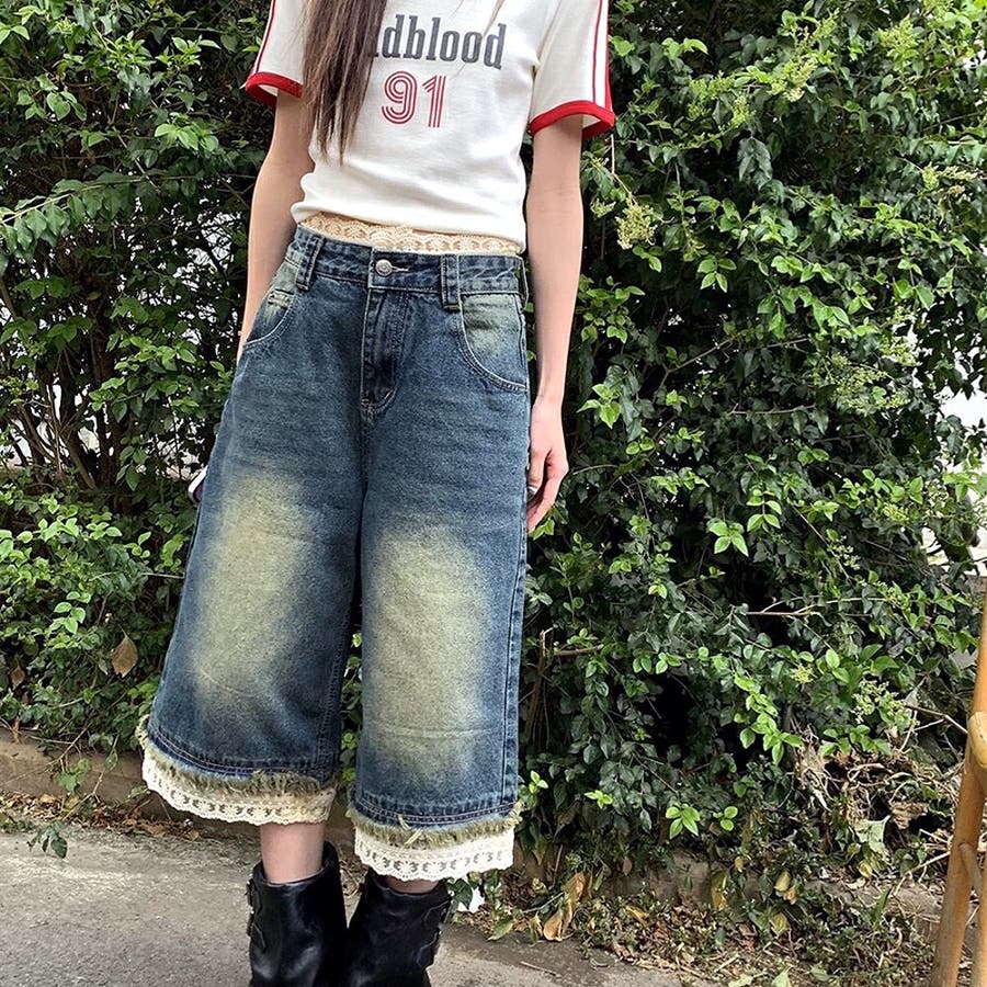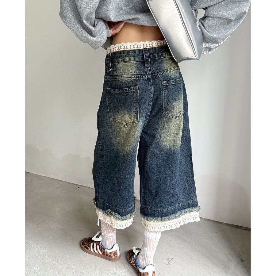 レースレイヤードデニムワイドハーフパンツ