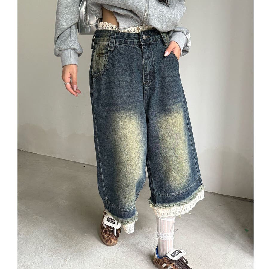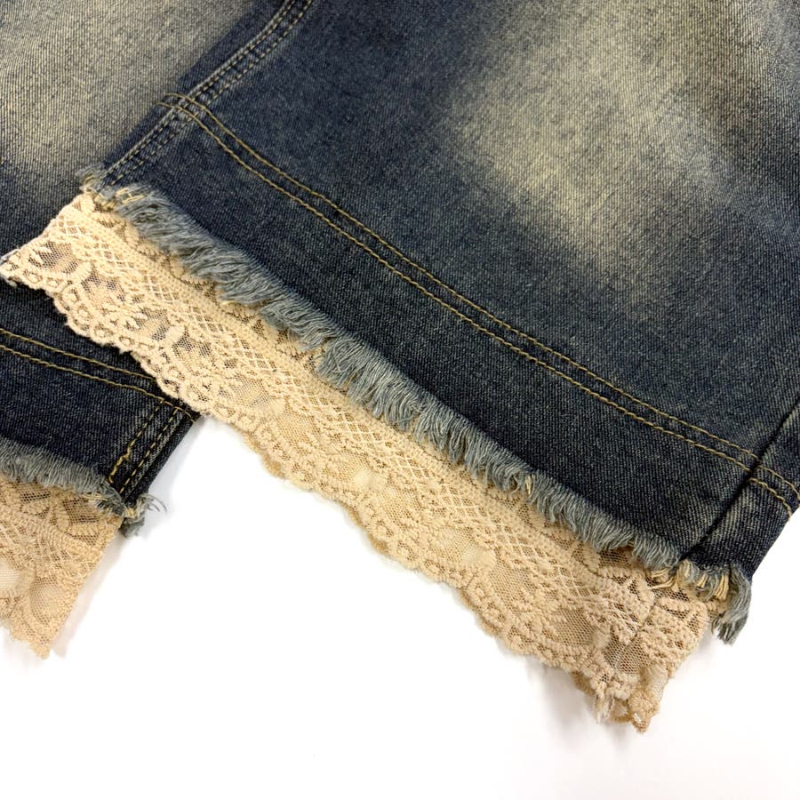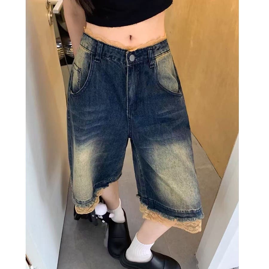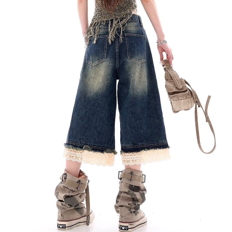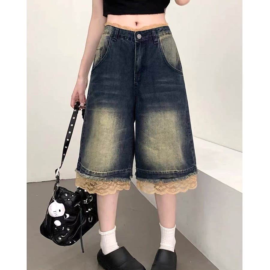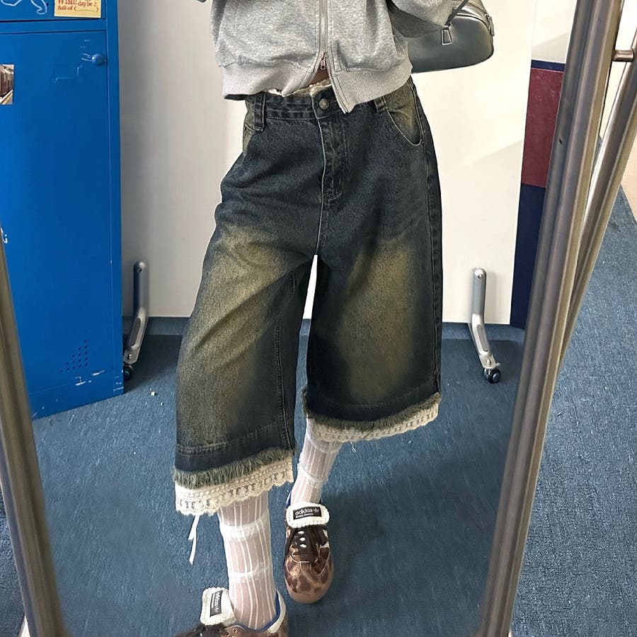 レースレイヤードデニムワイドハーフパンツ