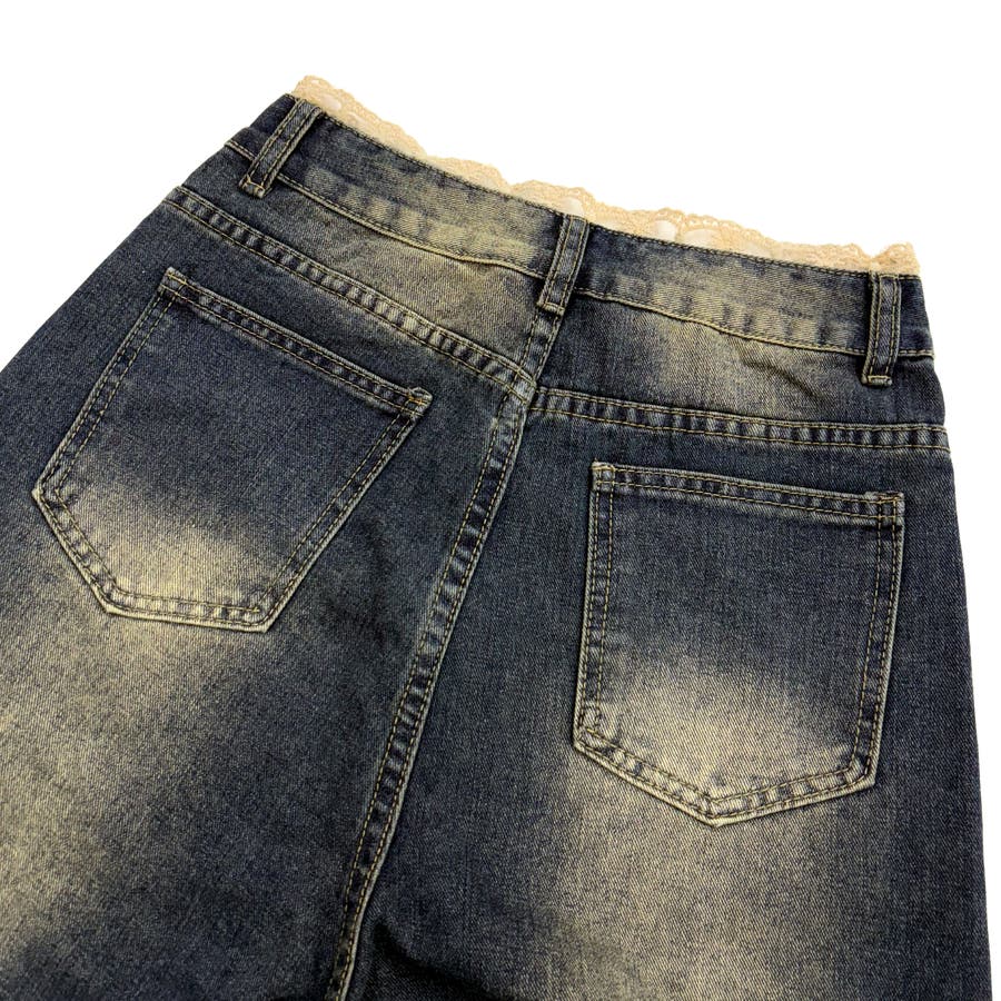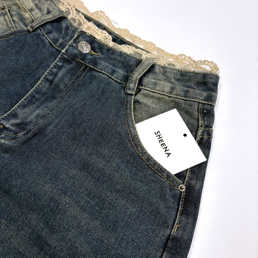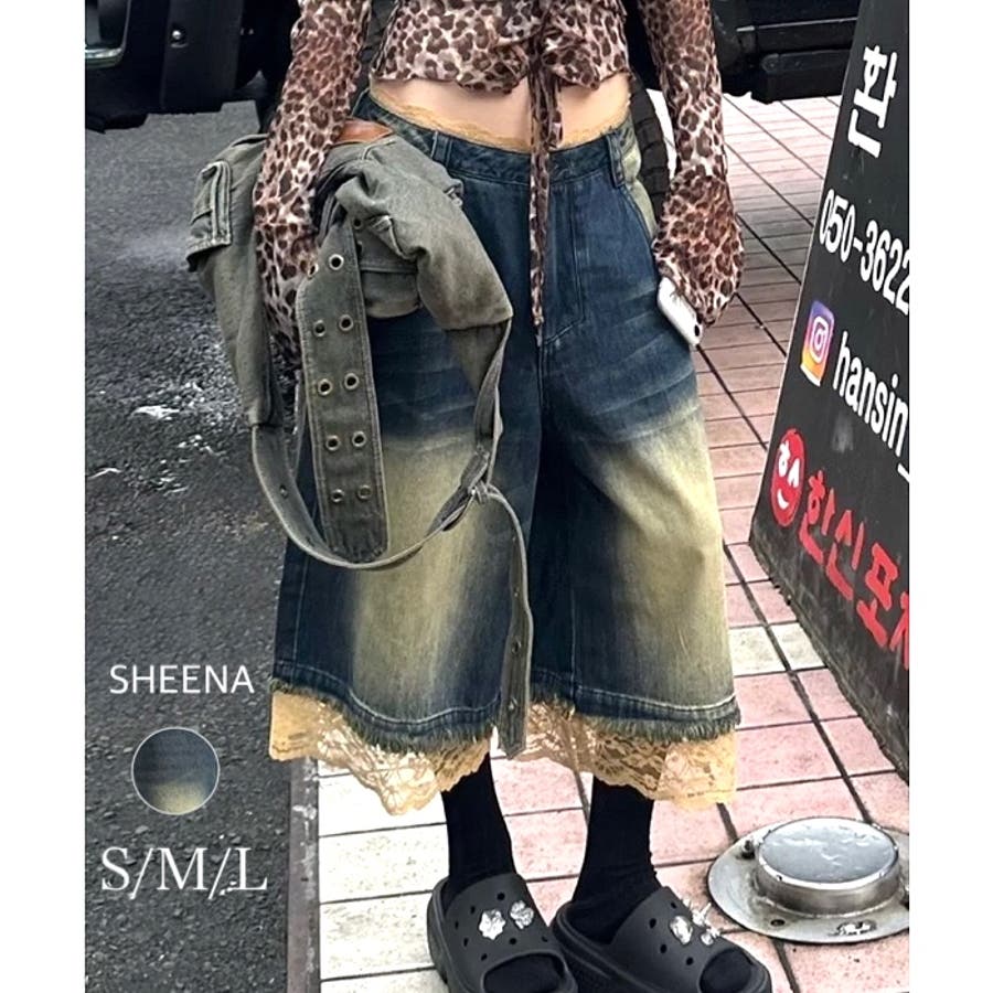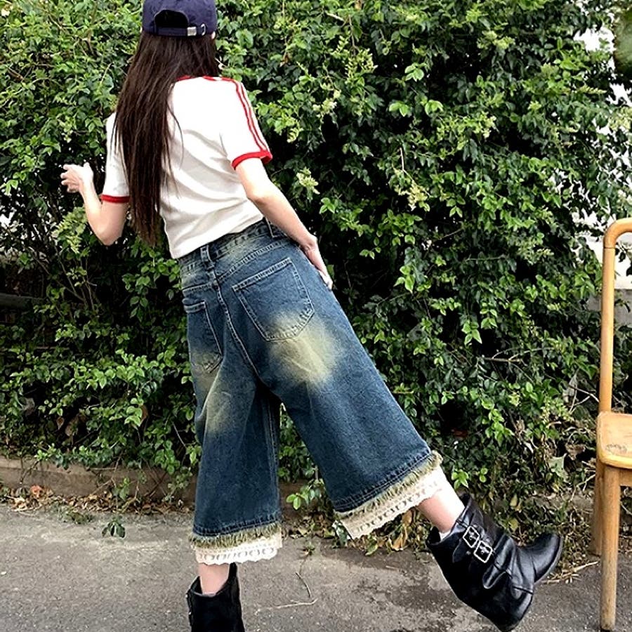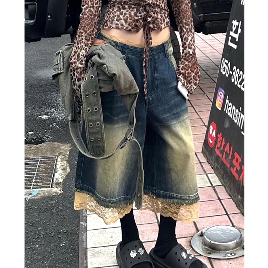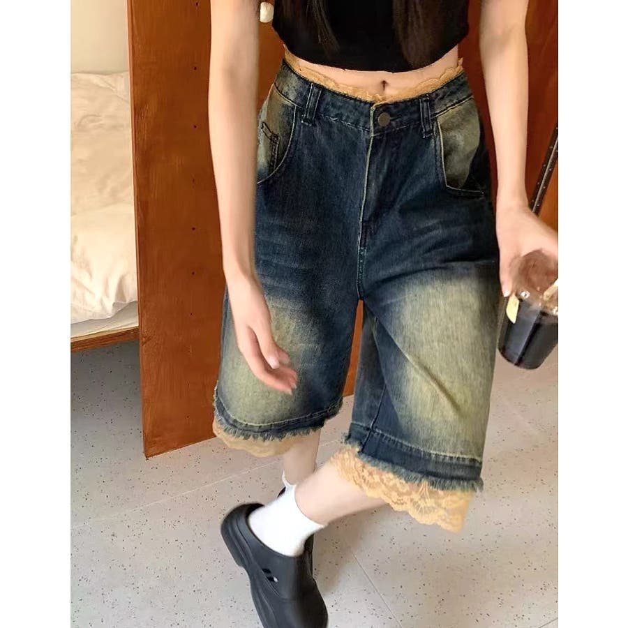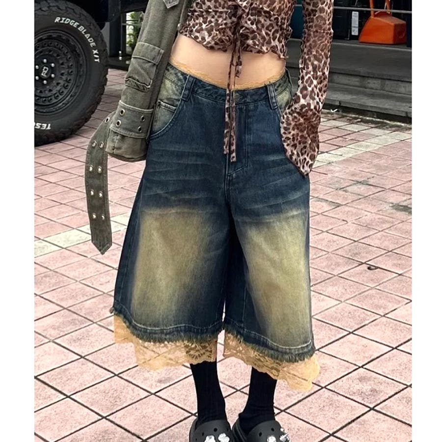 レースレイヤードデニムワイドハーフパンツ