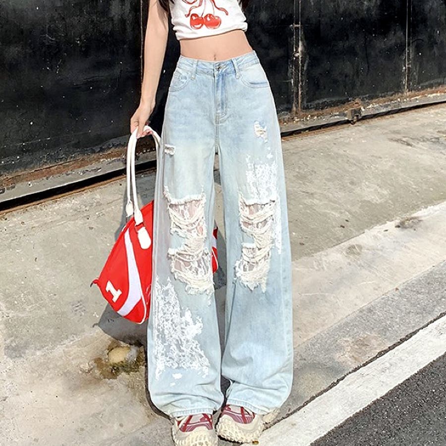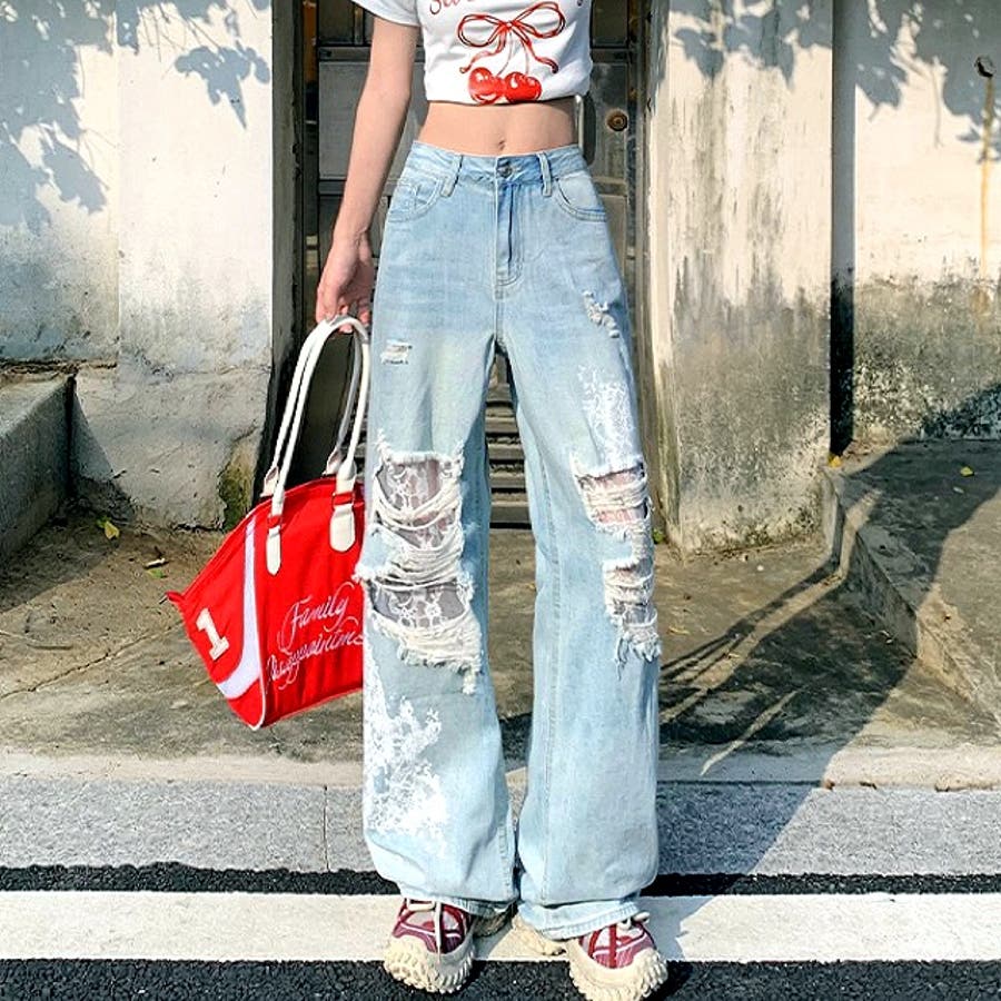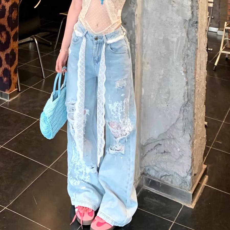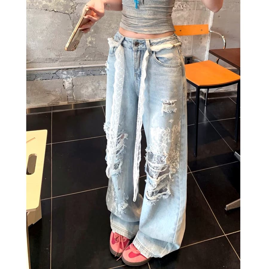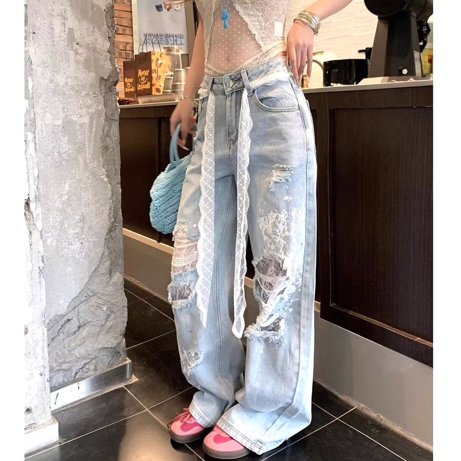 新作 春 夏 秋 冬 春服 夏服 秋服 冬服 オールシーズン デニム ワイドパンツ ゆったり 体型カバー レース ダメージ加工 ラインストーン カジュアル ストリート スポーティー 韓国 韓国ファッション トレンド OL 主婦 学生 ギャル Y2K 海外ガール シティガール グランジ 可愛い お洒落 着回し 10代 20代 30代 40代 50代