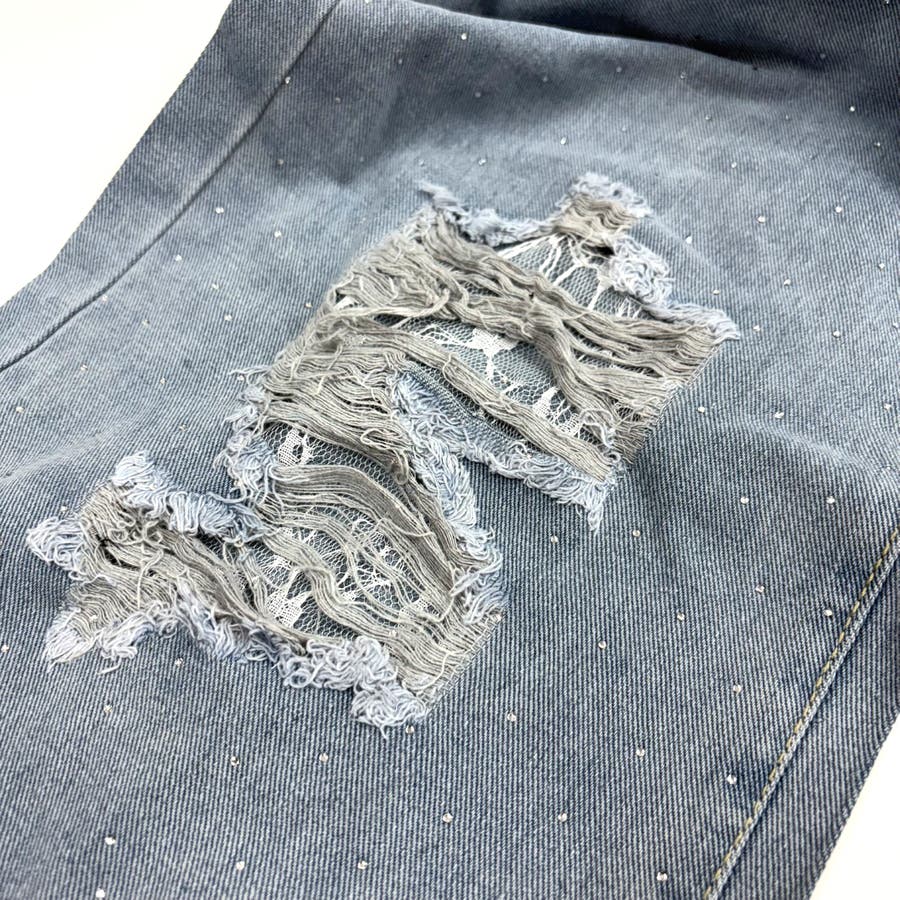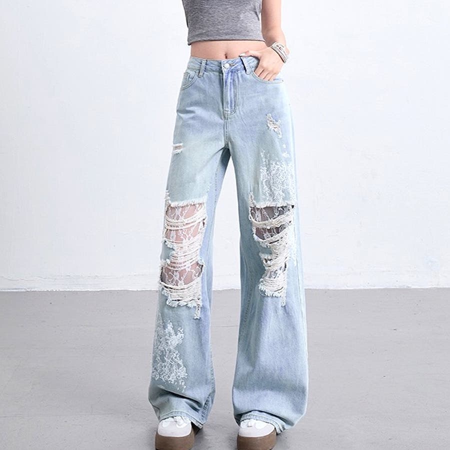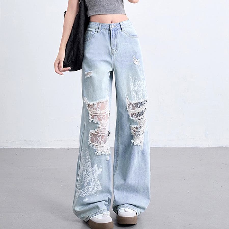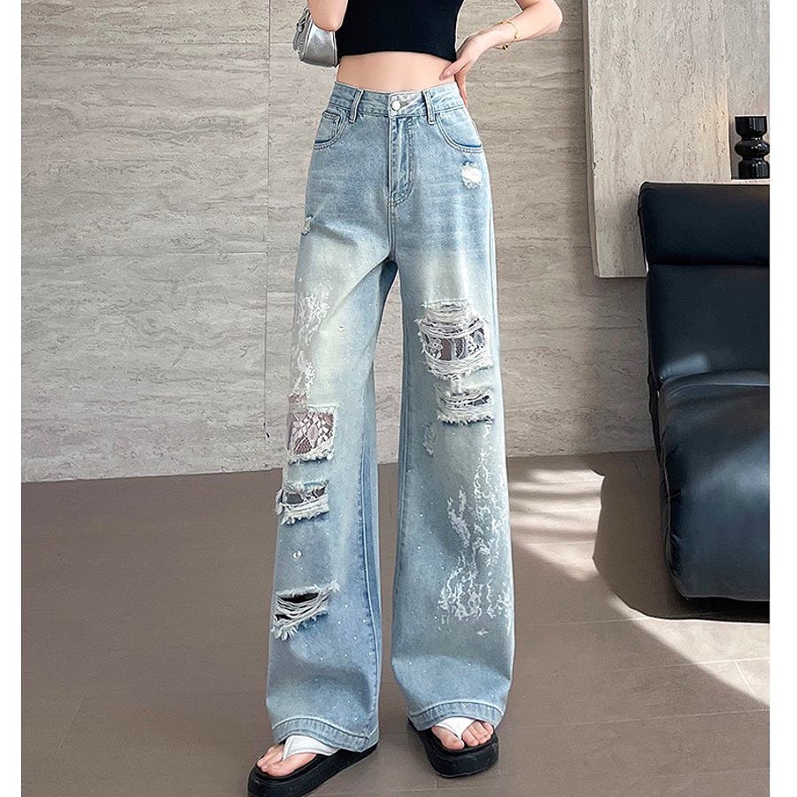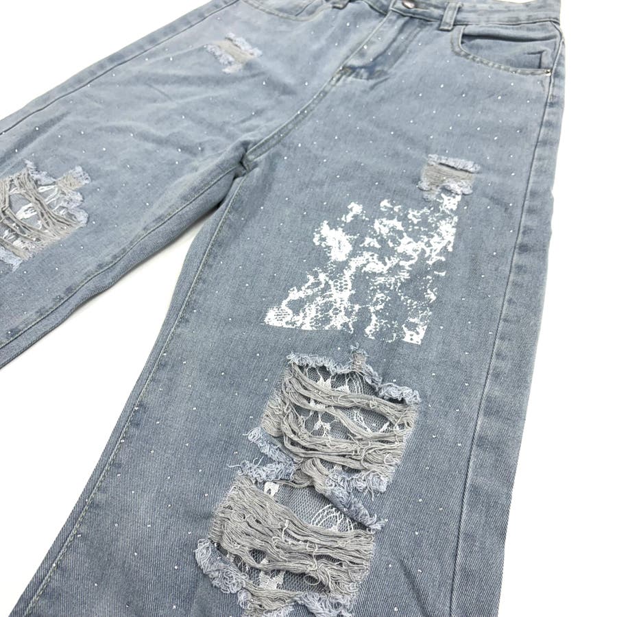 ラインストーン付きレースダメージデニムワイドパンツ