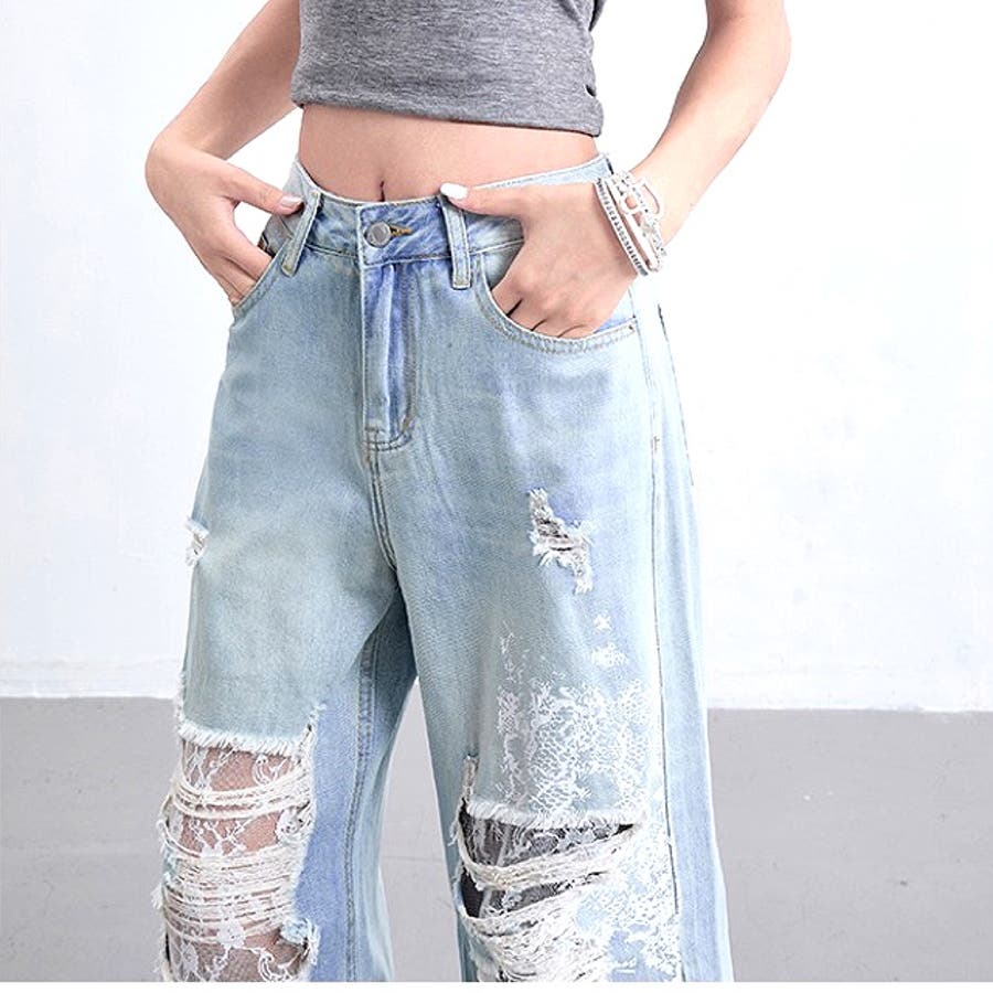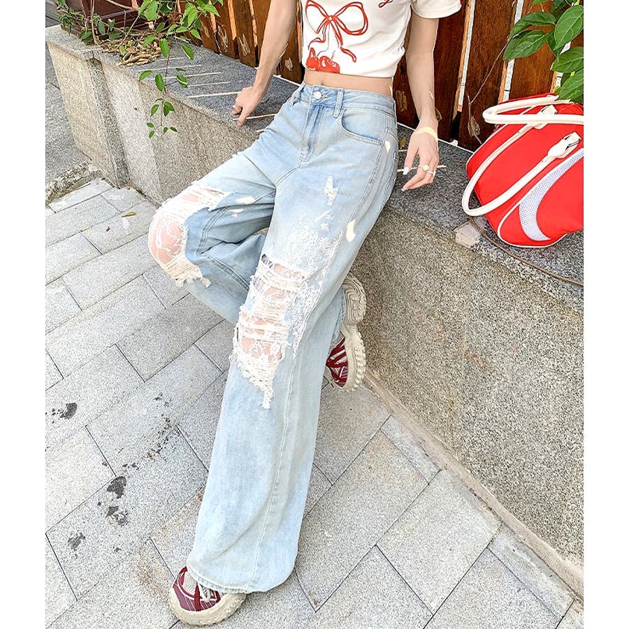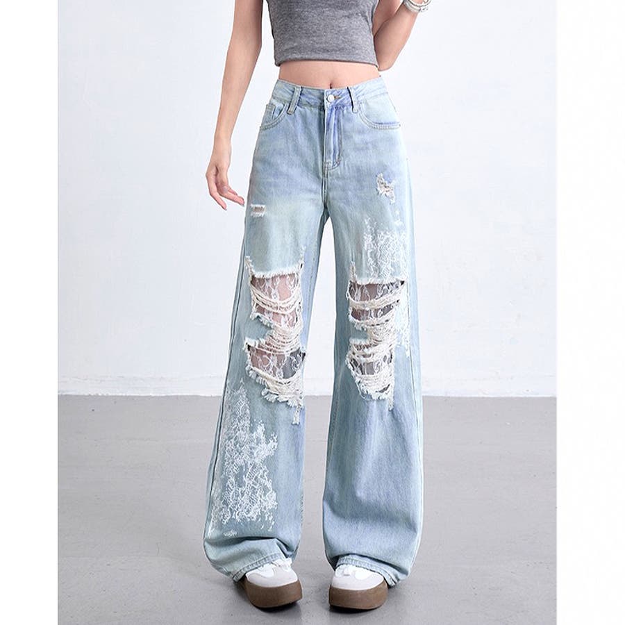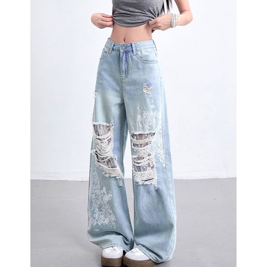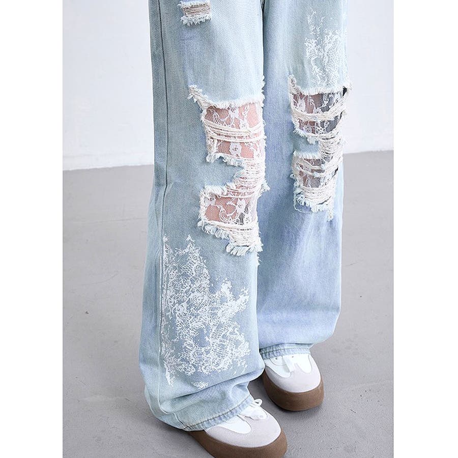 ラインストーン付きレースダメージデニムワイドパンツ
