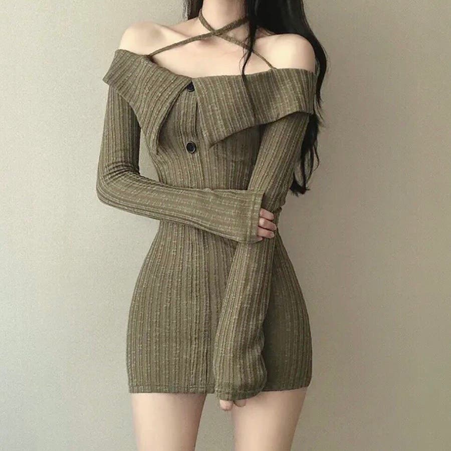 クロスネックオフショルワイドリブニットワンピース 秋 冬