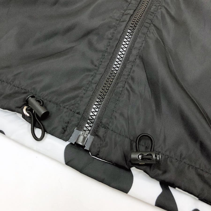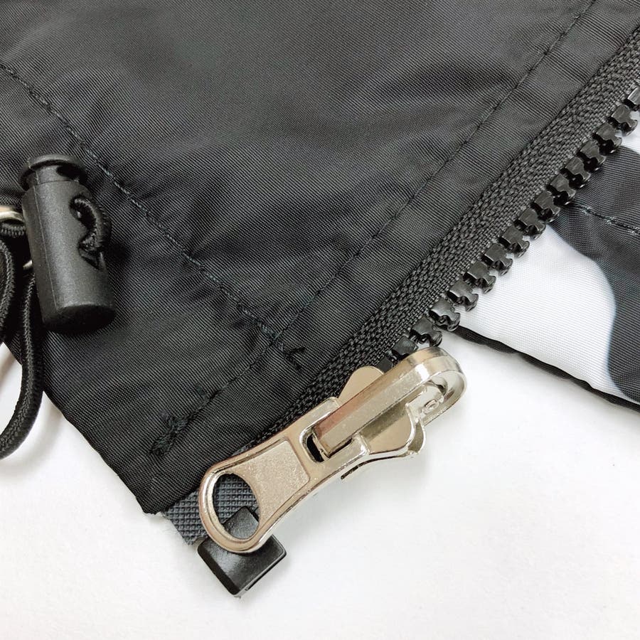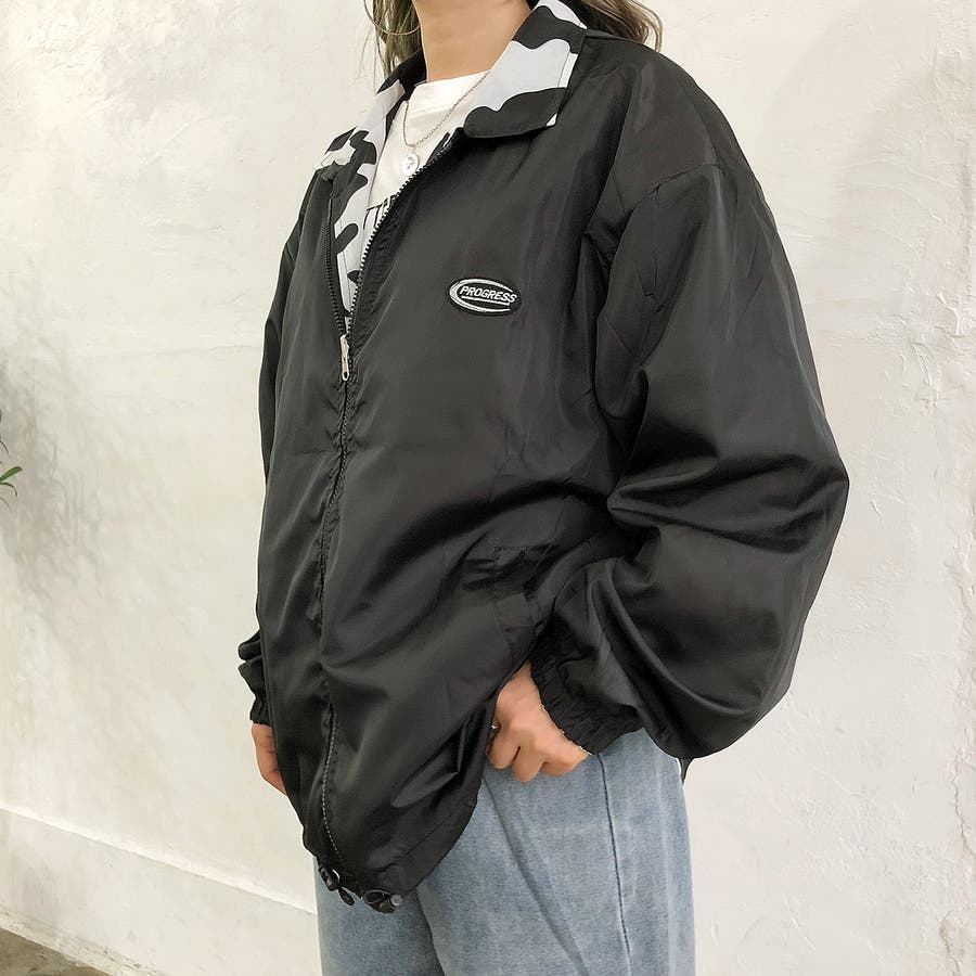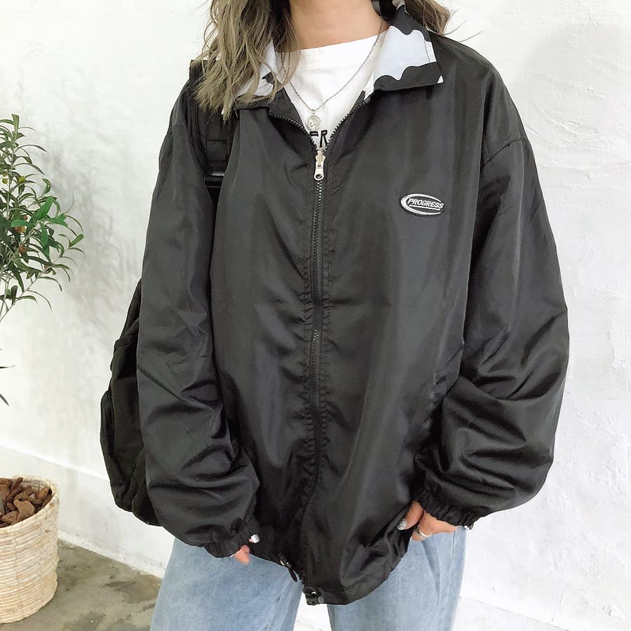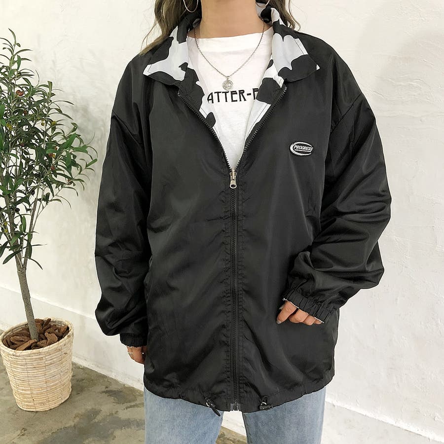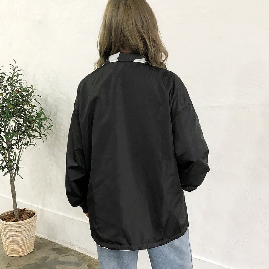 表の柄のある方と裏の黒の方と両方で着こなせるのがすごく魅力的。黒い方で着てみると、中の柄がちらっと見える感じがすごくいい!