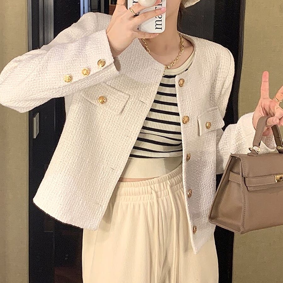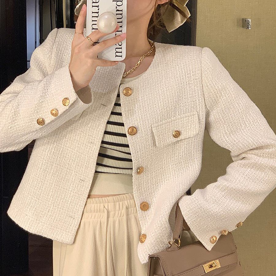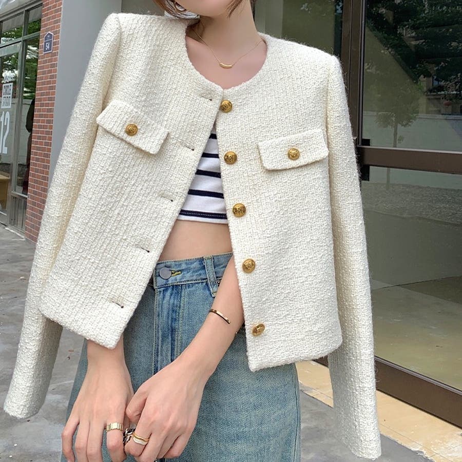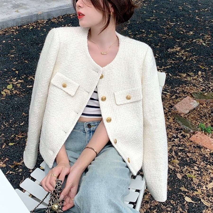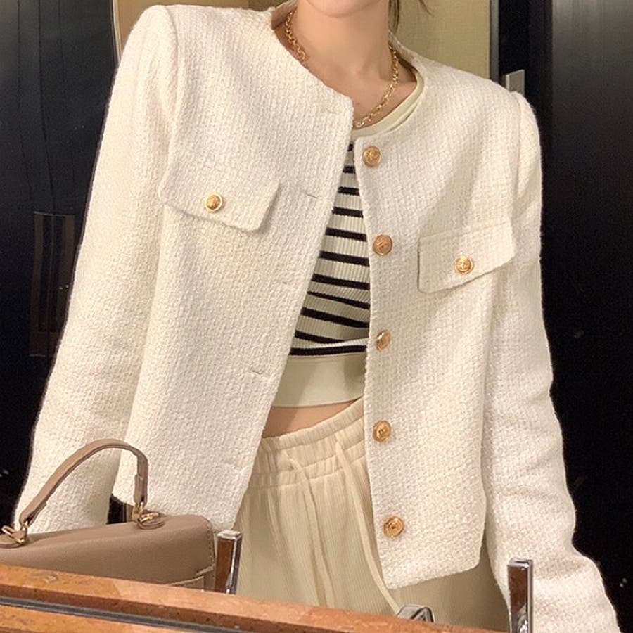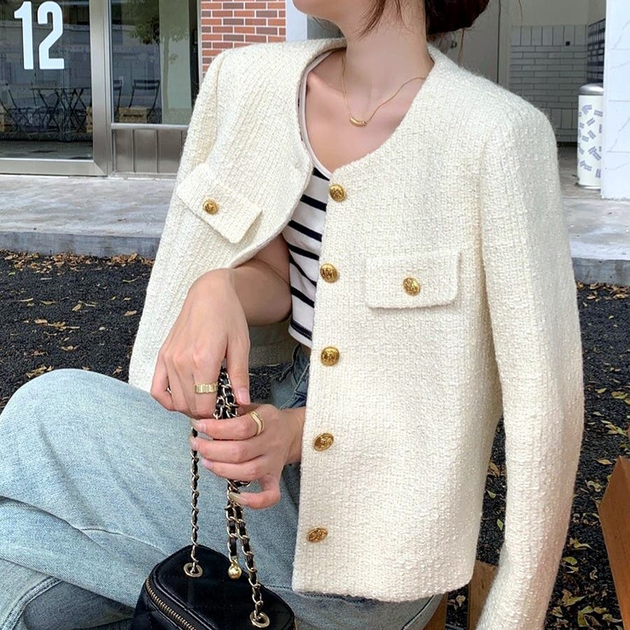 ツイード風ノーカラージャケット 春 秋