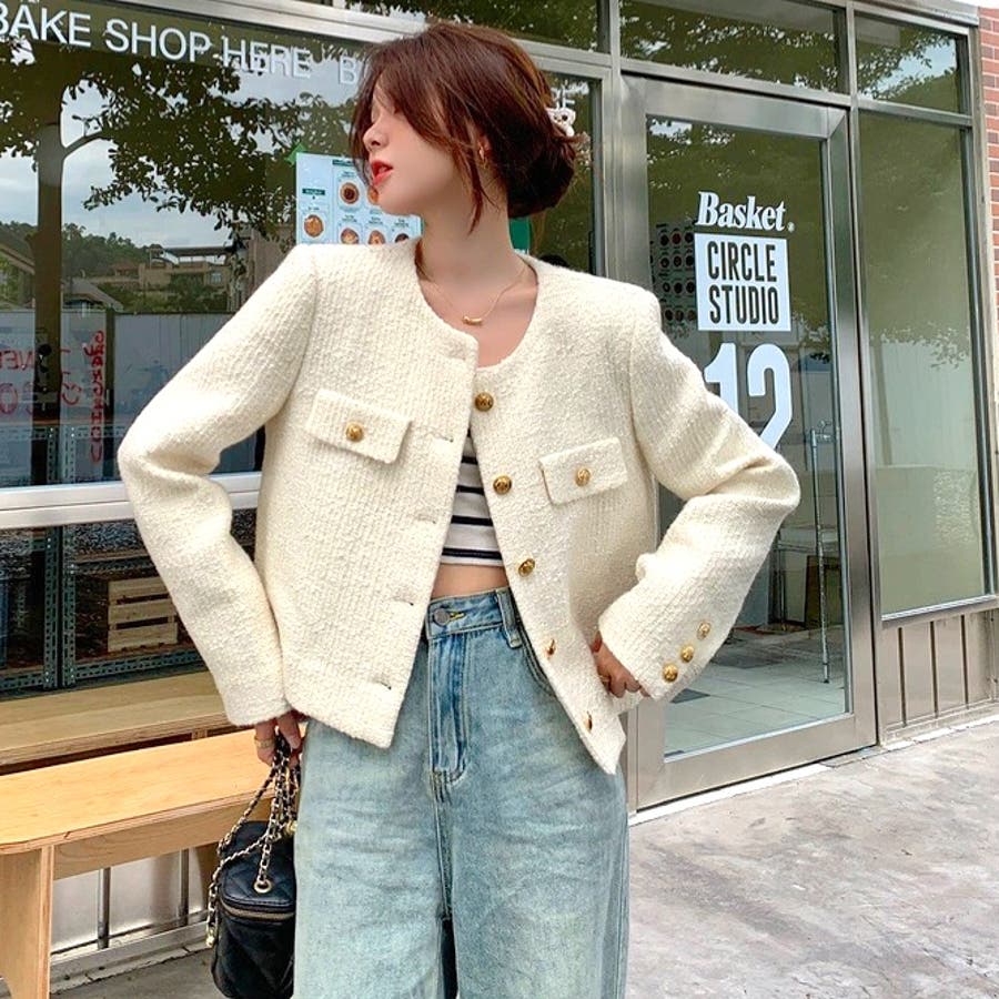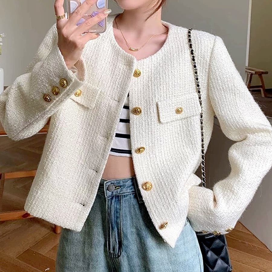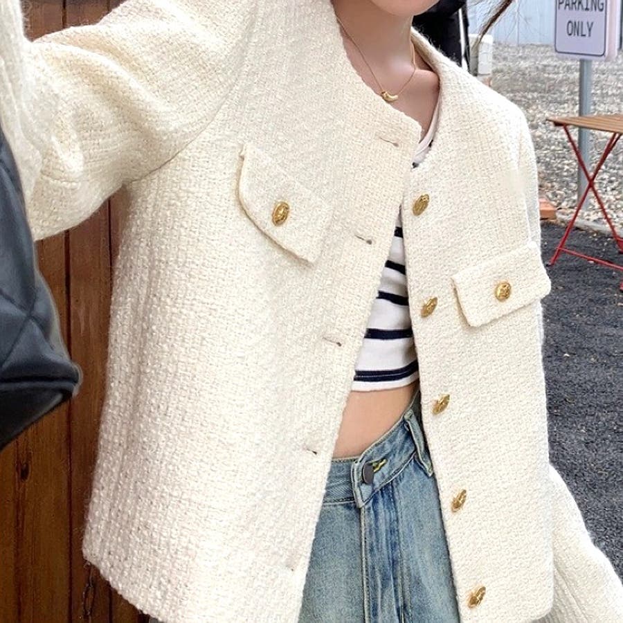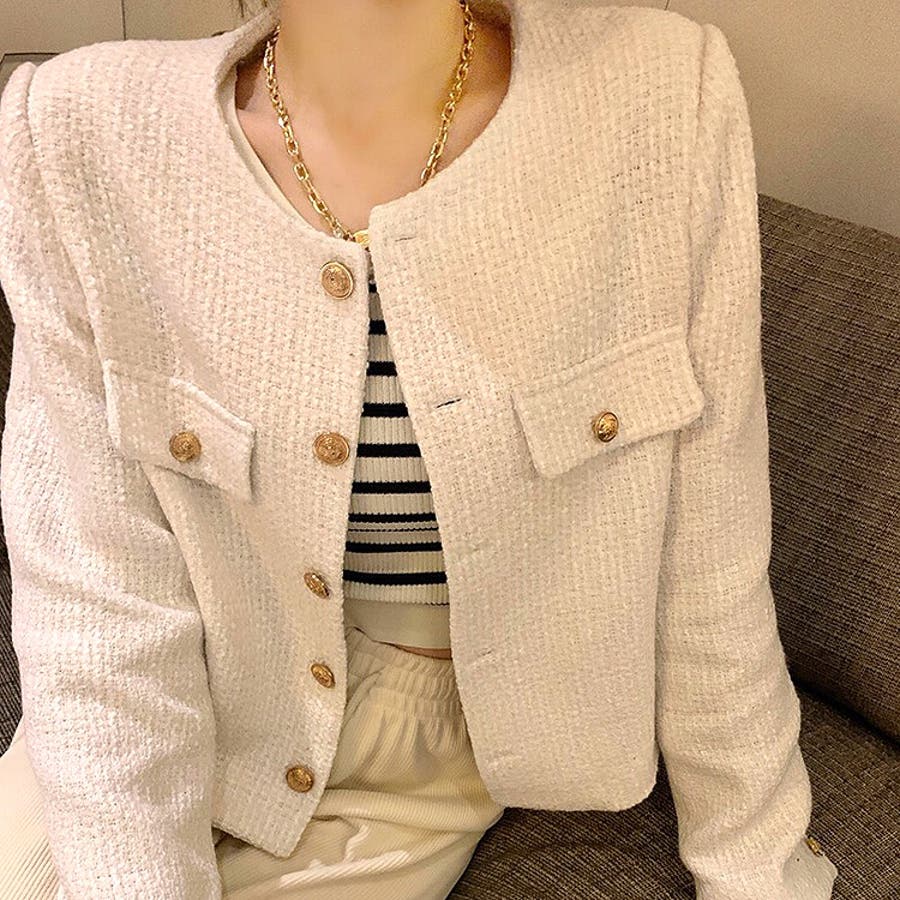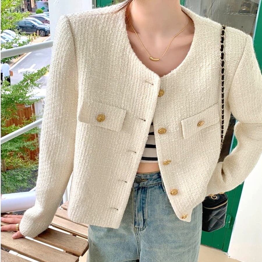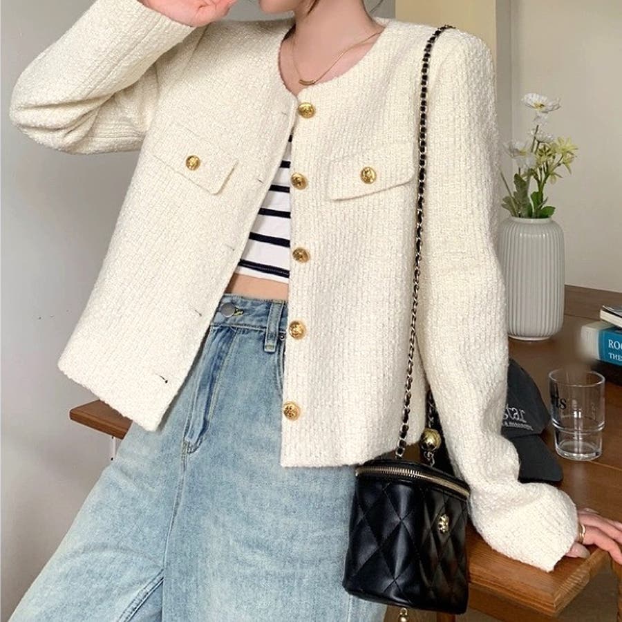 ツイード風ノーカラージャケット 春 秋
