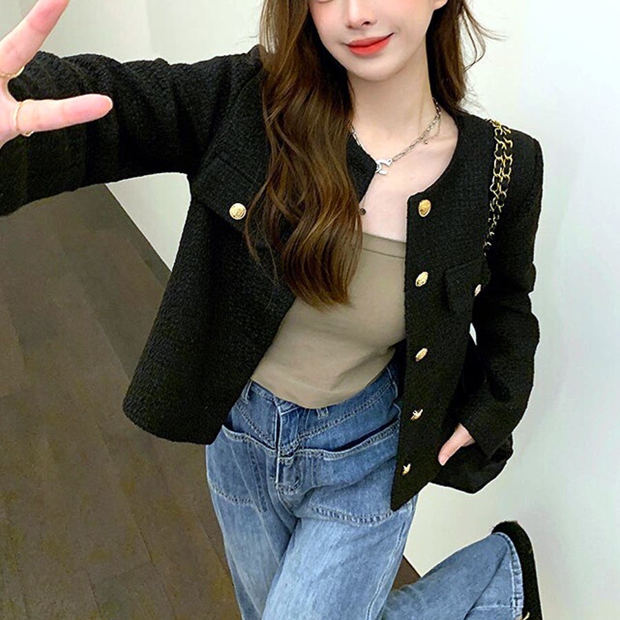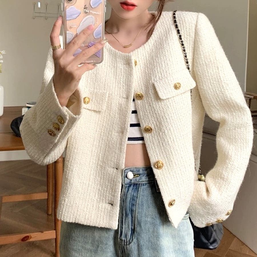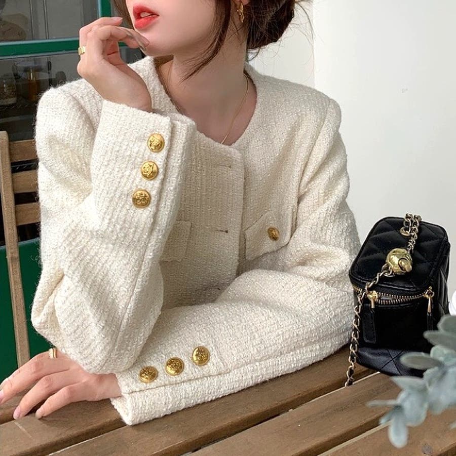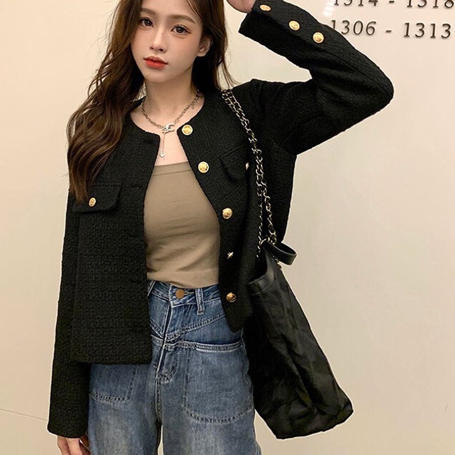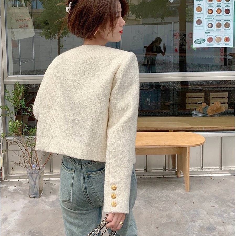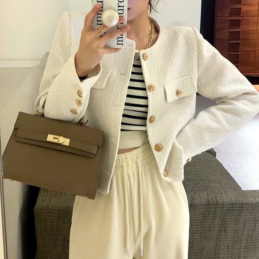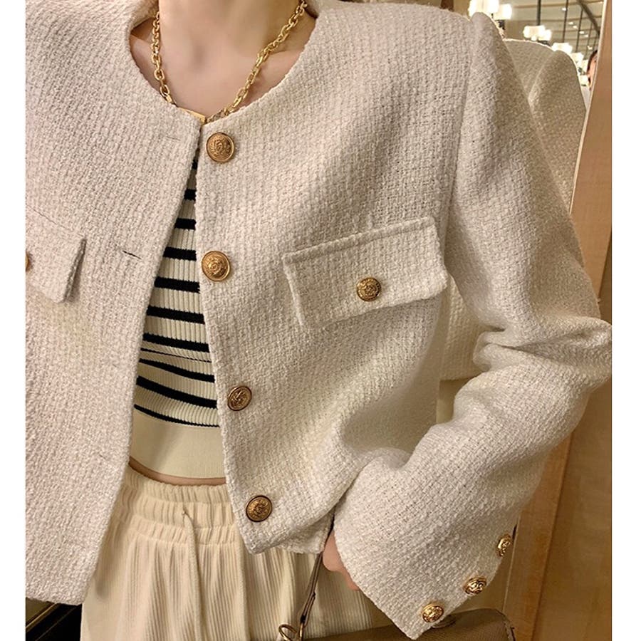 ツイード風ノーカラージャケット 春 秋