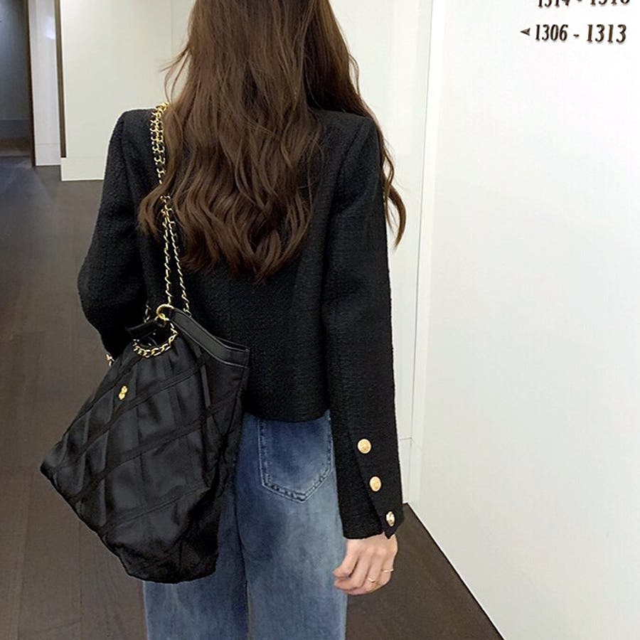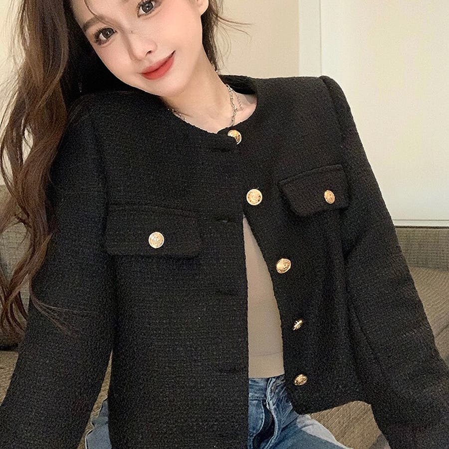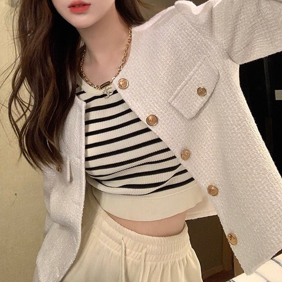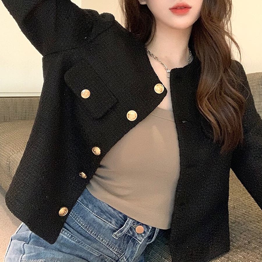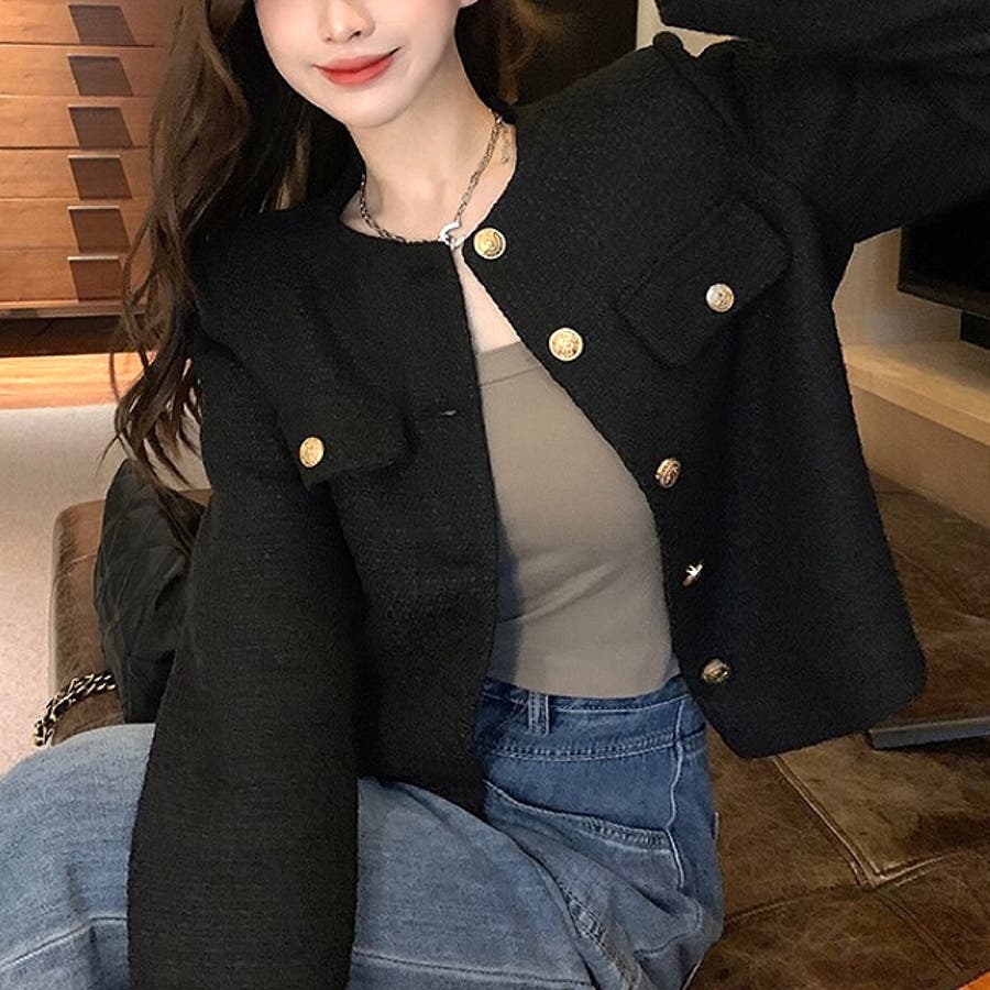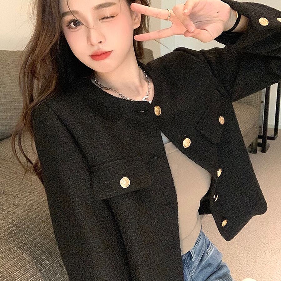ツイード風ノーカラージャケット 春 秋