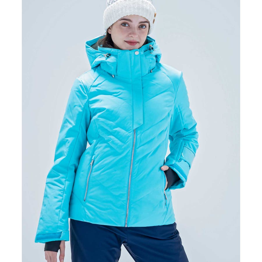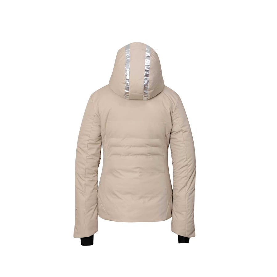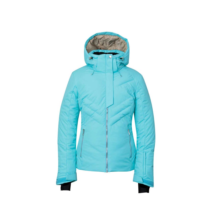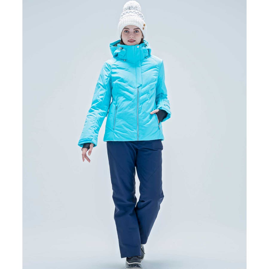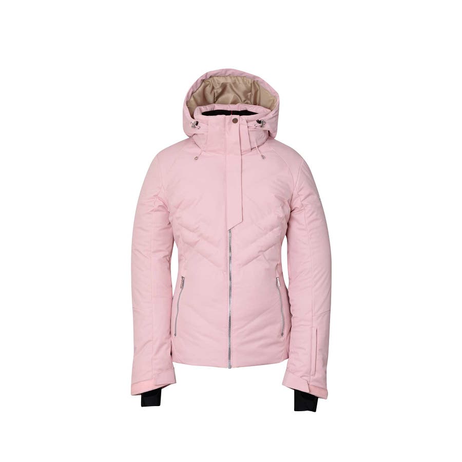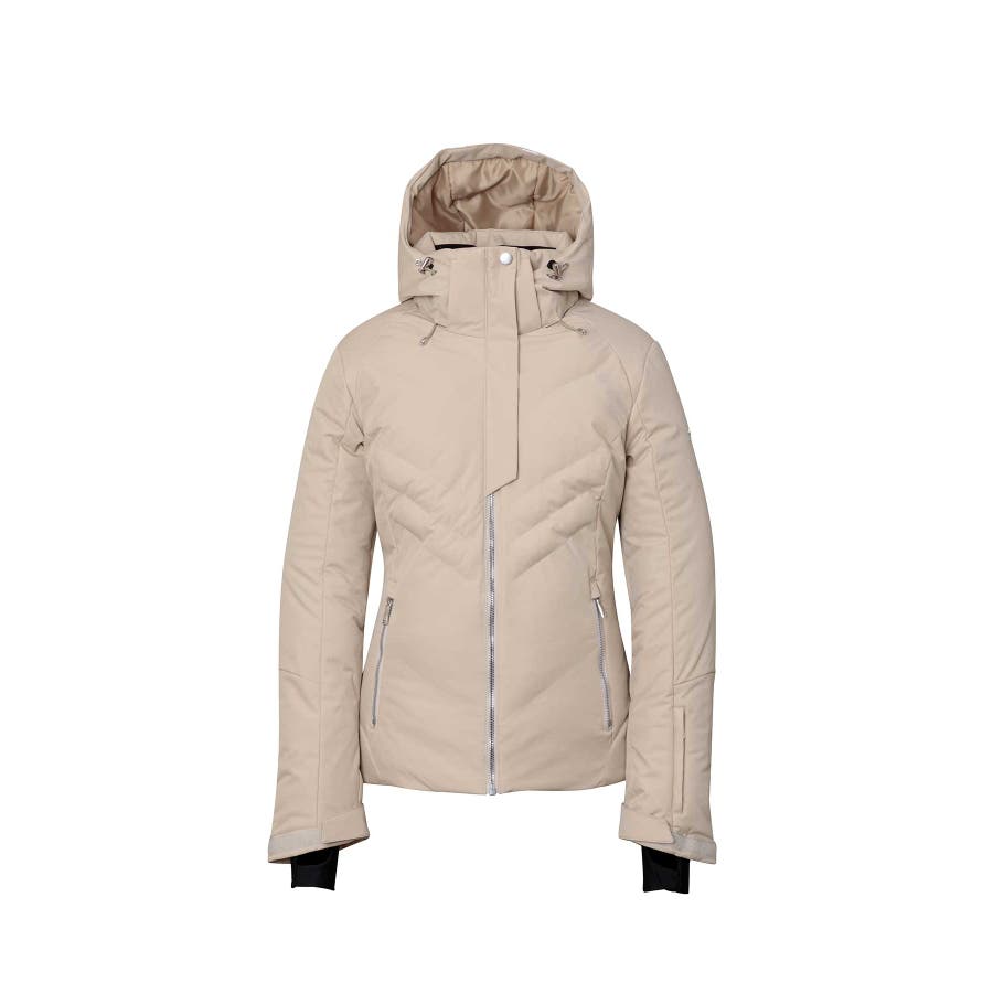 スタイリッシュに見えるデザインキルトや、シルバーアクセントが特徴的なジャケット。襟元には化粧品汚れからウエアを守るコスメガード付き。