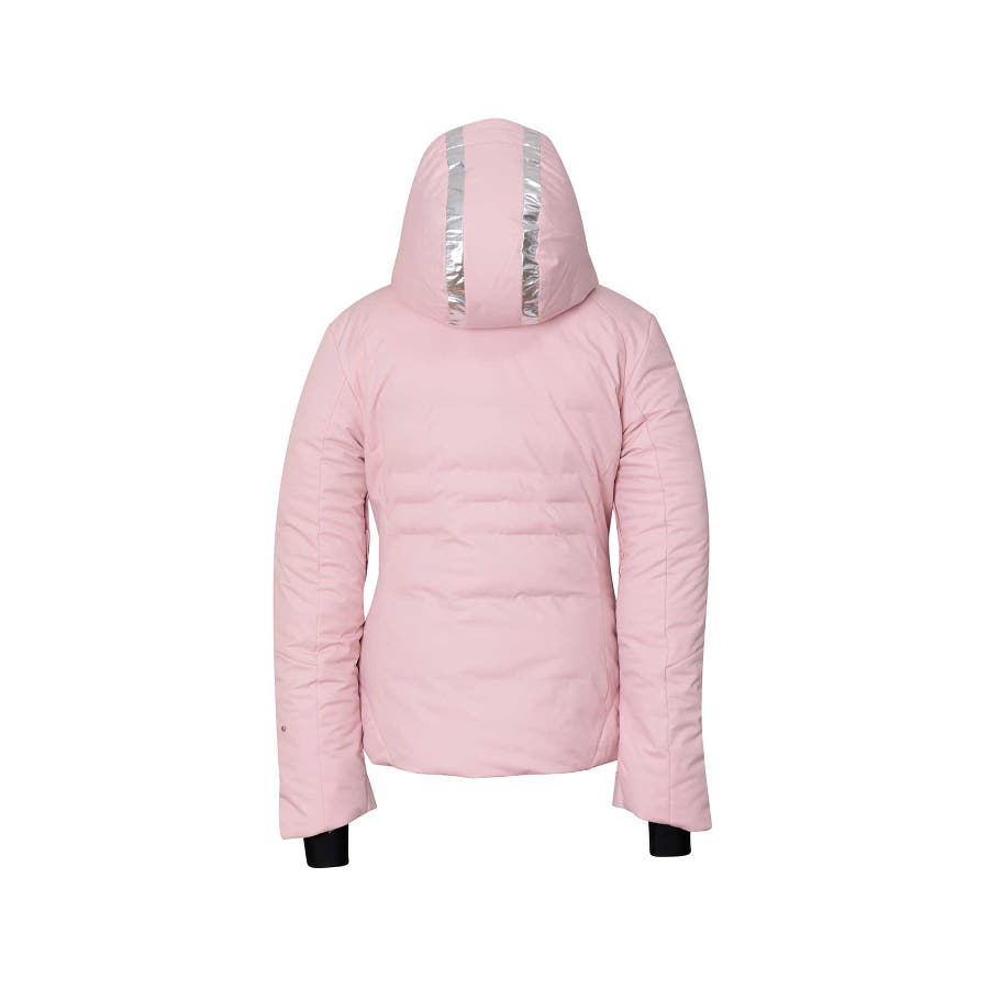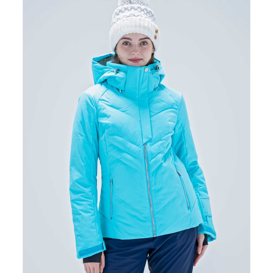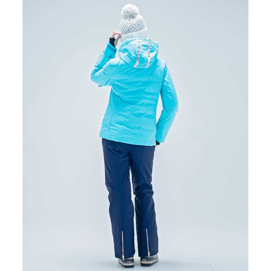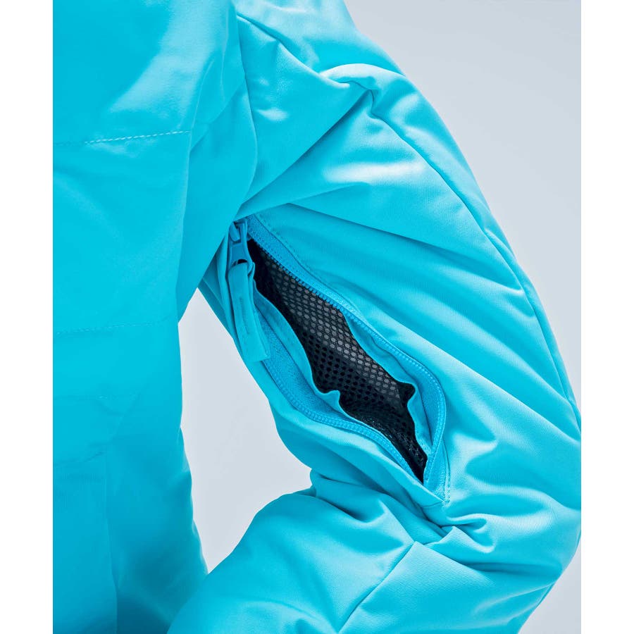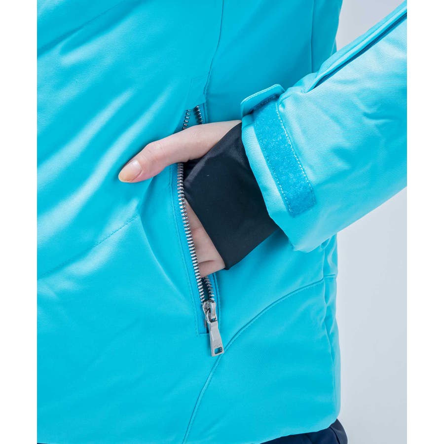 スタイリッシュに見えるデザインキルトや、シルバーアクセントが特徴的なジャケット。襟元には化粧品汚れからウエアを守るコスメガード付き。
