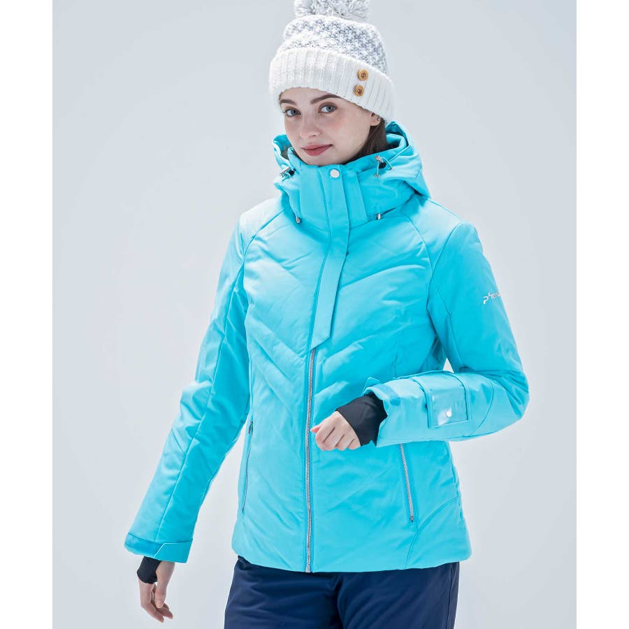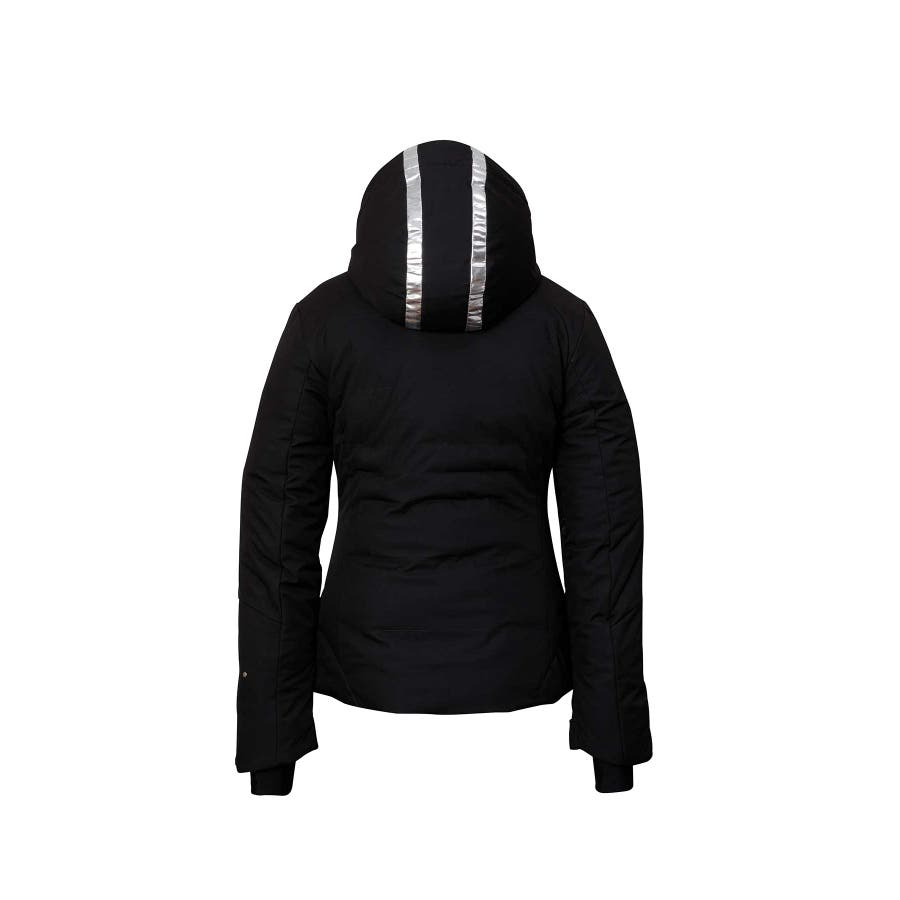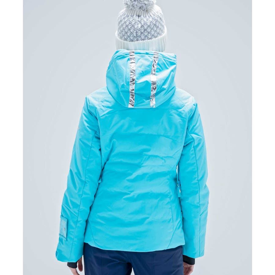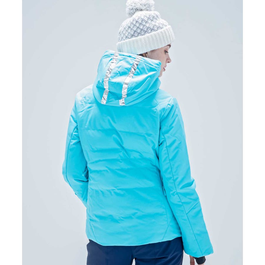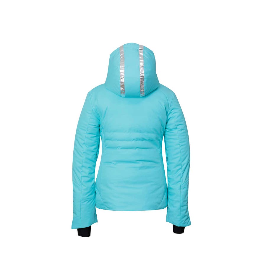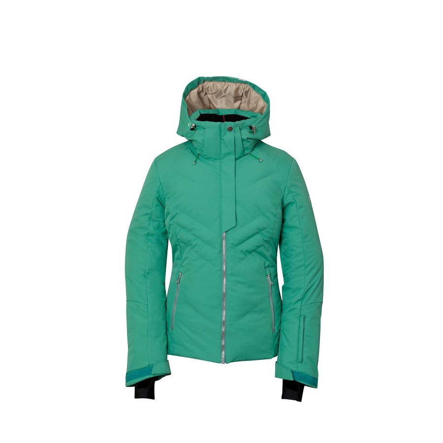 スタイリッシュに見えるデザインキルトや、シルバーアクセントが特徴的なジャケット。襟元には化粧品汚れからウエアを守るコスメガード付き。