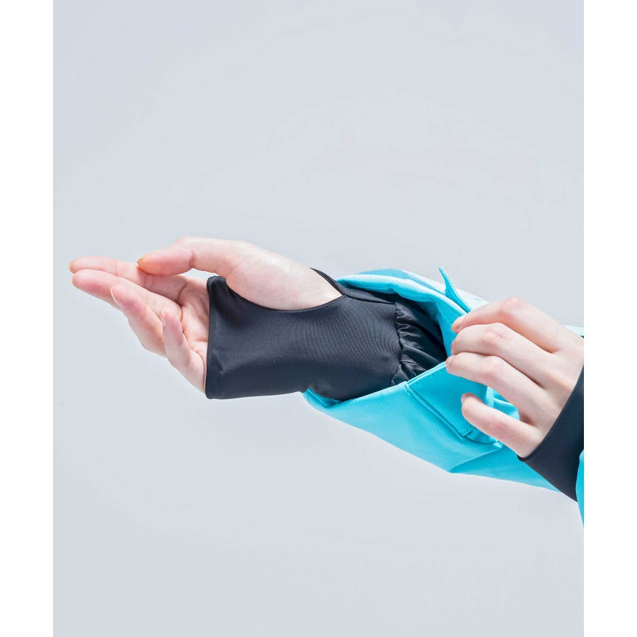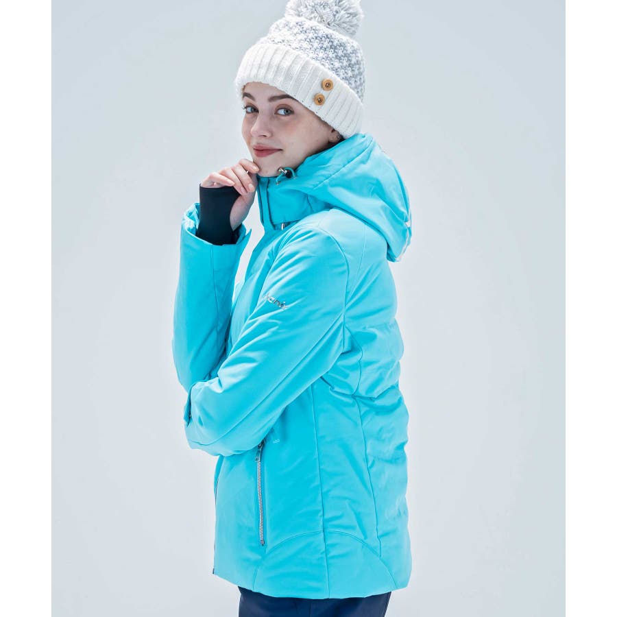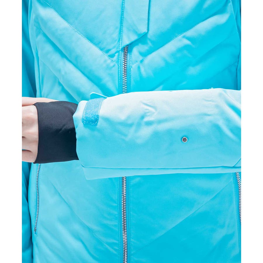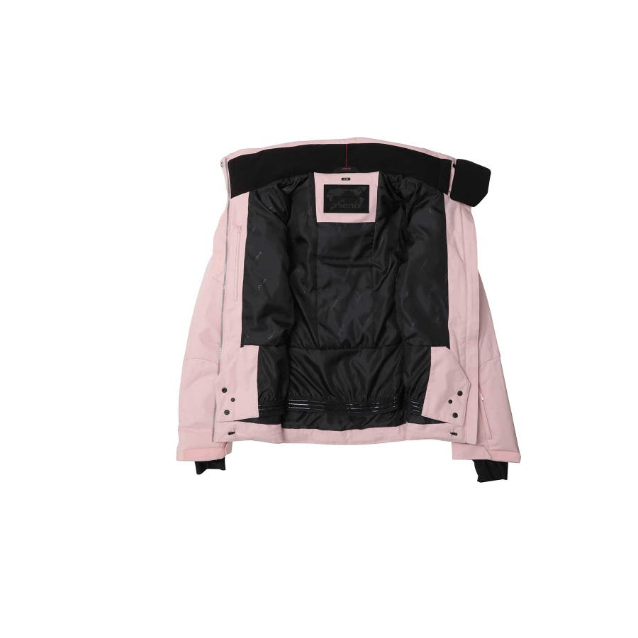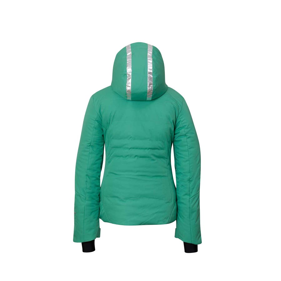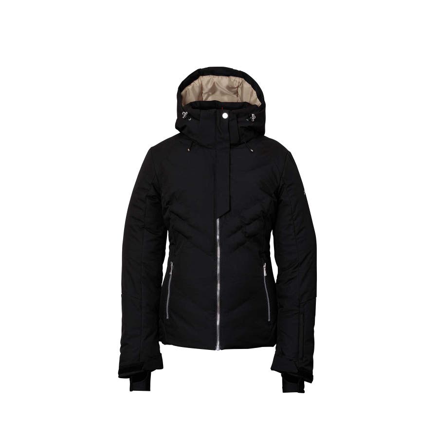 スタイリッシュに見えるデザインキルトや、シルバーアクセントが特徴的なジャケット。襟元には化粧品汚れからウエアを守るコスメガード付き。