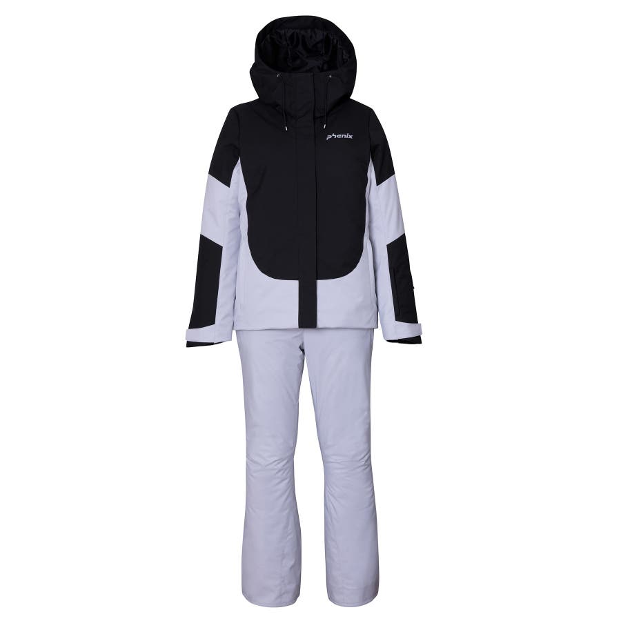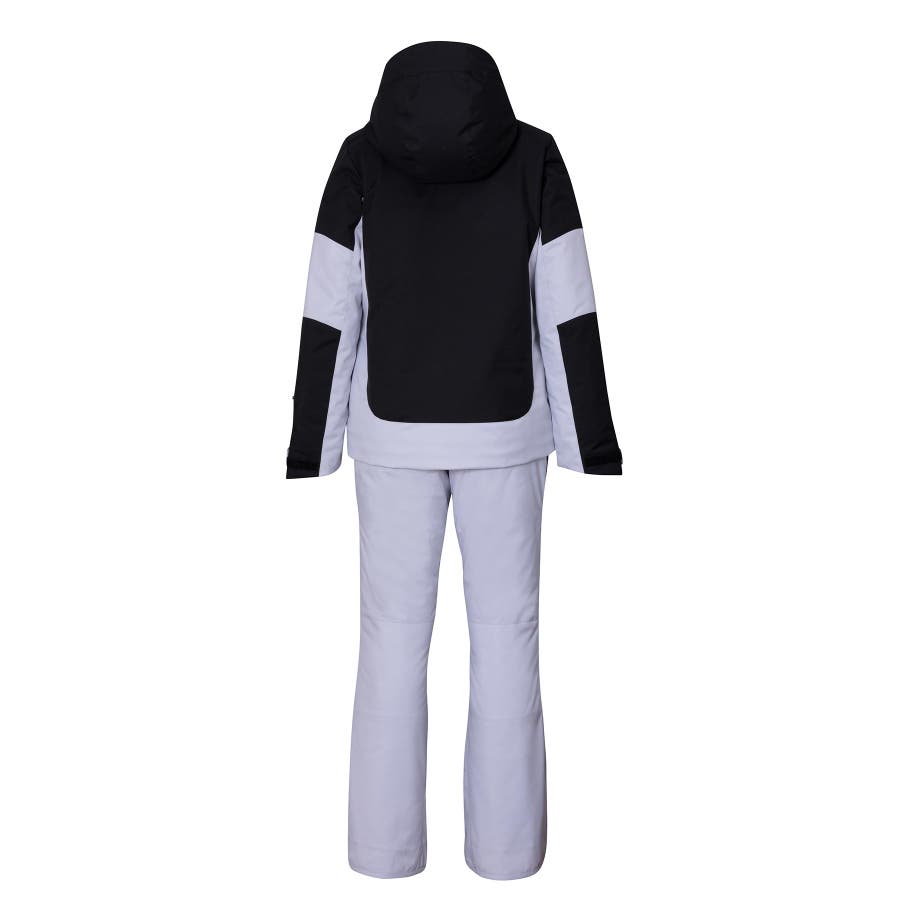 バイカラーデザインの2ピースウェアー。耐水圧10000mmの2WAYストレッチ生地を使用。取り外し可能なサスペンダーやウエスト脇のサイズ調整アジャスター付き。
