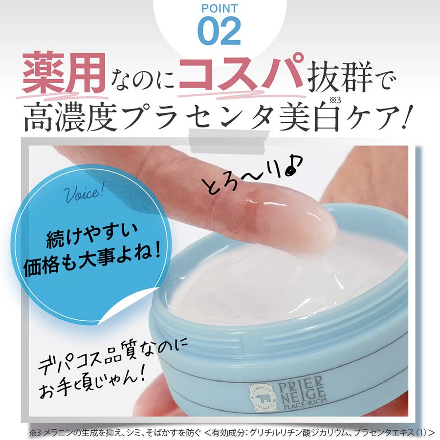 プラセンタエキス(1)&グリチルリチン酸ジカリウム配合。メラニンの生成を抑え、シミ・そばかすを防ぎます。