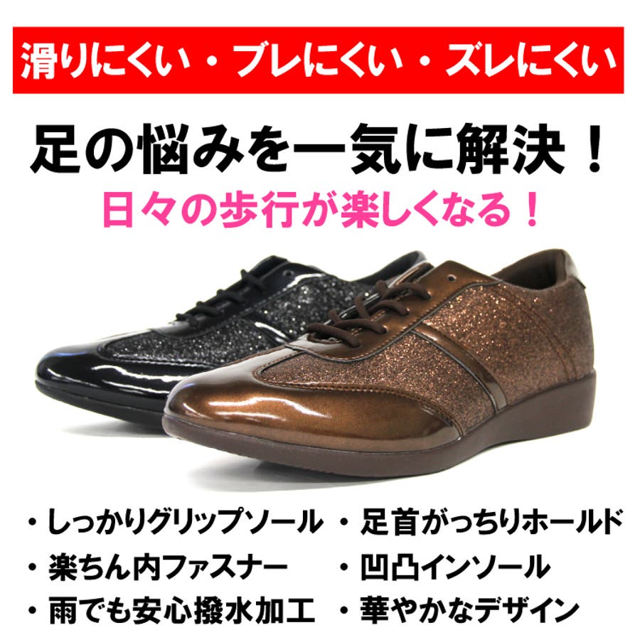 ソール部分に耐滑性が非常に高いJSTEPラバーを使用し、濡れた場所での思わぬ転倒を防ぐと共に、足元を気にせず目線を遠方に向けることで、背骨が真っ直ぐになり、姿勢が美しくなります。 ラメ素材部分には、生地の段階で水を通しにくい加工を施しました。ウォーキングシューズには見えないデザイン性の高さも人気の理由。サイドファスナーで脱着も楽ちんです。