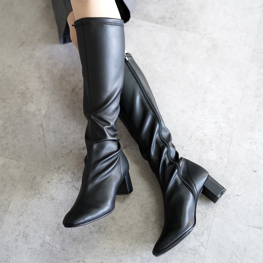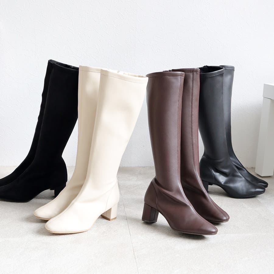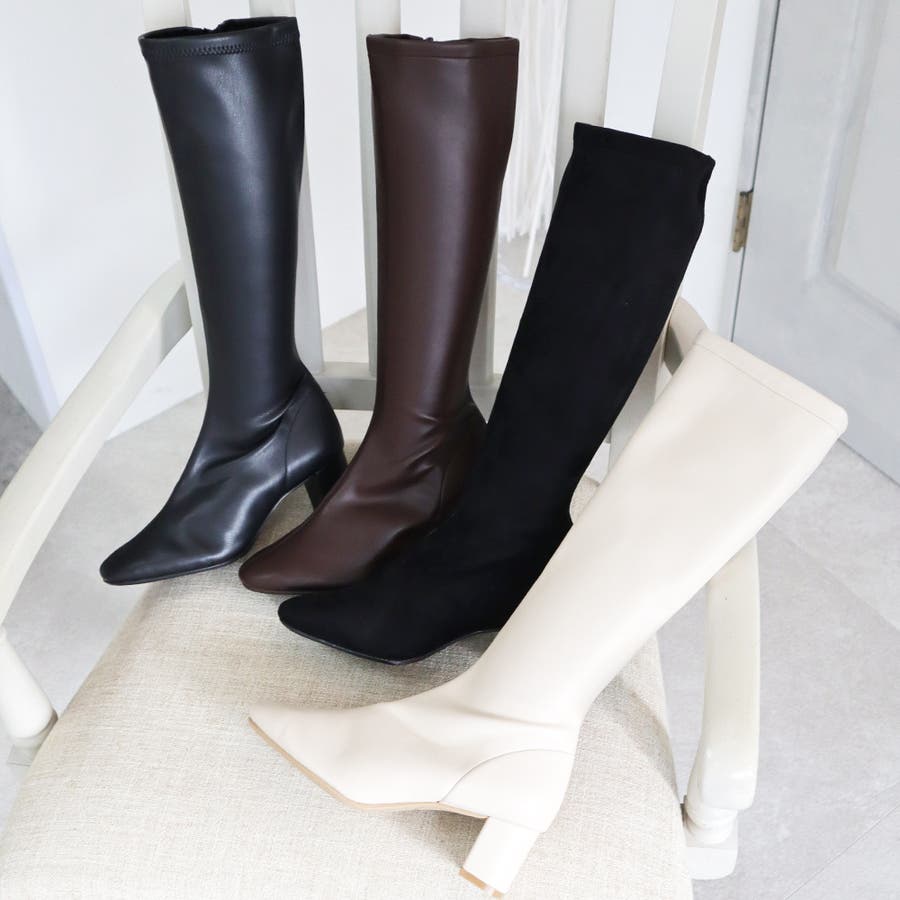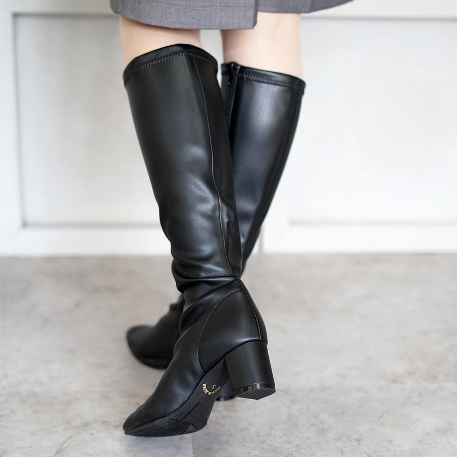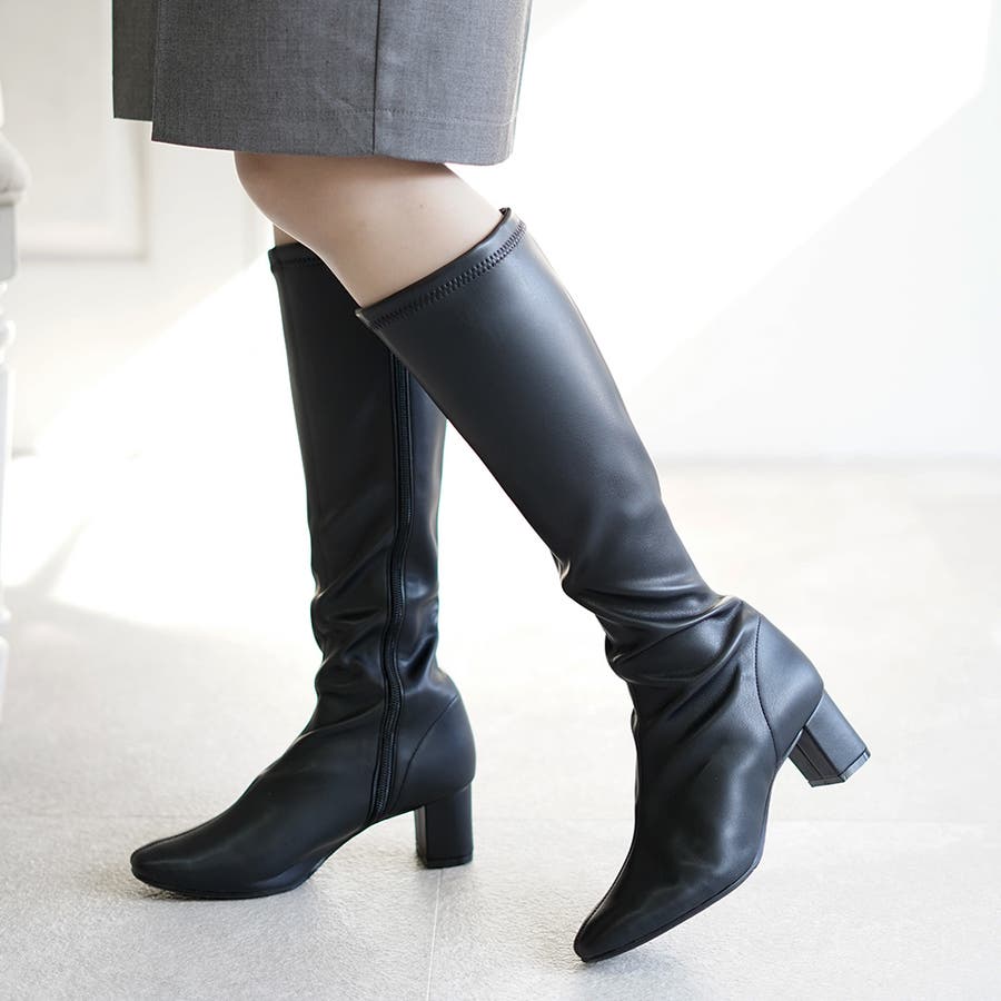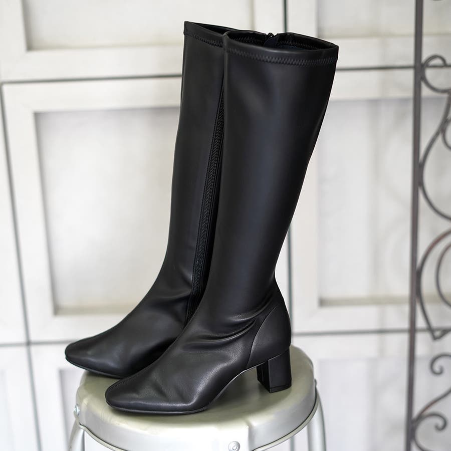 今年大人気のスクエアトゥのストレッチロングブーツです。