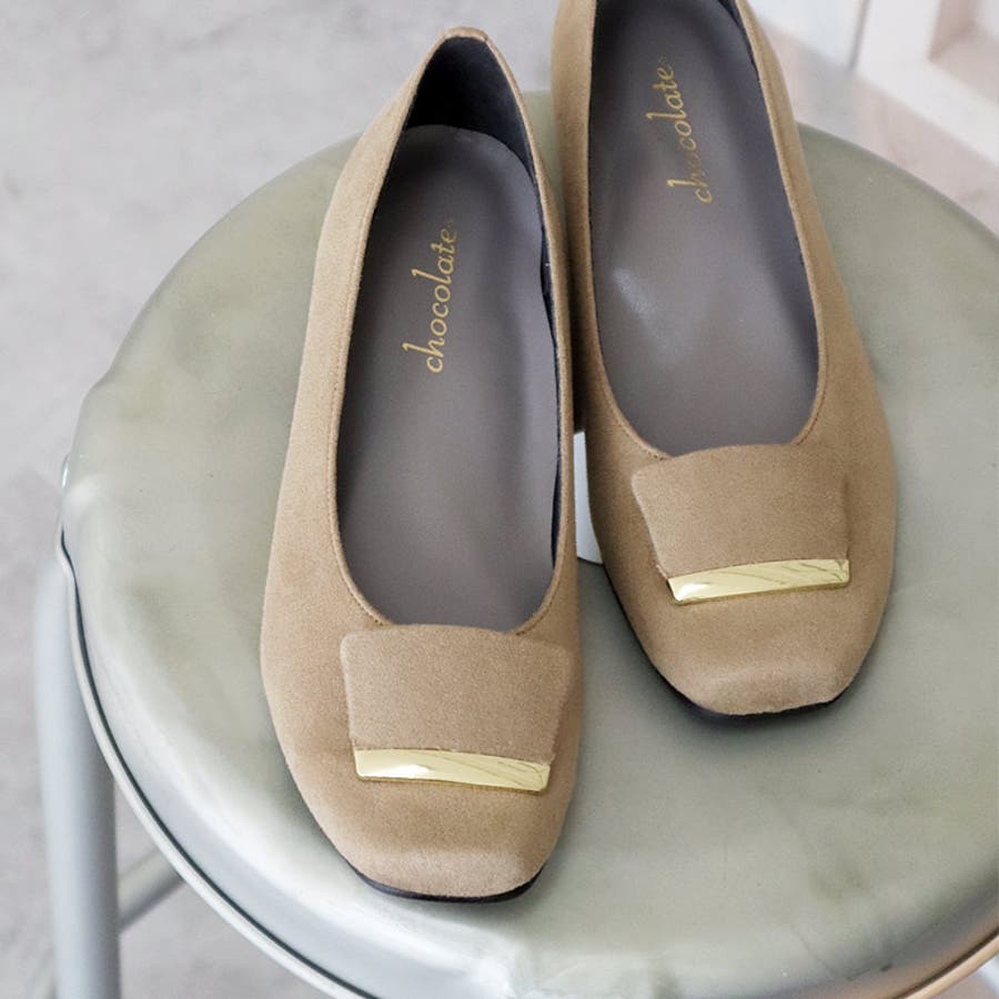 スクエアトゥの木型で作成した甲にパーツが付いたパンプスです。