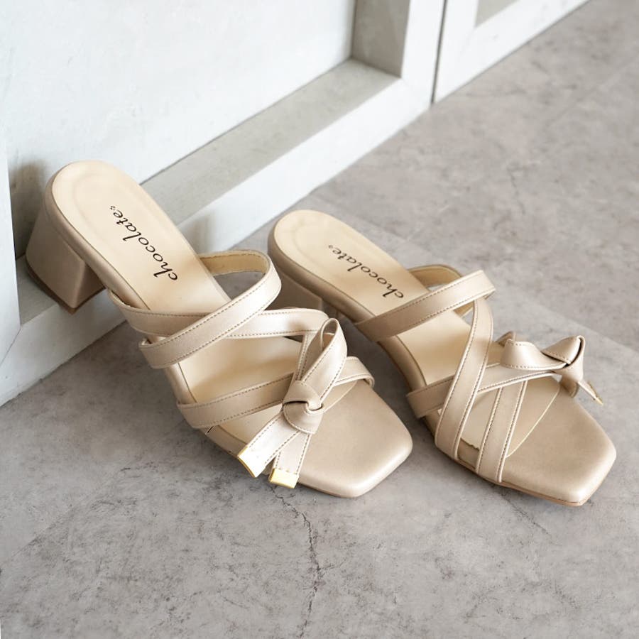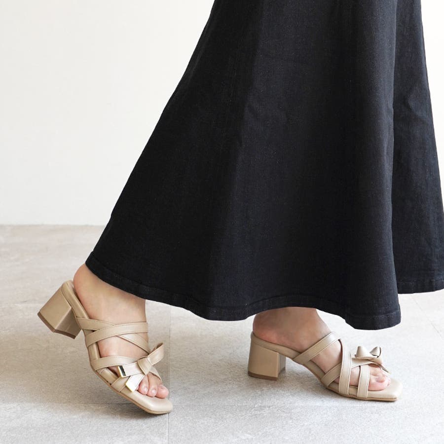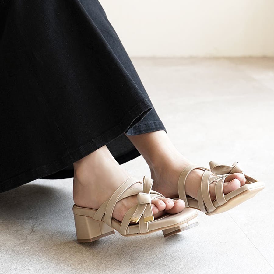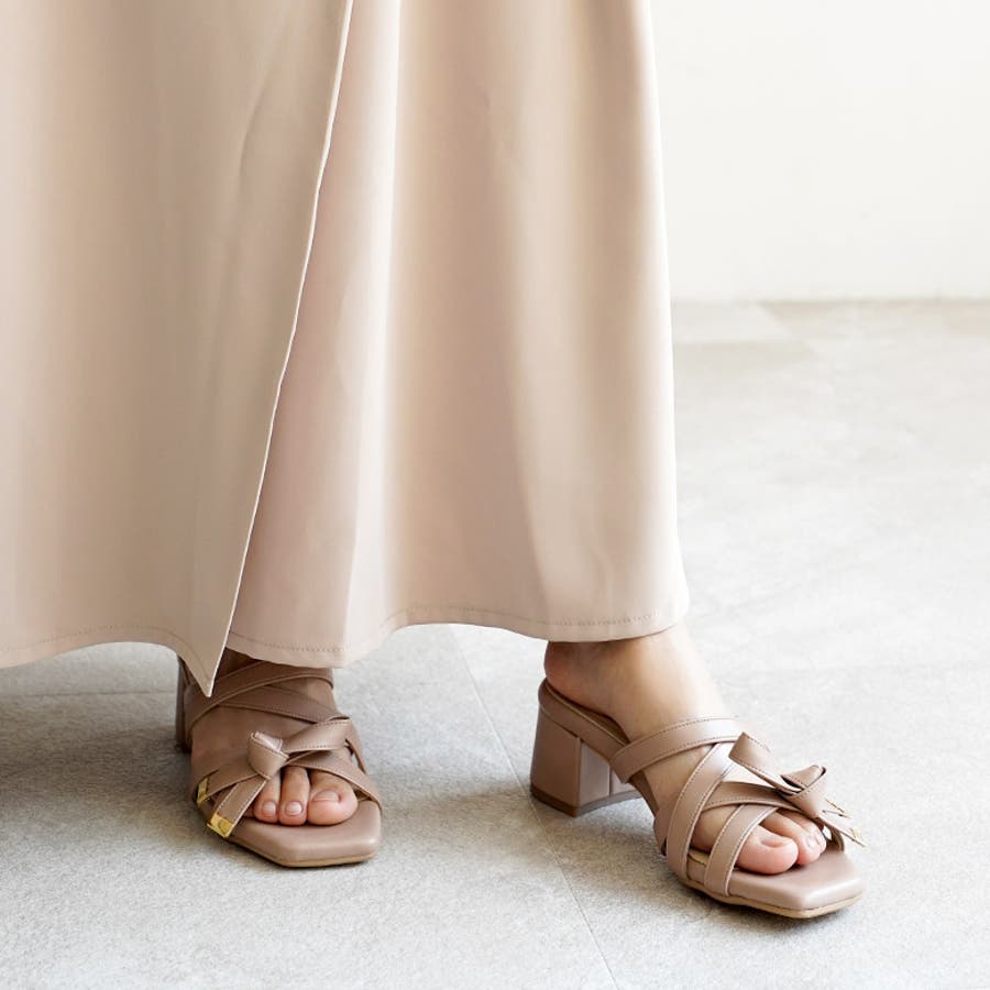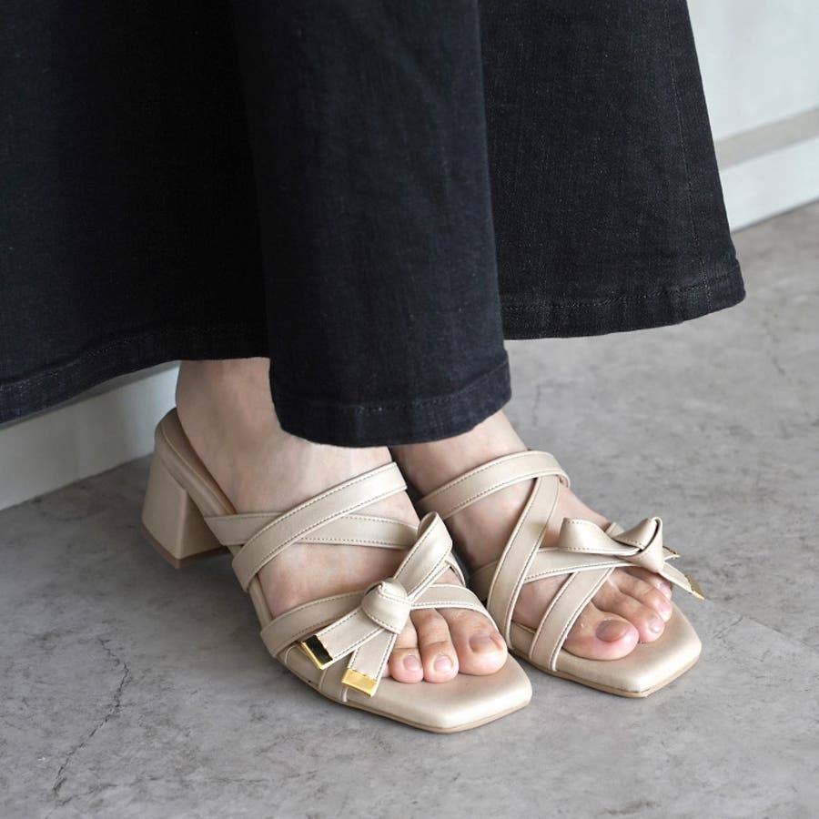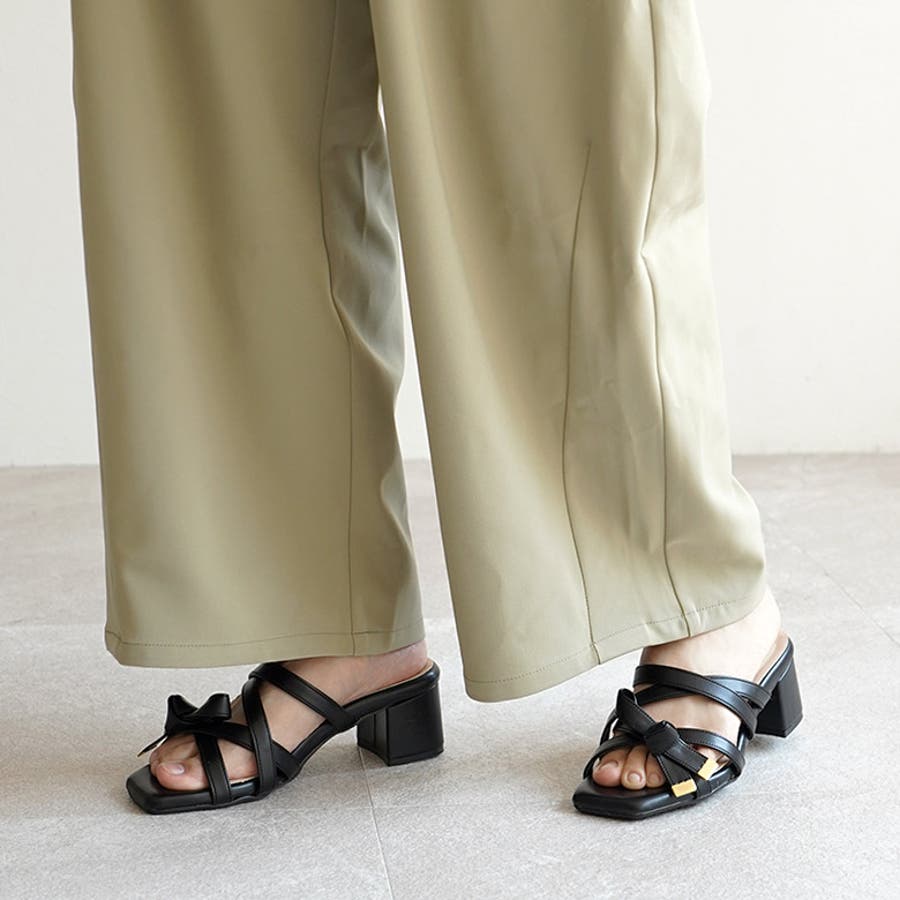 リボンの先にゴールドのパーツが付いた大人かわいいミュールです。