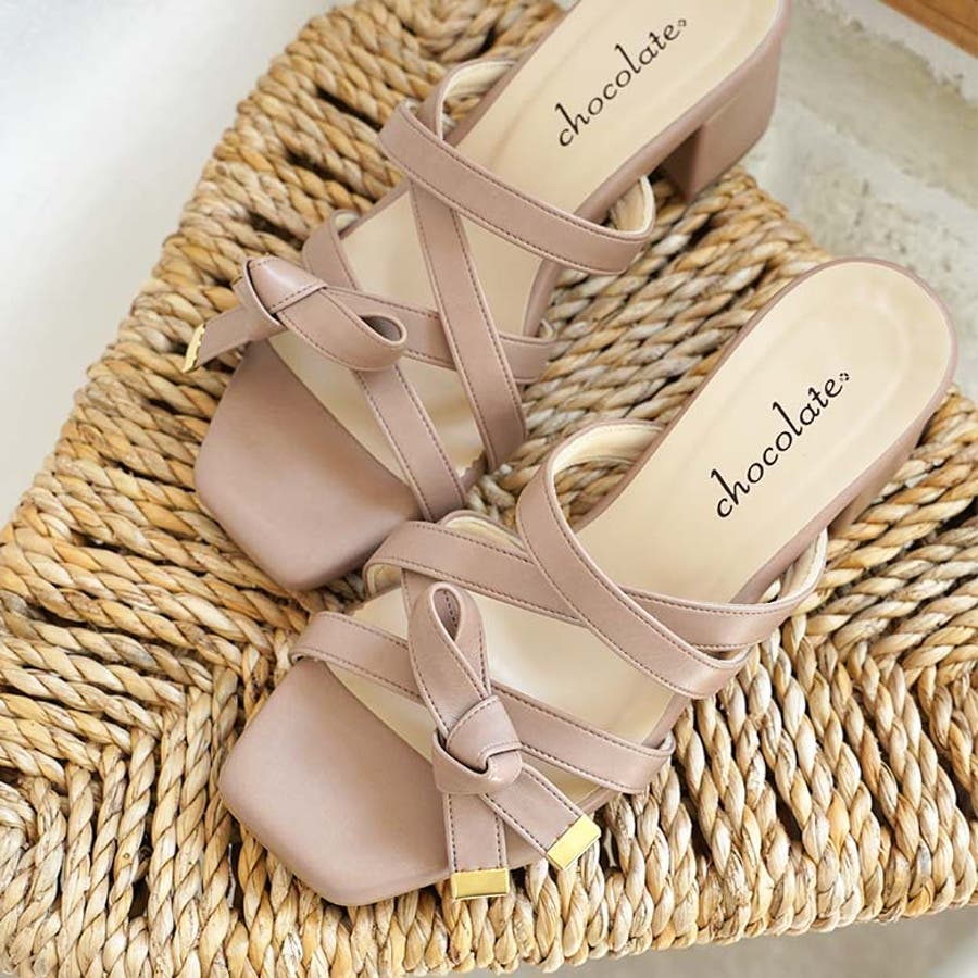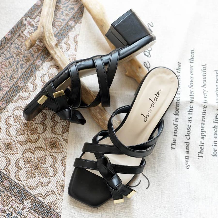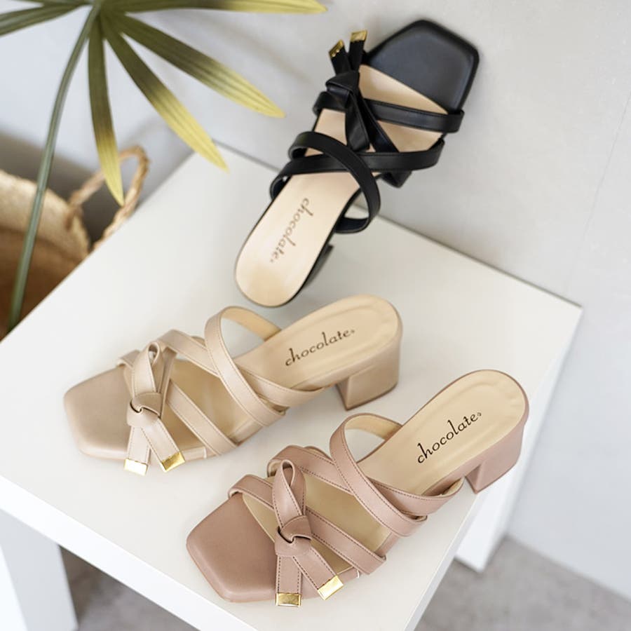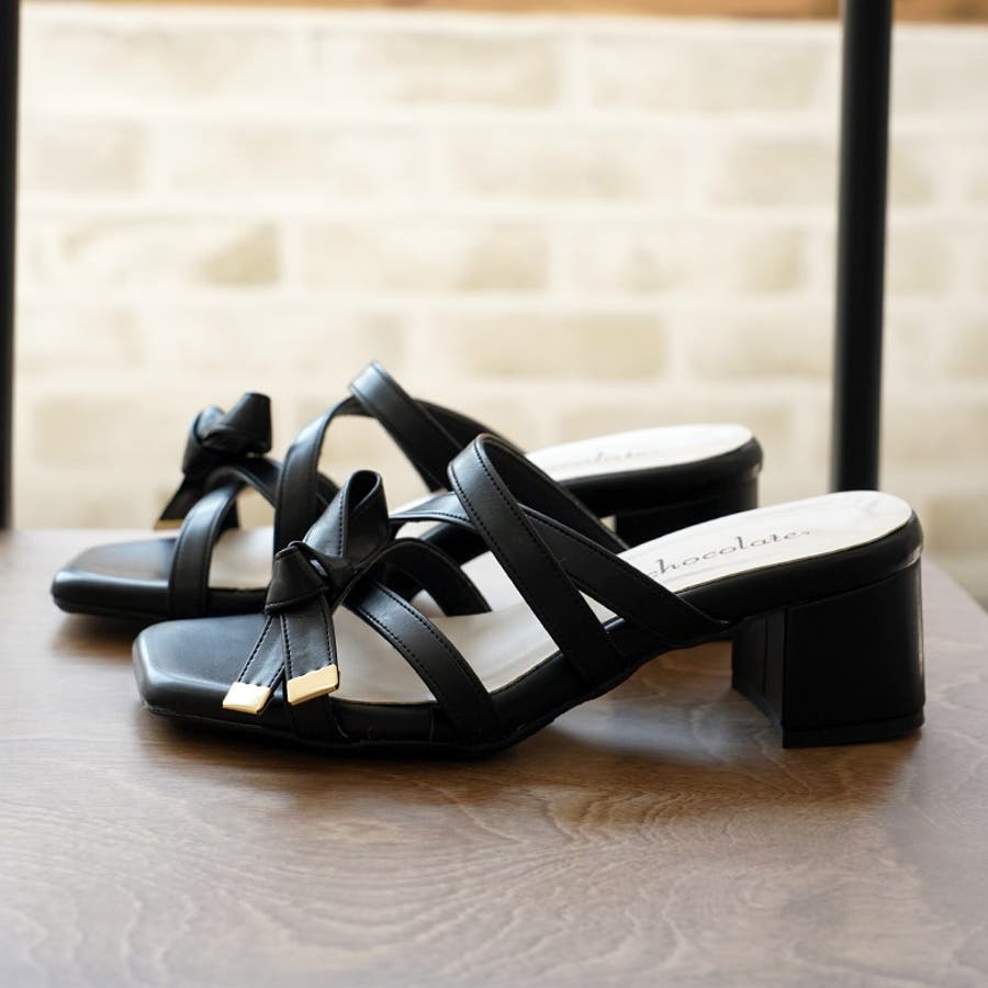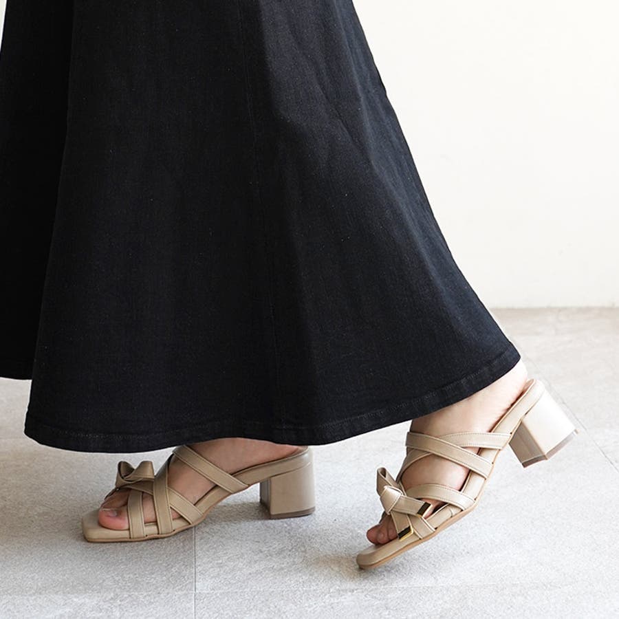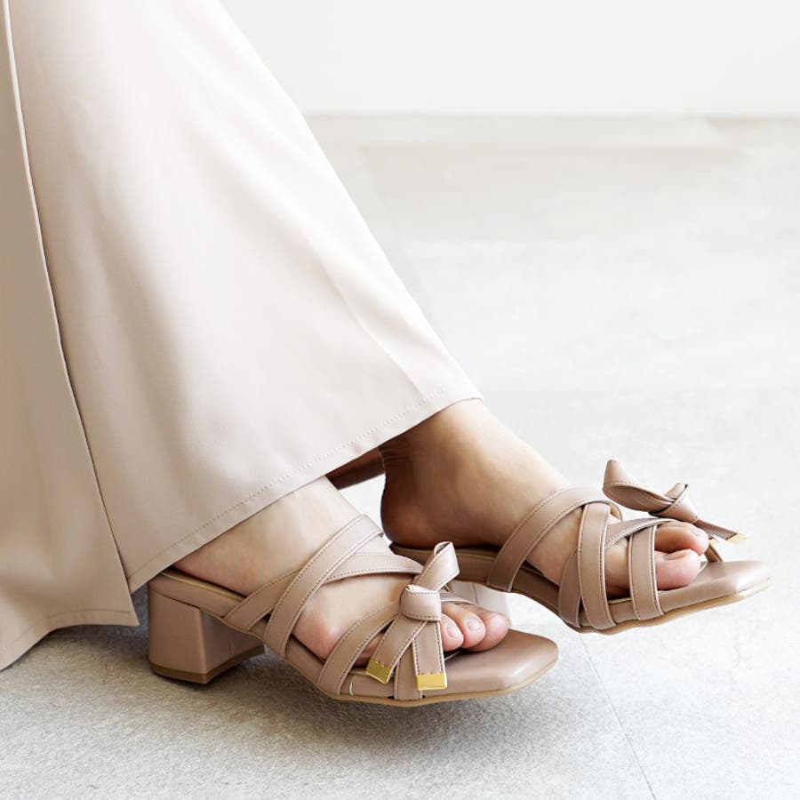 リボンの先にゴールドのパーツが付いた大人かわいいミュールです。