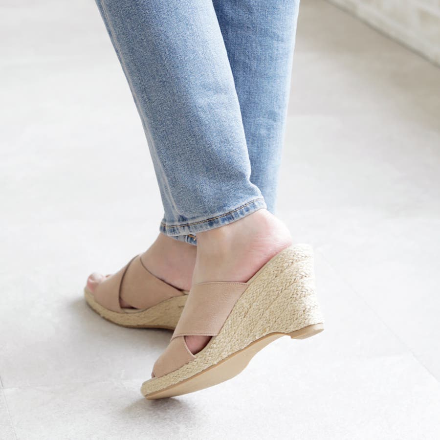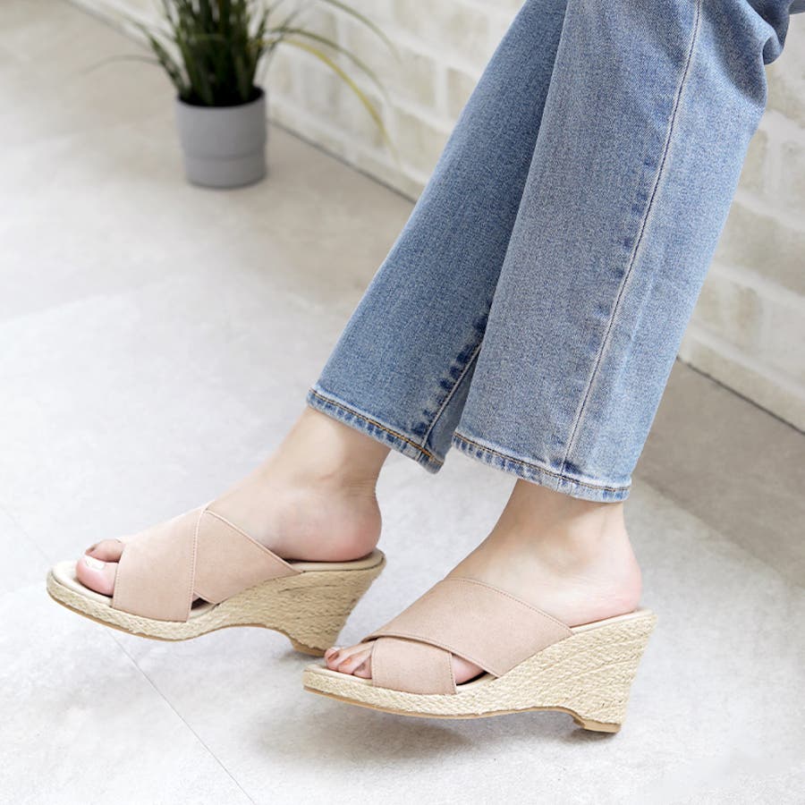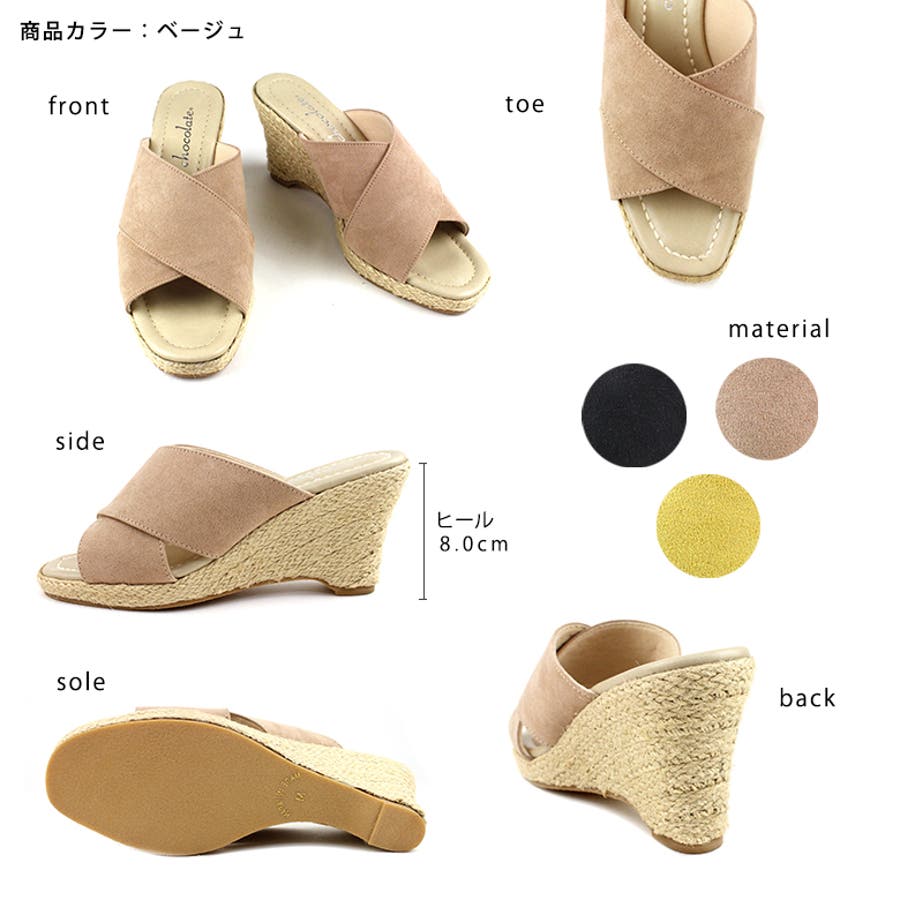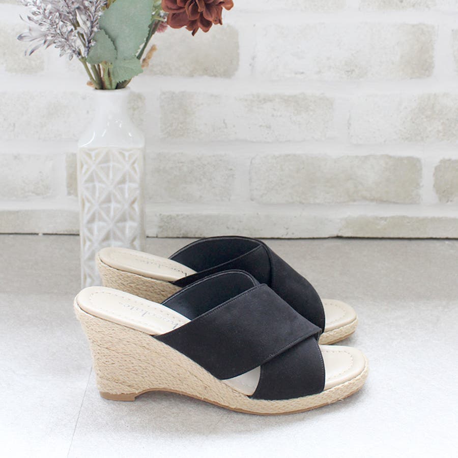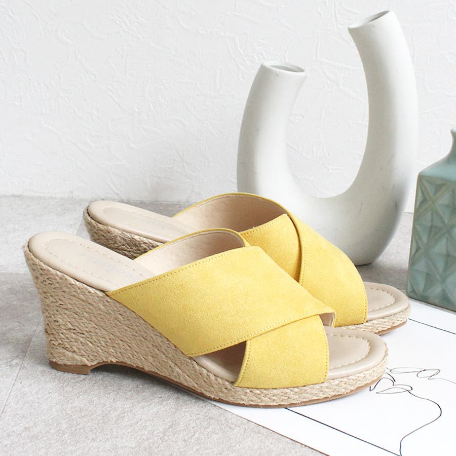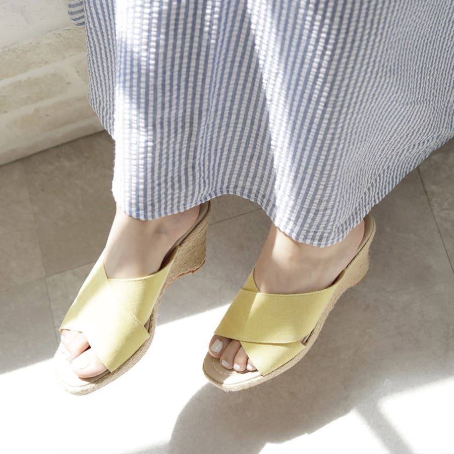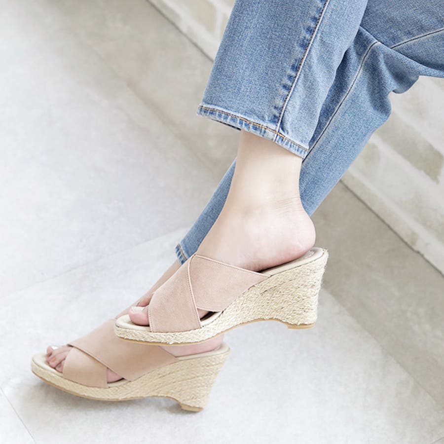 夏っぽいジュートヒールを使用したスエード素材のミュールです。