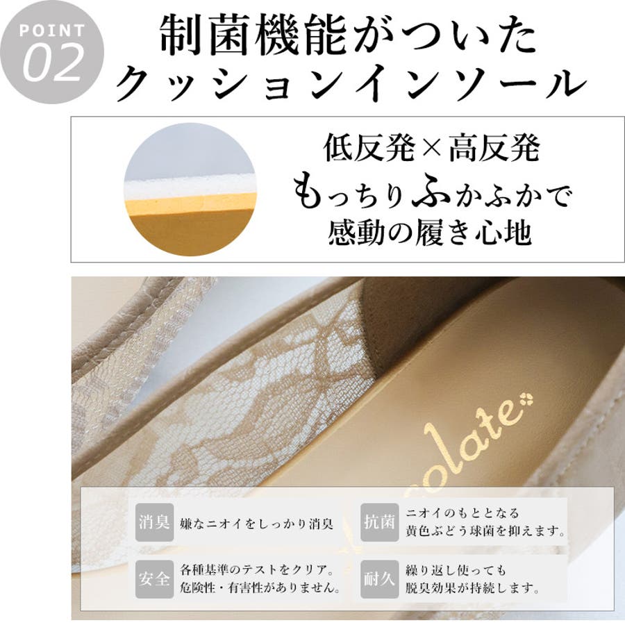 | 商品説明文 | 今年も大人気の日本製のチュールパンプスが新しい素材になりリニューアルされました。 春らしく美しいレース素材を採用しました。 柄は落ち着いた花柄です。 大人の女性にも対応出来ます落ち着いたフラワー柄です。 そして、日本製なので超軽量です。 また、通気性が抜群なので春から夏、そして秋までご愛用して頂けます。 本体は上品な日本製のスエード素材を採用しています。 底は屈曲性とグリップ性に優れた底を採用しています。 木型は幅広に設計されているので幅広の方にも対応出来ます。 中敷きは制菌機能を備えた特殊な素材を採用しています。 中敷きの素材はもっちりしており、肌さわりは最高です。 ヒールは安定感抜群の2.5cmヒールを採用しています。 接地面が広く長時間歩いても疲れません。 シンプルなデザインだからどんな服装にも合いますよ。 インソール全面に4mmの低反発クッションを敷いているので、 本当にふかふかなんです。柔らかさを追求した1足です。 今年大人気の感動チュールパンプスです。 日本製ならではの幸せな履き心地を是非お試しくださいませ。 |