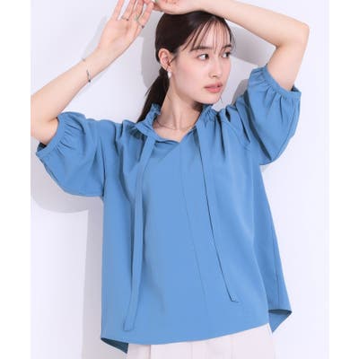 ネック部分のギャザーフリルとボウタイのデザインがポイントのブラウスです。