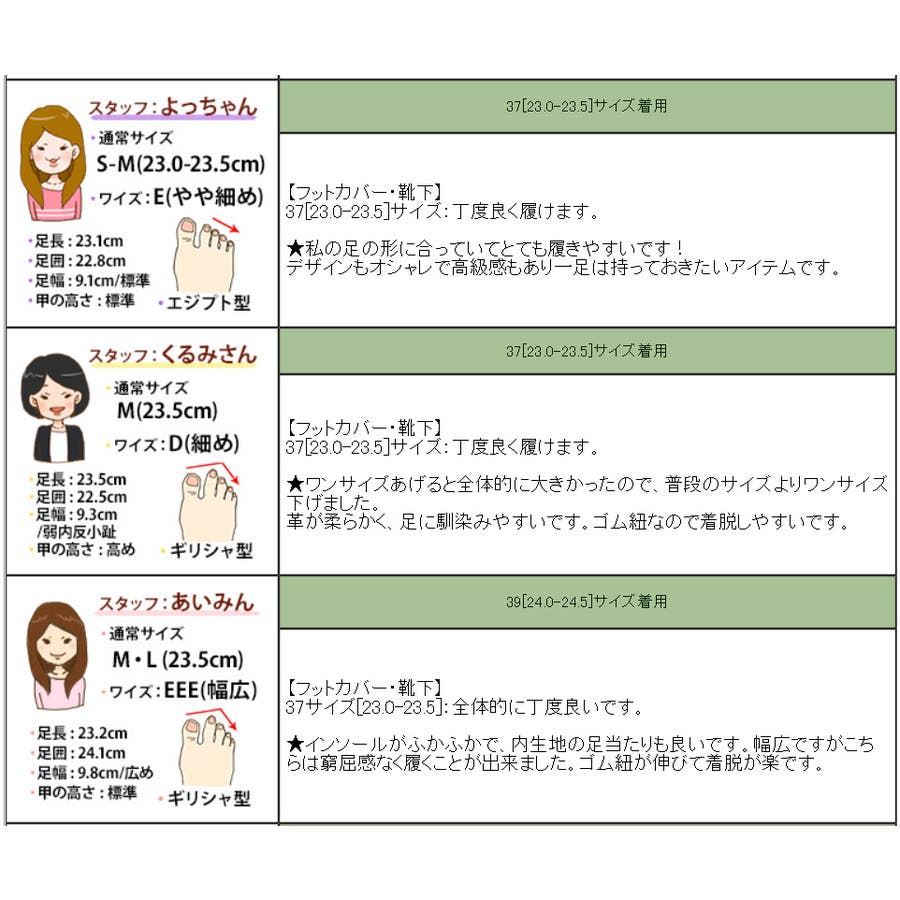 | くるみさん Lサイズ 23.5・24.0cm 足長:23.5cm 足囲:22.5cm/ワイズ:D(細め) 足幅:9.8cm/弱内反小趾 甲の高さ:高め | 【フットカバー・靴下】 37[23.0-23.5]サイズ:丁度良く履けます。 ★ワンサイズあげると全体的に大きかったので、普段のサイズよりワンサイズ下げました。 革が柔らかく、足に馴染みやすいです。ゴム紐なので着脱しやすいです。 |
