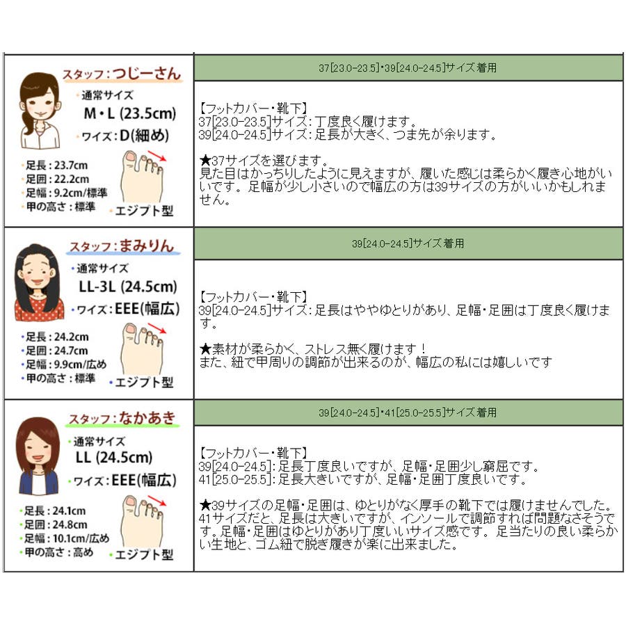 | なかあき 3L・4Lサイズ 25.0・25.5cm 足長:24.1cm 足囲:24.8cm/ワイズ:EEE(幅広) 足幅:10.1cm/広め 甲の高さ:高め | 【フットカバー・靴下】 39[24.0-24.5]:足長丁度良いですが、足幅・足囲少し窮屈です。 41[25.0-25.5]:足長大きいですが、足幅・足囲丁度良いです。 ★39サイズの足幅・足囲は、ゆとりがなく厚手の靴下では履けませんでした。41サイズだと、足長は大きいですが、インソールで調節すれば問題なさそうです。足幅・足囲はゆとりがあり丁度いいサイズ感です。足当たりの良い柔らかい生地と、ゴム紐で脱ぎ履きが楽に出来ました。 |