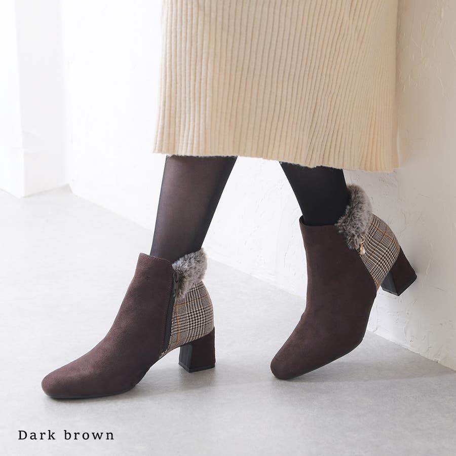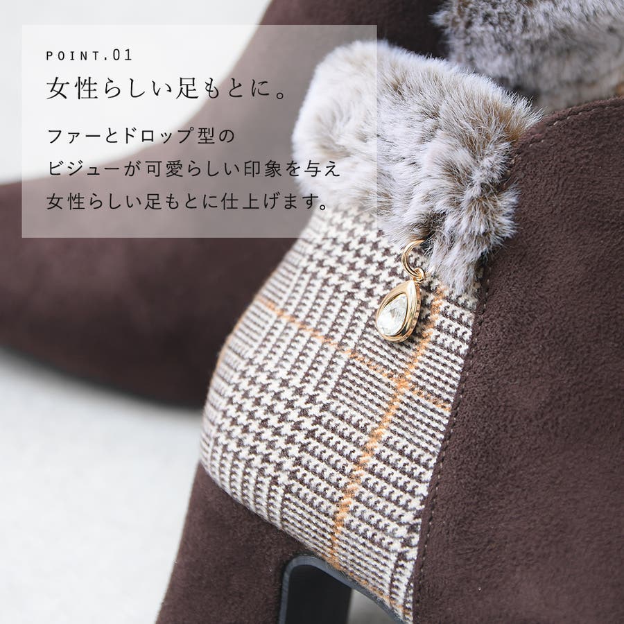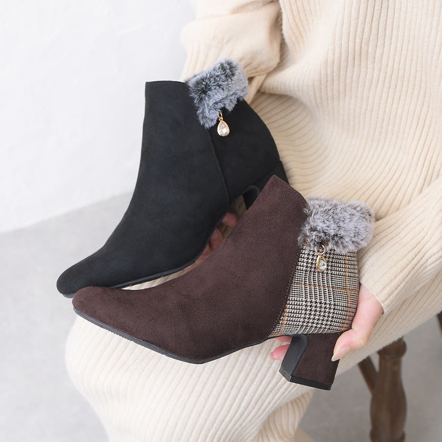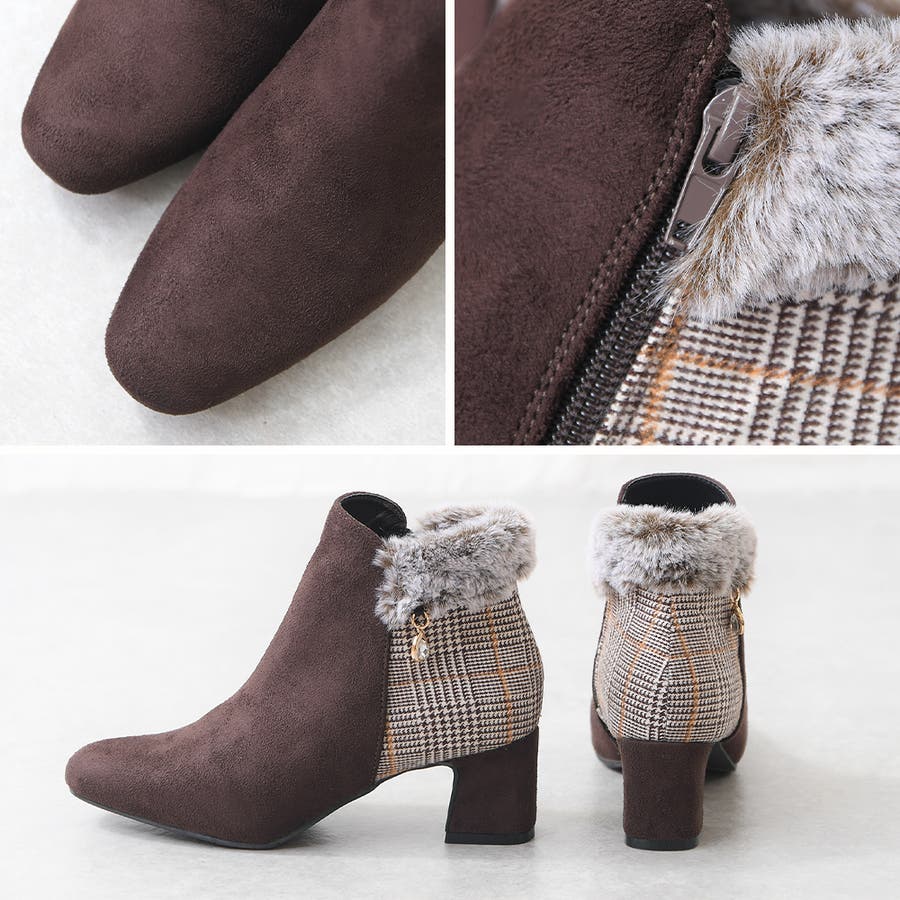 2023秋新作 ブーツ ショートブーツ レディース ブーティ― スクエアトゥ スエード ファー ビジュー ミドルヒール 歩きやすい 軽い 痛くない 可愛い ガーリー チェック ブラック ブラウン 黒 秋 冬