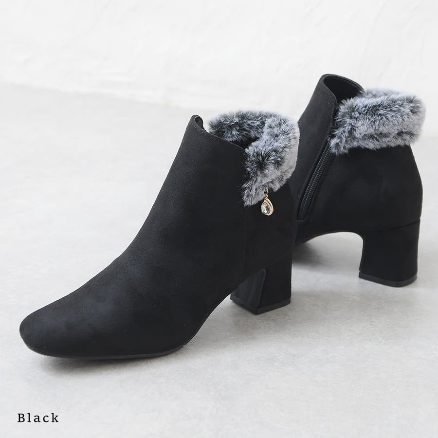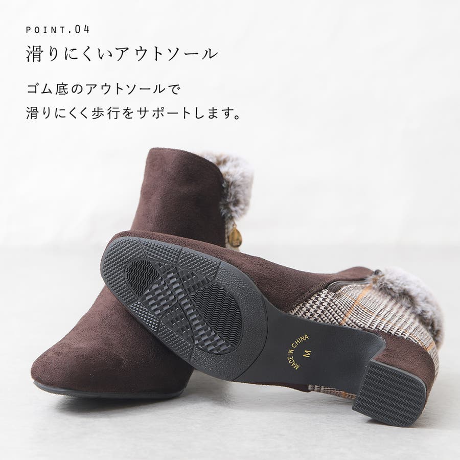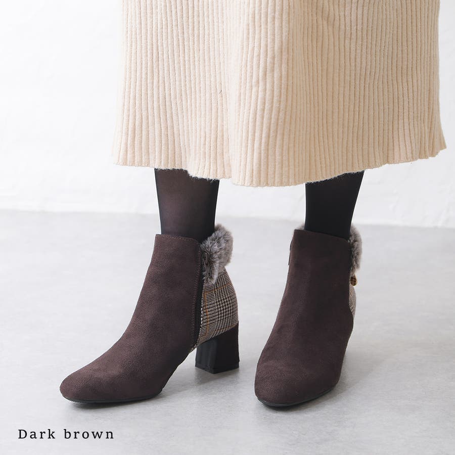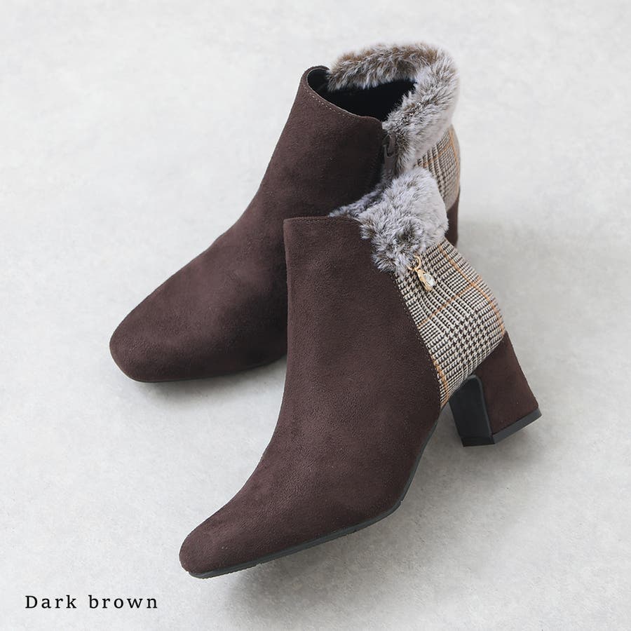 2023秋新作 ブーツ ショートブーツ レディース ブーティ― スクエアトゥ スエード ファー ビジュー ミドルヒール 歩きやすい 軽い 痛くない 可愛い ガーリー チェック ブラック ブラウン 黒 秋 冬