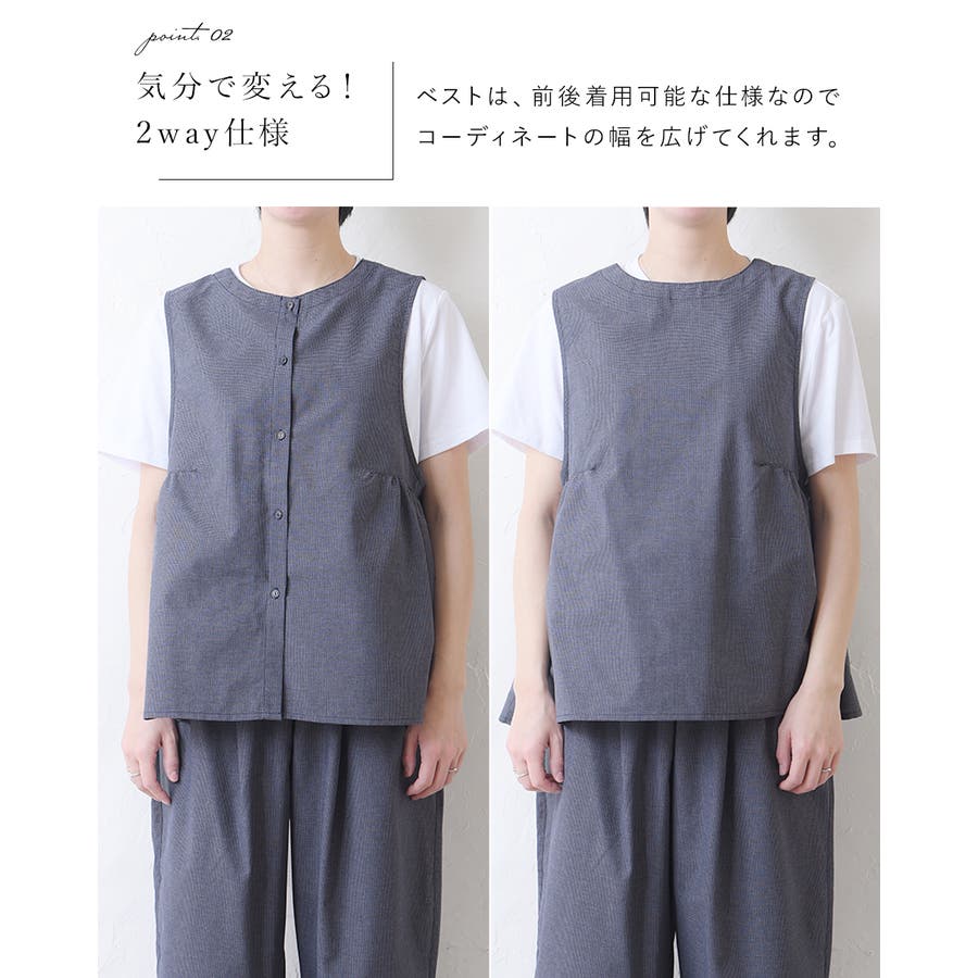 ベストとパンツのセットアップで簡単お洒落コーデに。