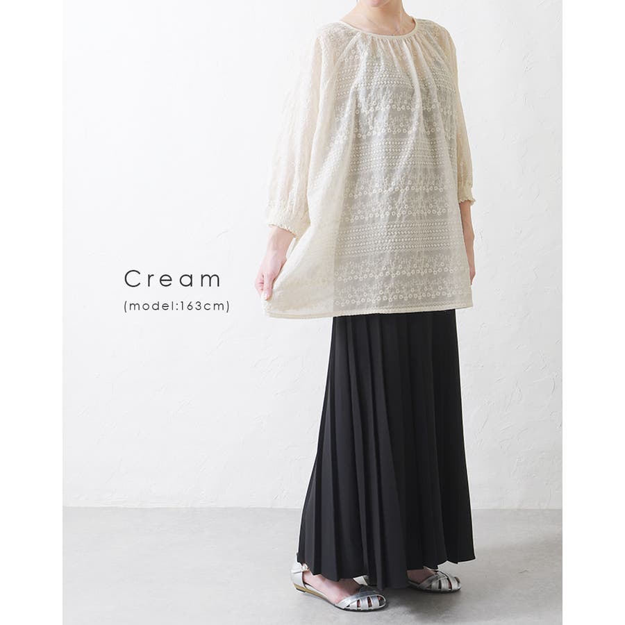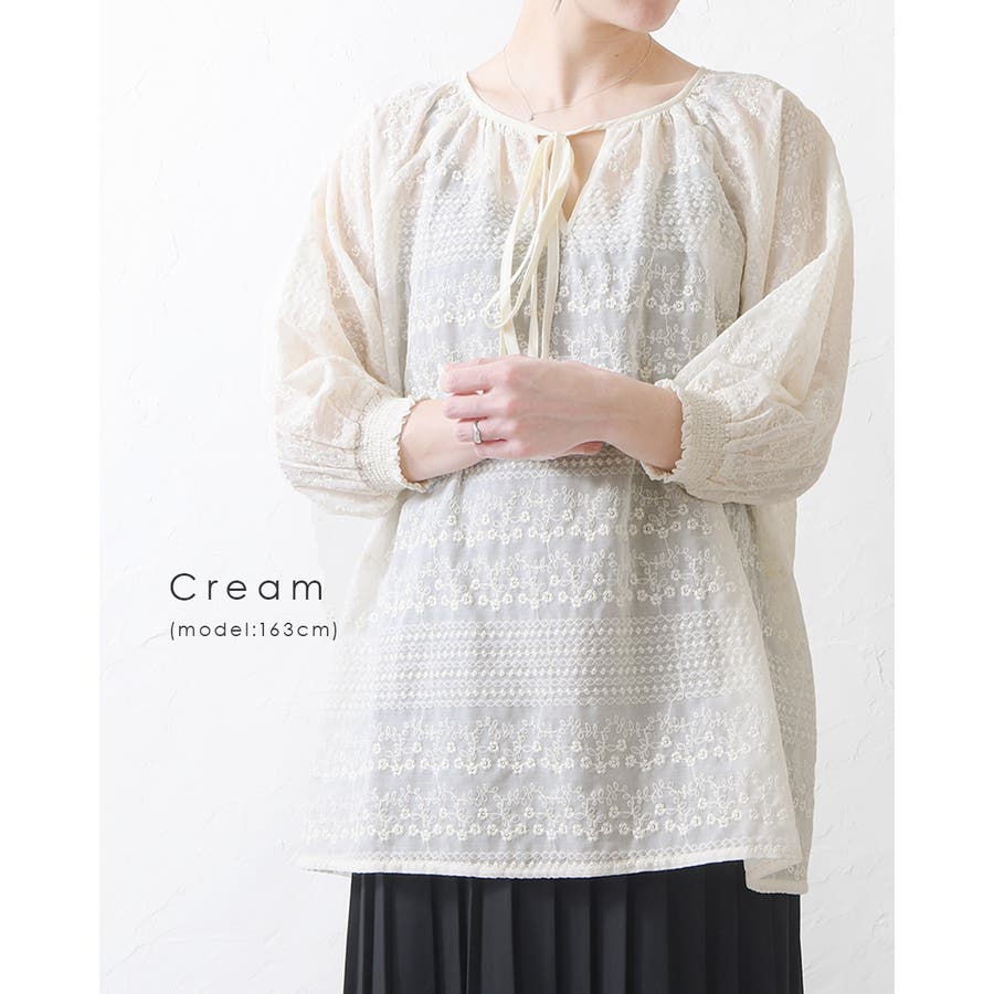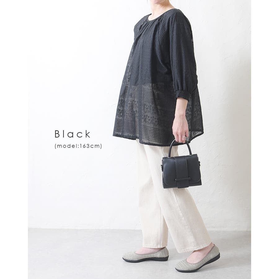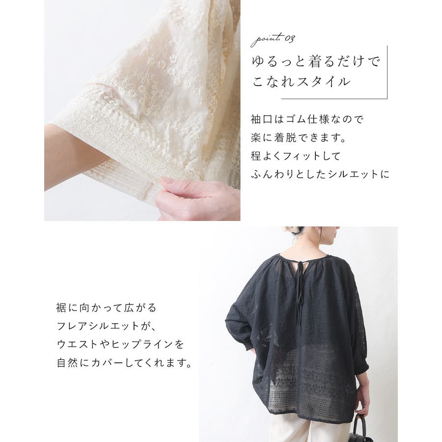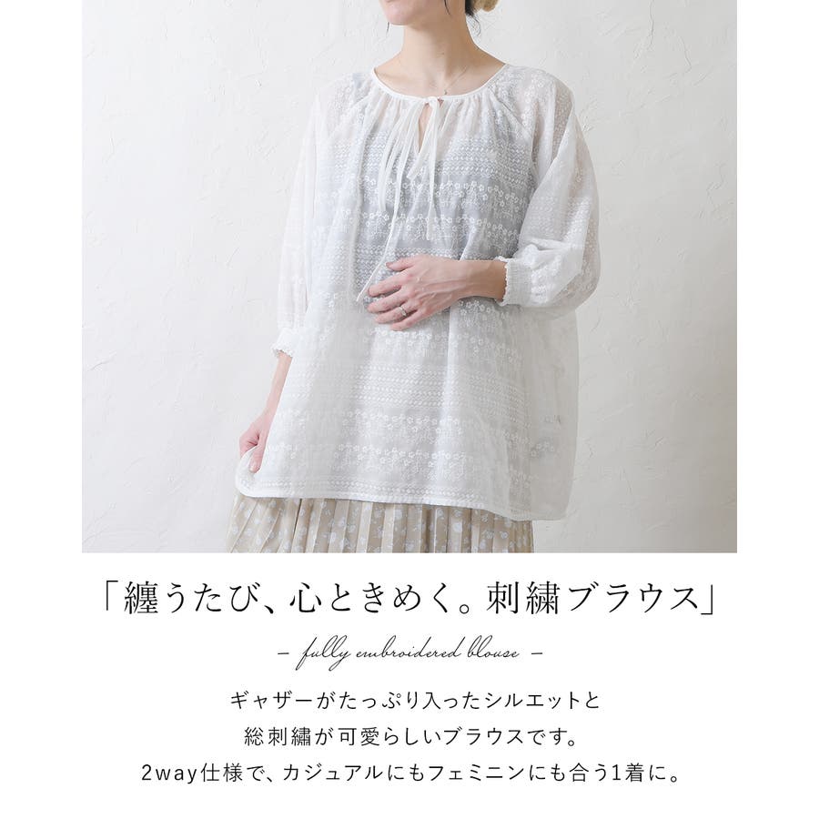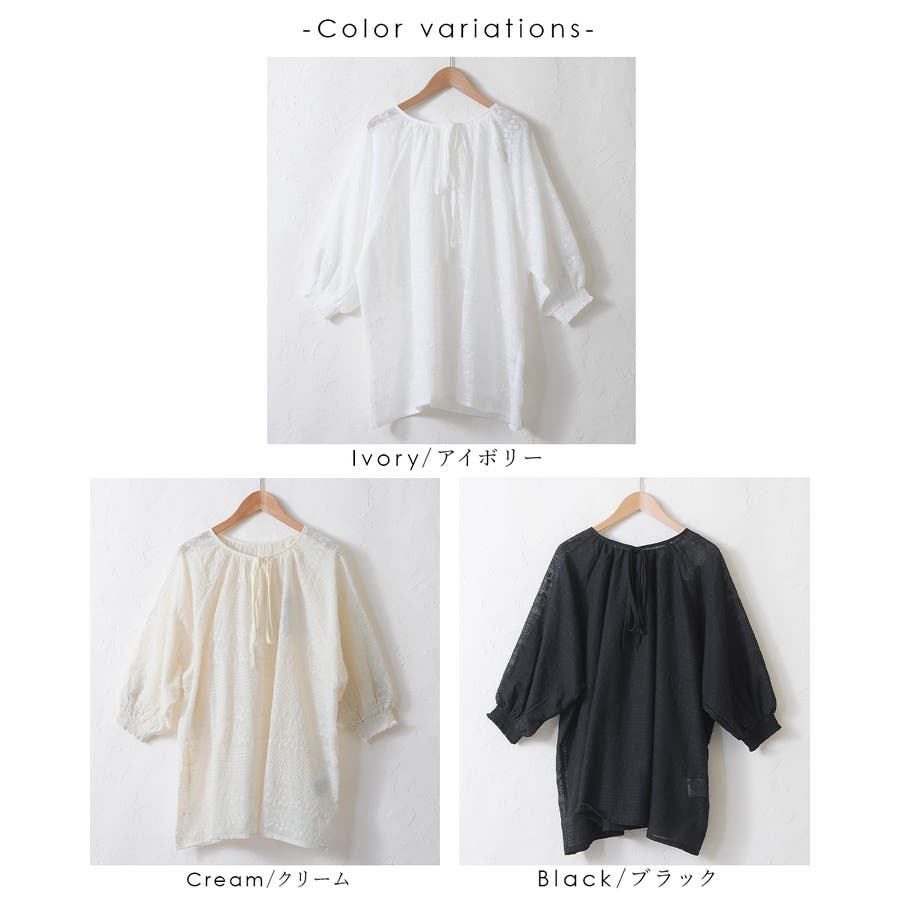 ブラウス レディース トップス 五分袖 刺繍 ギャザー プルオーバー シアー 前後着用 2way フェミニン カジュアル オフィス ゆったり 大人可愛い 大人 ナチュラル 無地 おしゃれ 黒 白 春 夏