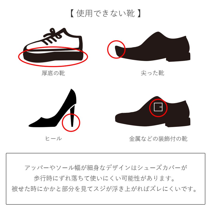 ・カバーを靴に履かせたままや、カバーが伸びた状態で放置されると商品の劣化、または靴を傷めてしまう可能性があります。