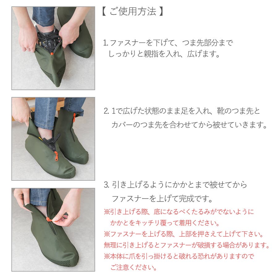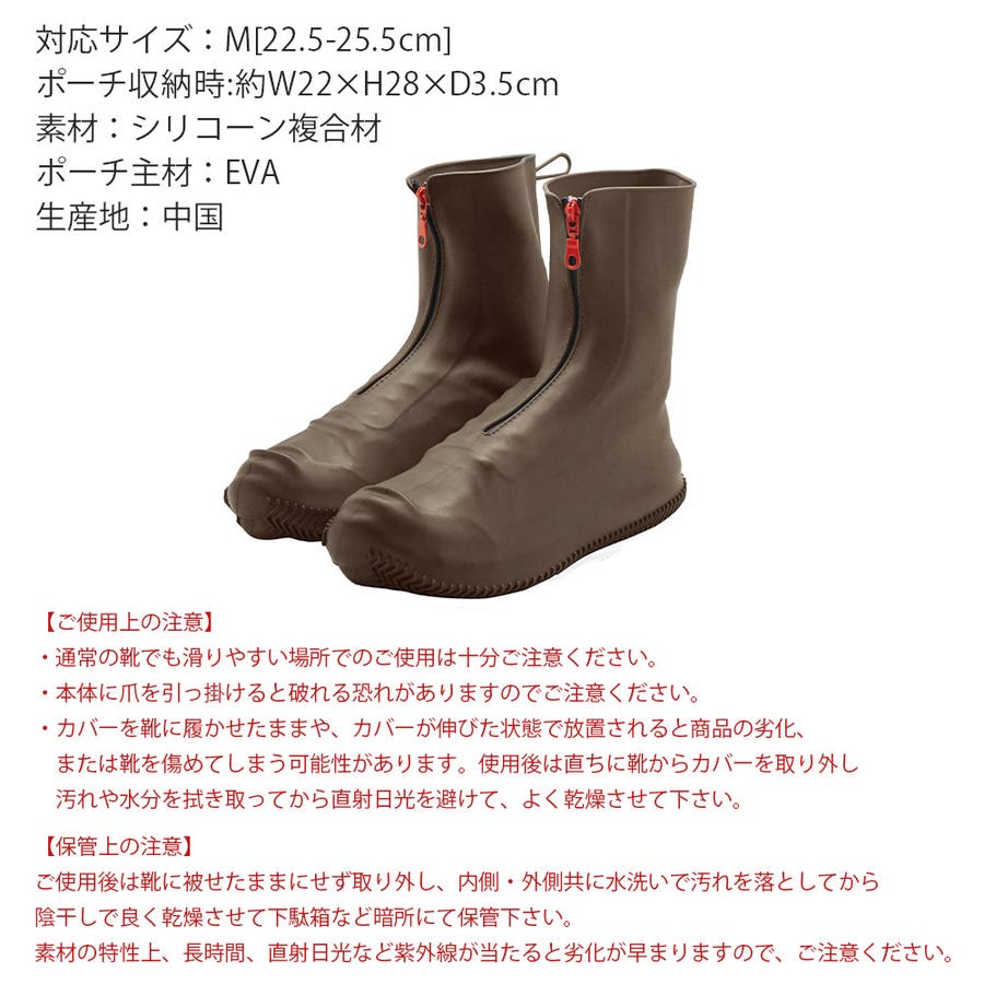 ご使用後は靴に被せたままにせず取り外し、内側・外側共に水洗いで汚れを落としてから