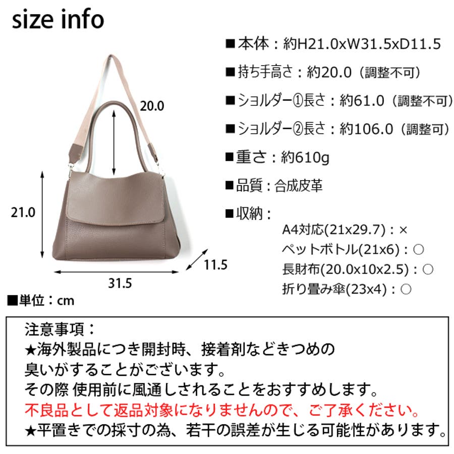 縦:約21cm 幅:約31.5cm マチ:約11.5cm ショルダー①:約61cm(調整不可)ショルダー②:約106cm(調整可)