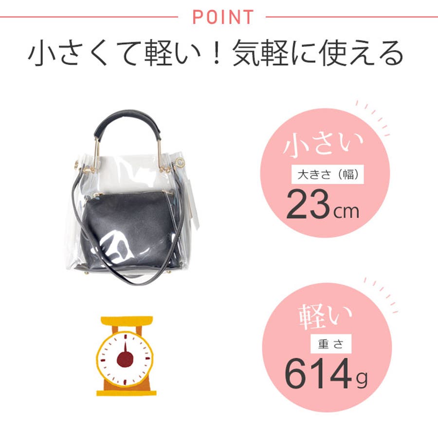 3wayで使い勝手が良いですが、中のポーチは思ったより小さめでした。クリアバッグを外せばシーズンを問わず使えるのでいいですさん (20代 / 女性 )購入アイテム:カラー ブラック - ちょうどいい!