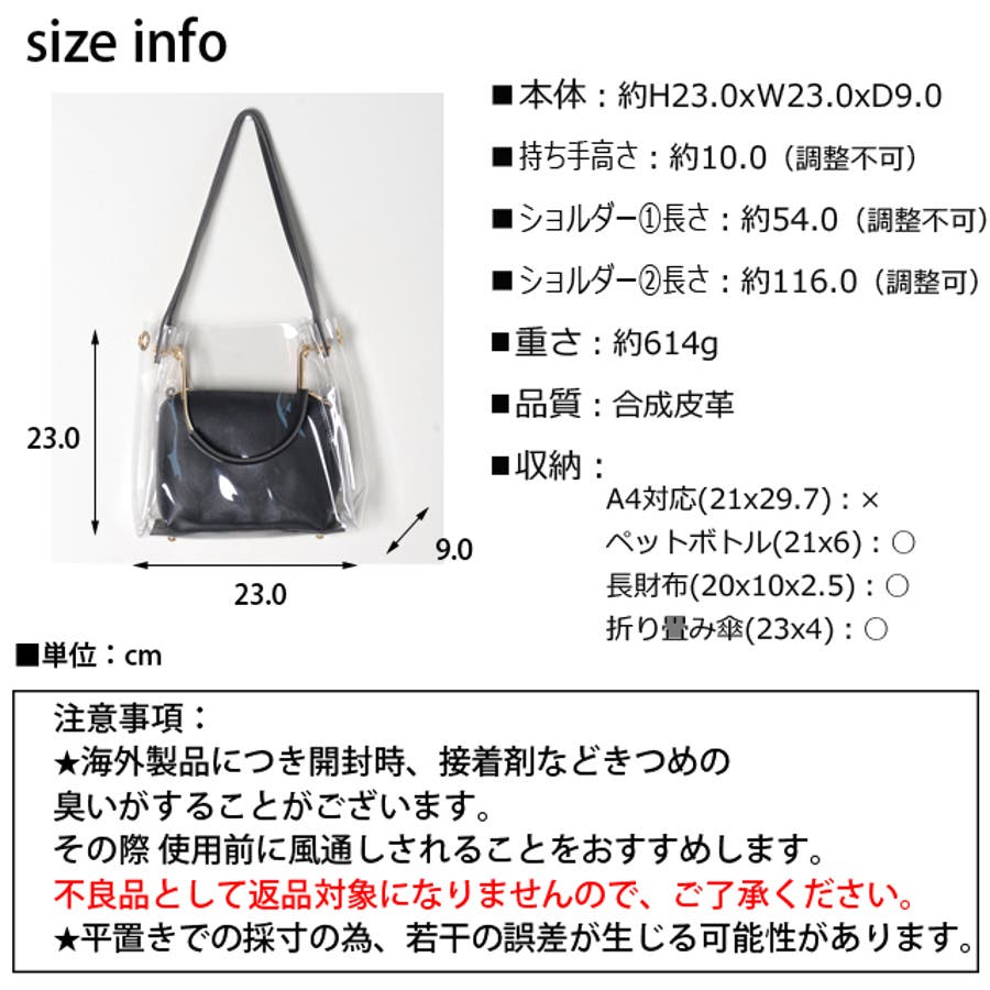 縦:約23cm 幅:約23cm マチ:約9cm 持ち手高さ:約10cm ショルダー①長さ:約54cm(調整不可)ショルダー②長さ:約116cm(調整可)