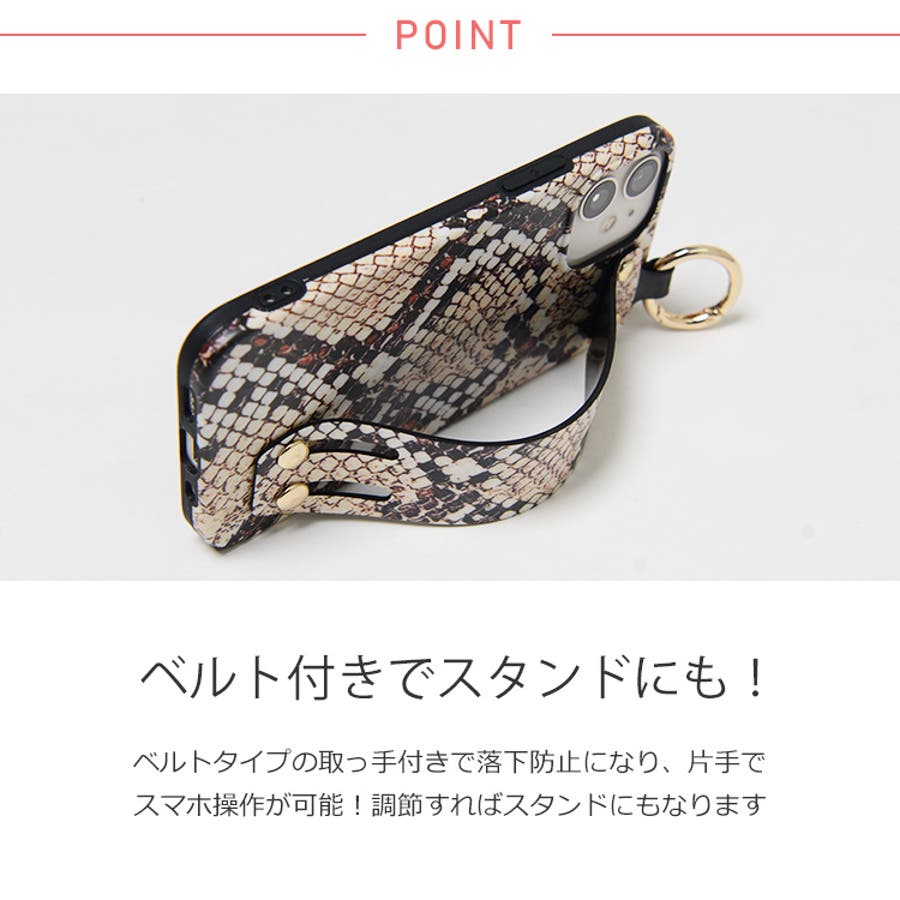 スタンドにもなる落下防止のベルト付きで、携帯を落とす心配がなく安心です♪